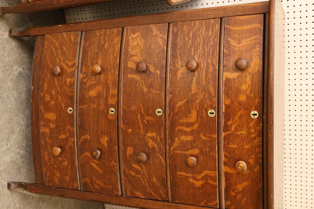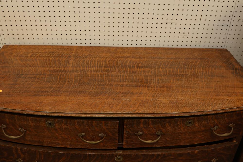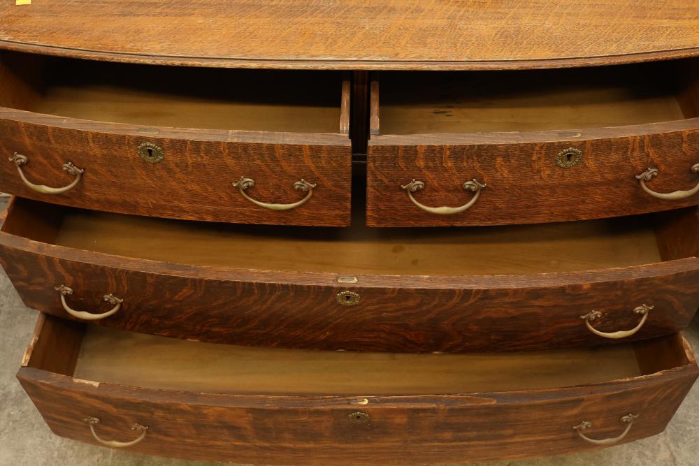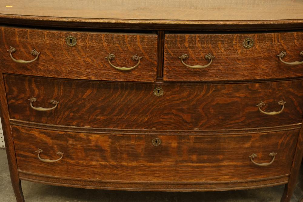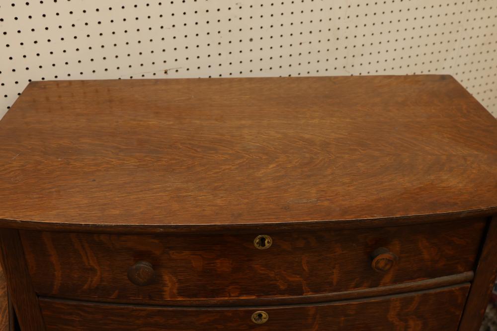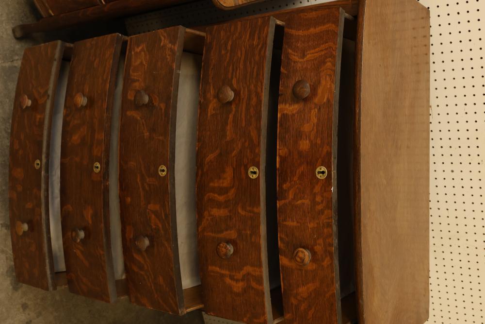 Wooden Bowfront Chest of Drawers and Tall Chest with Brass and Wooden Hardware. Bowfront chest measures 48 in w x 23 in d x 33 in h, features five drawers with curved front and brass hardware pulls. Tall chest measures 33 in w x 19 in d x 46.5 in h, includes five curved drawers with round wooden knobs. Pickup only.