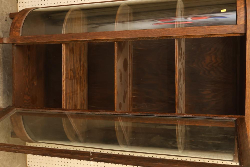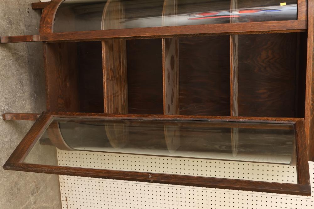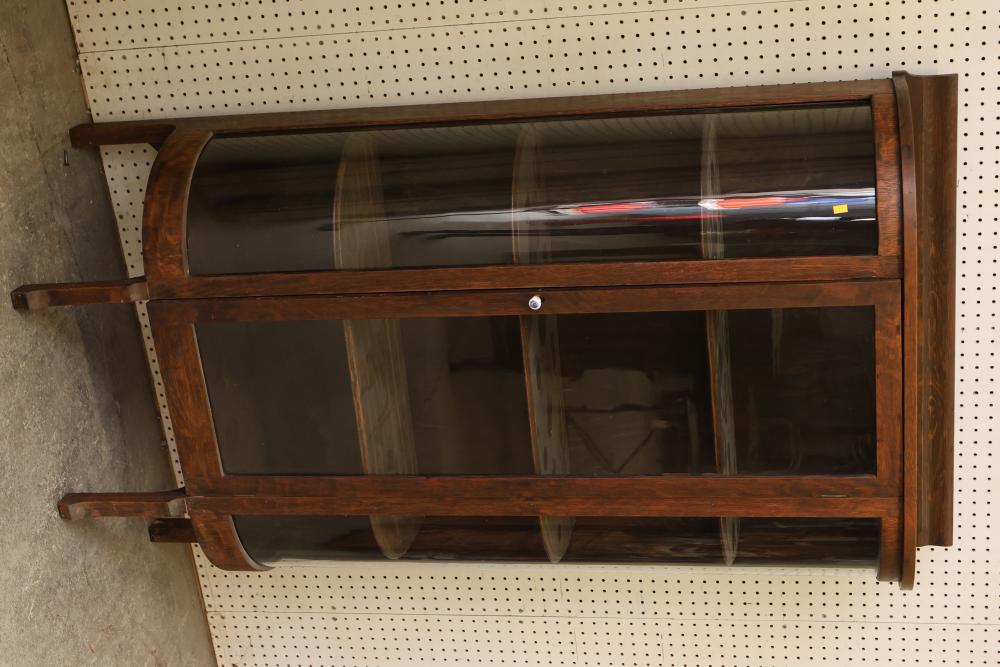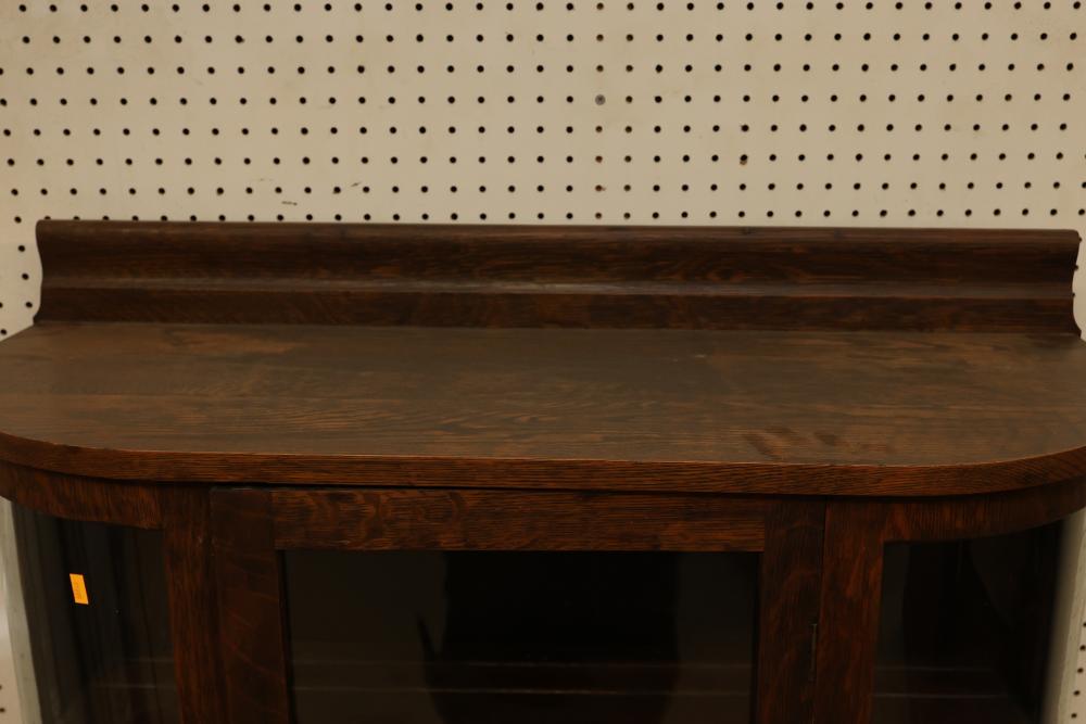 Curved Glass Display Cabinet with Wooden Shelves and Single Door. Features curved glass side panels, a flat glass front door with a metal knob, and four interior wooden shelves. The cabinet measures 34 in W x 13 in D x 61.5 in H and stands on four rectangular legs. The top has a shallow curved backsplash. Pickup only.