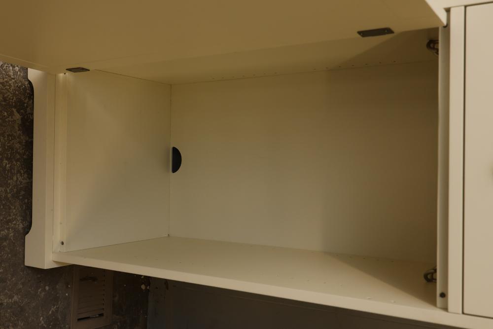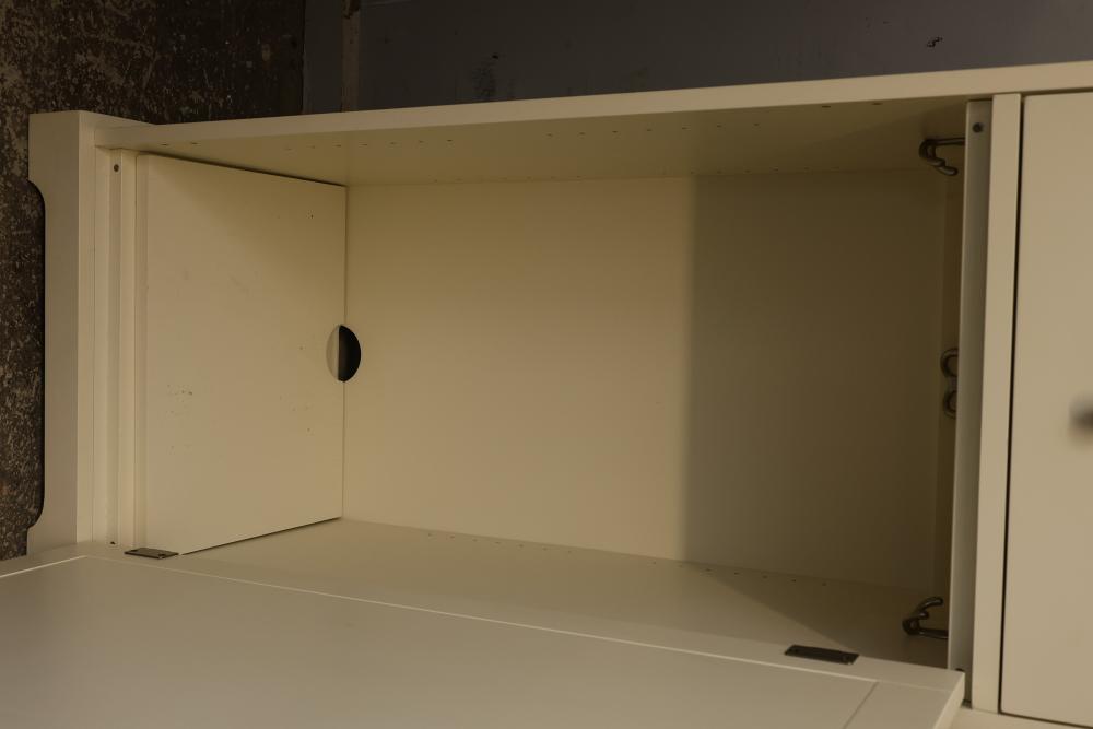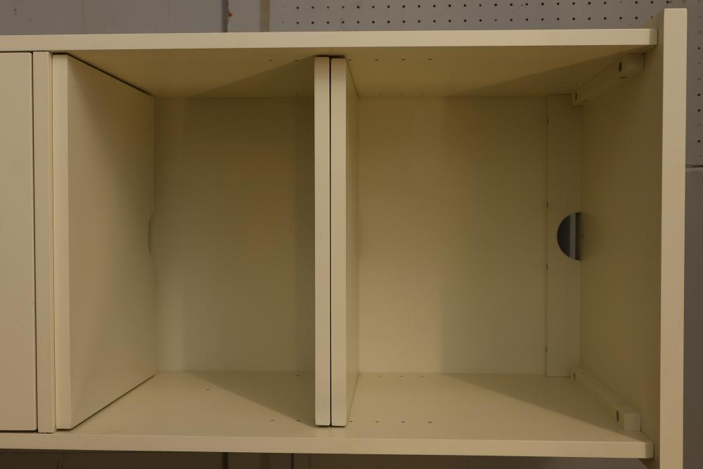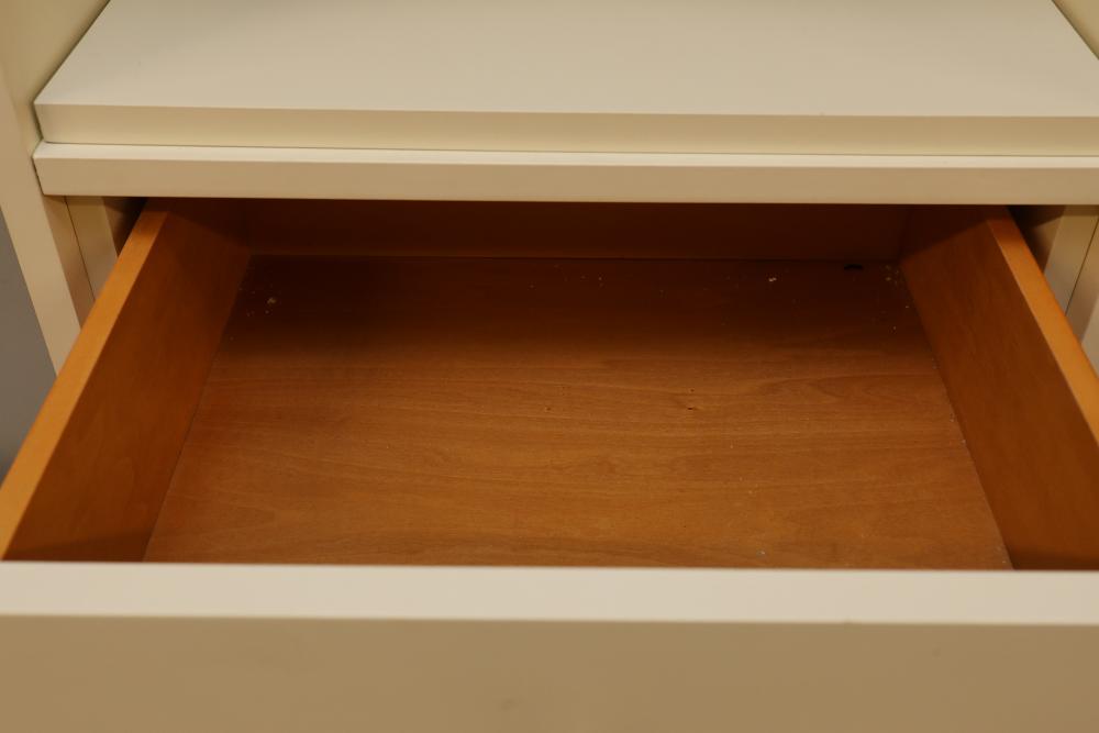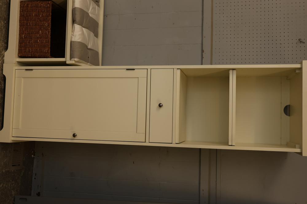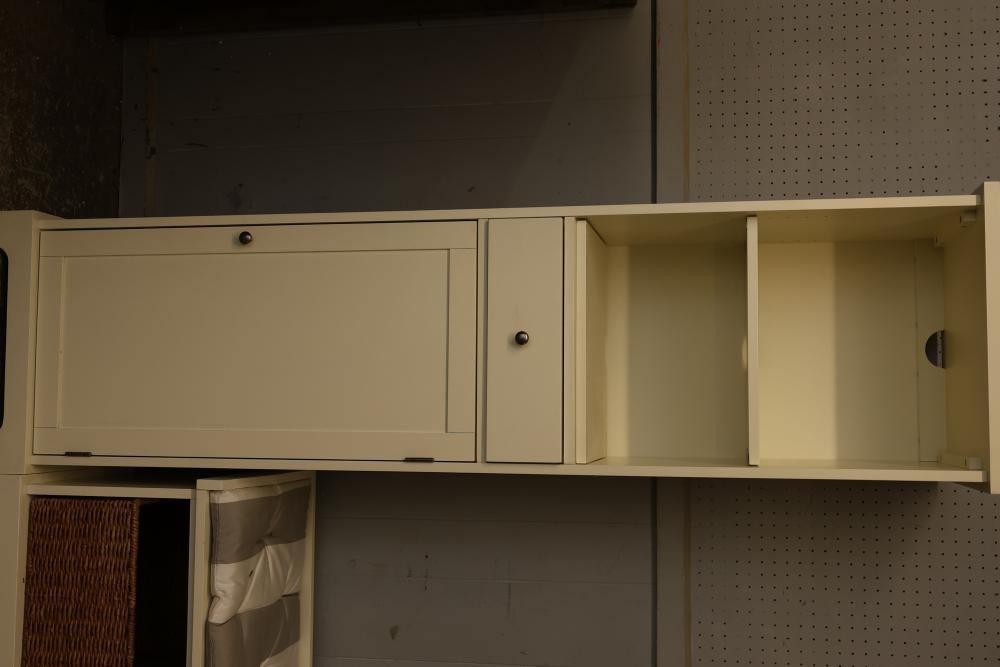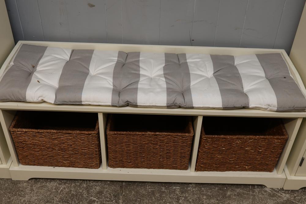 White Wooden Shelving Unit with Storage Bench, Drawers, and Baskets. The unit includes two tall shelves, each with a drawer and lower cabinet. A central bench with a cushion and three wicker baskets provides additional seating and storage. Features sections with adjustable shelving and sliding doors. Pickup only.