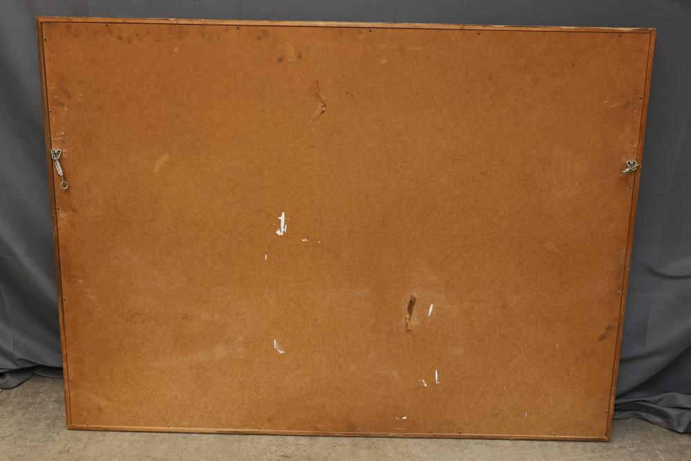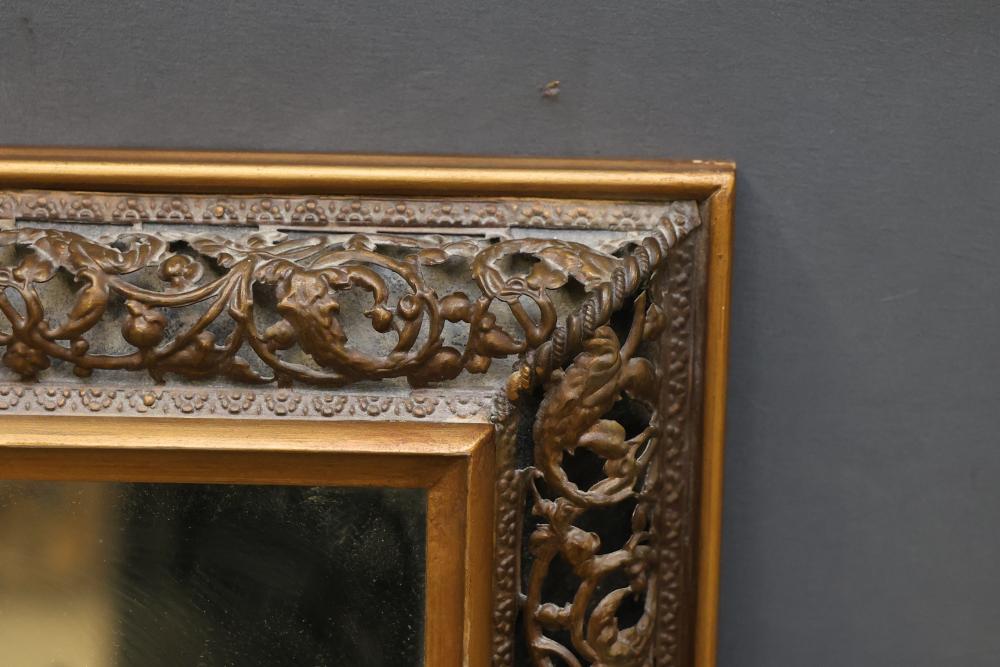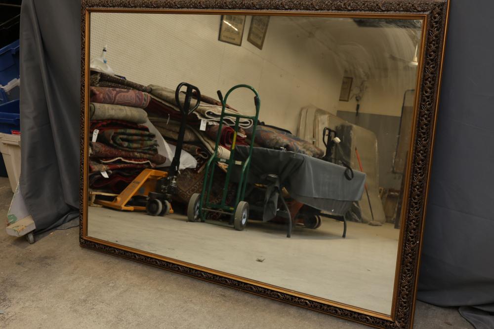 Large ornate wall mirror with a carved gilded wood frame measuring 60 inches by 44.5 inches. The intricately detailed frame features decorative floral and scroll motifs. Designed with a rectangular shape, the mirror has attached hanging hardware on the back for wall mounting. Pickup only.
