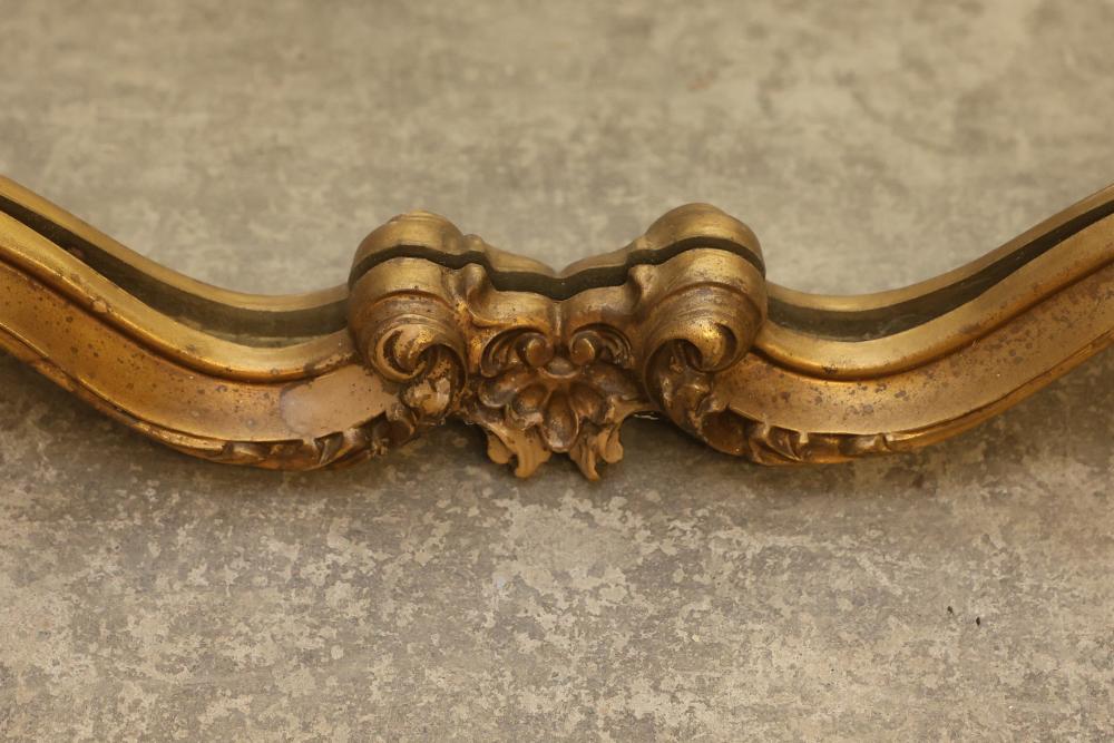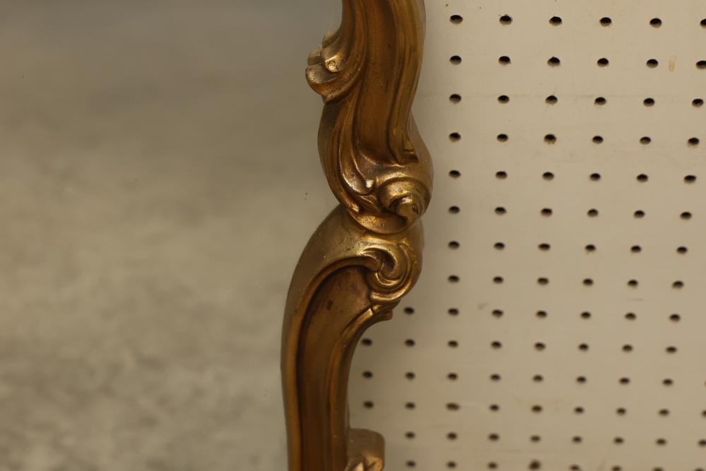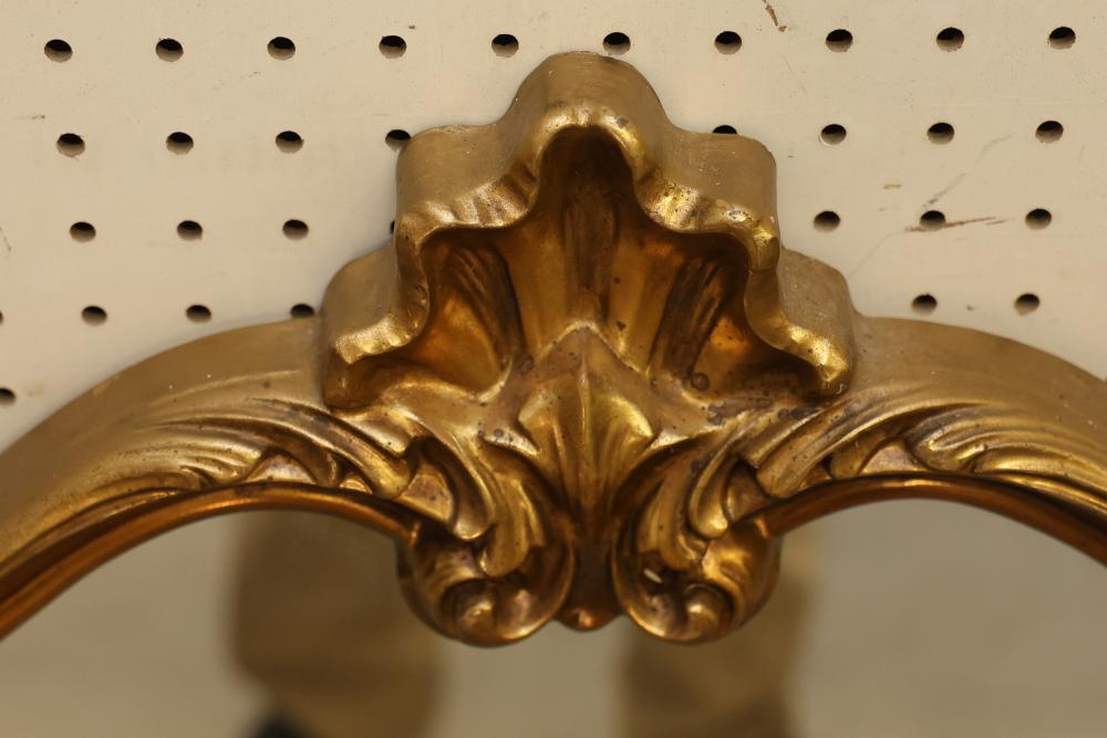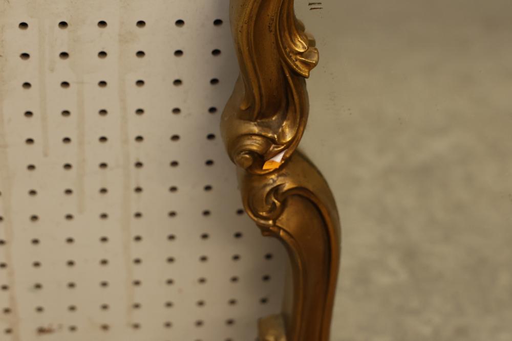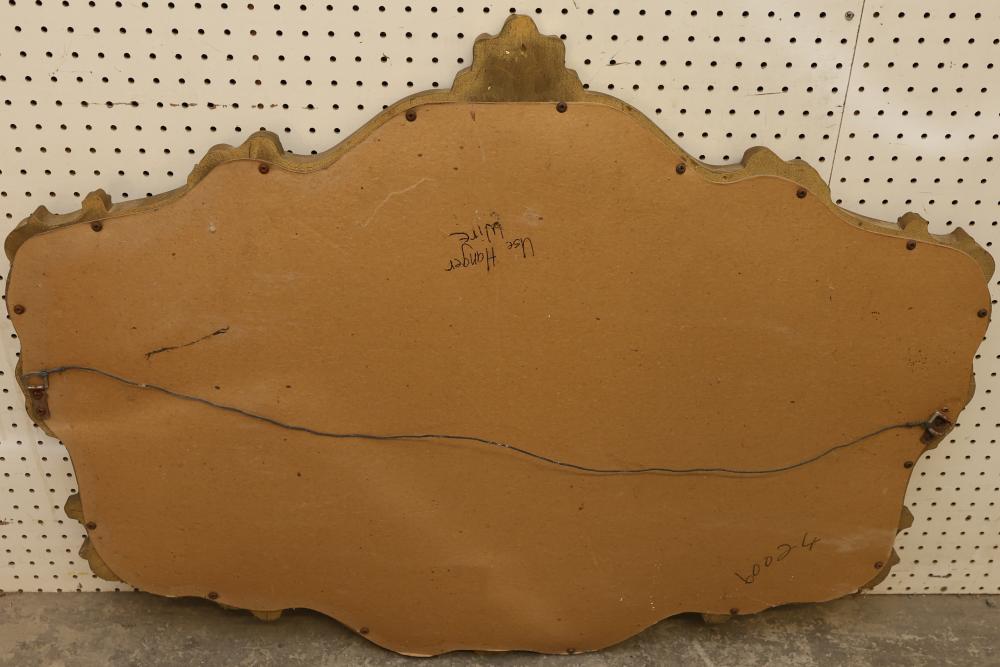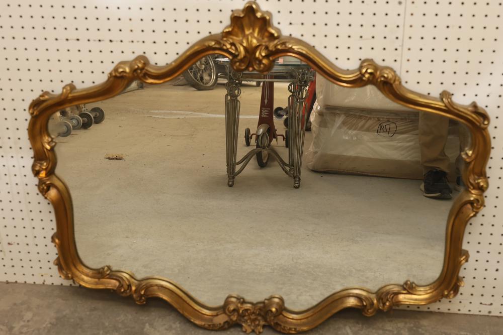 Decorative Gilded Framed Wall Mirror. Features an ornate carved frame with gilded finish and a non-beveled rectangular mirror. The frame exhibits scrollwork, leaf motifs, and a crown-like top accent. Suitable for wall display. Measures approximately 40 inches long and 31 inches high. Pickup only.