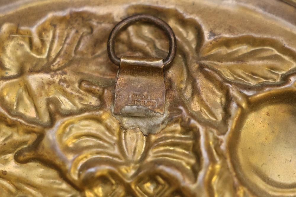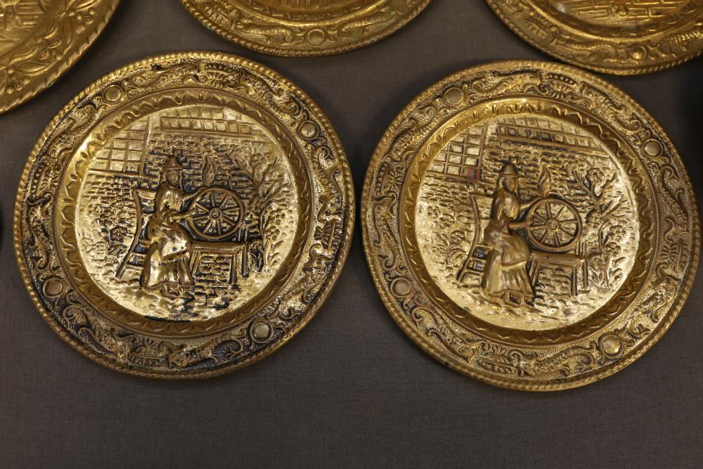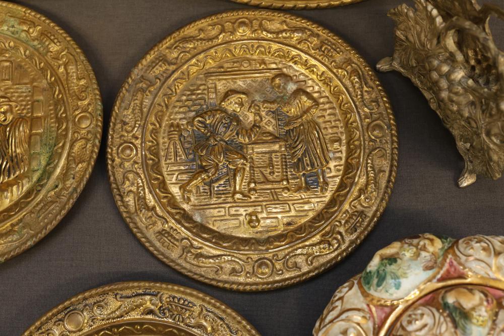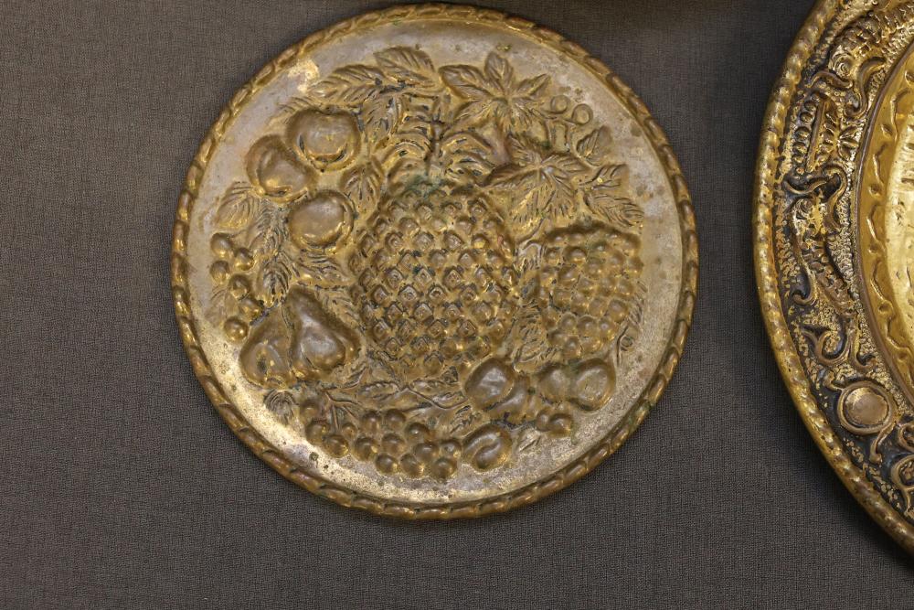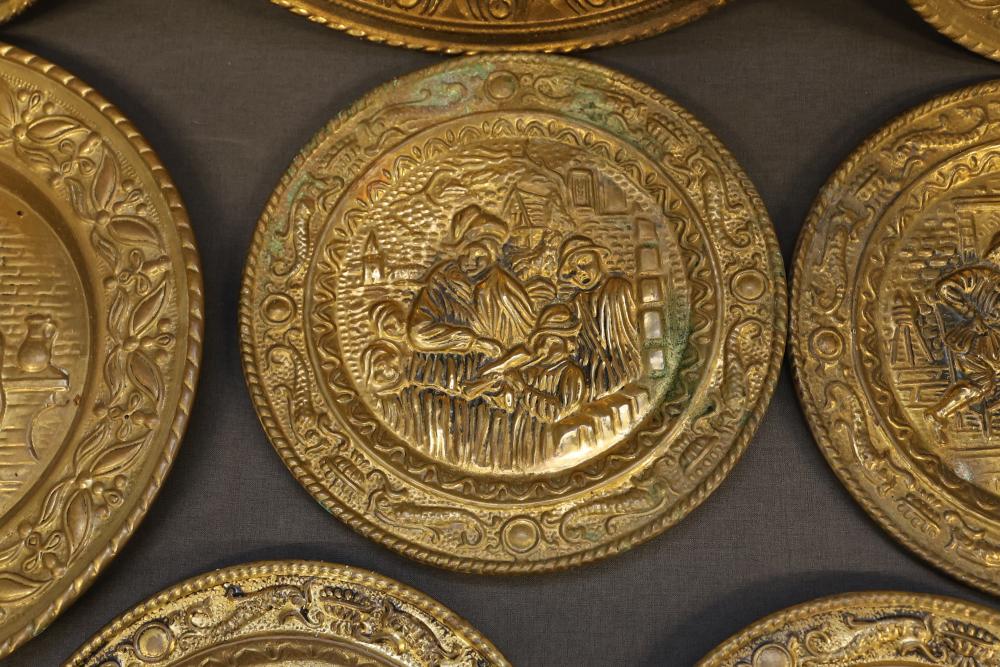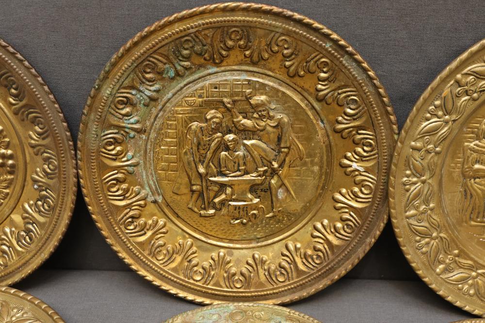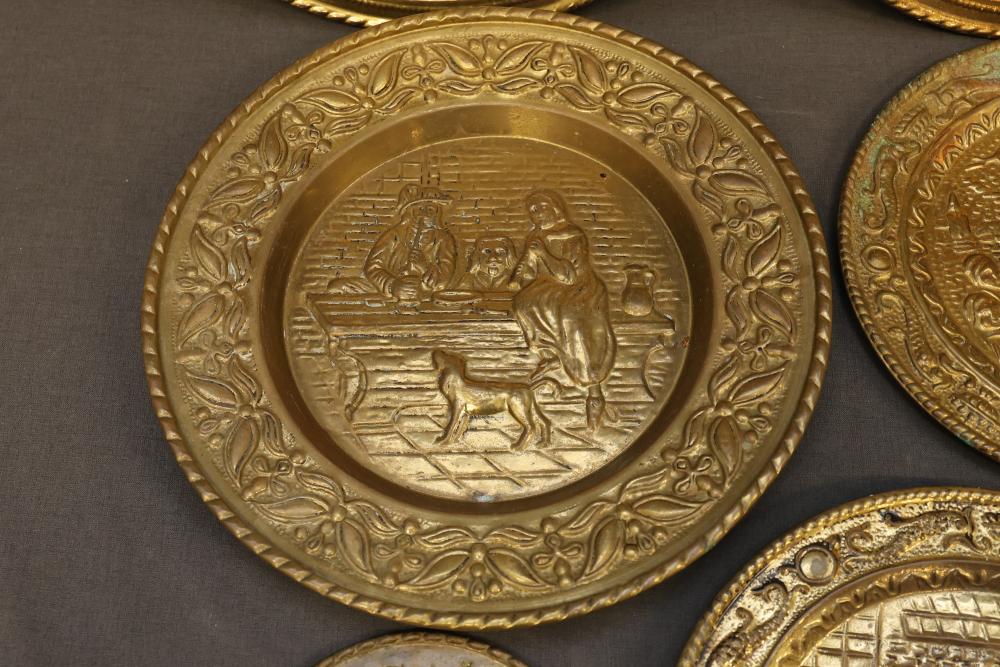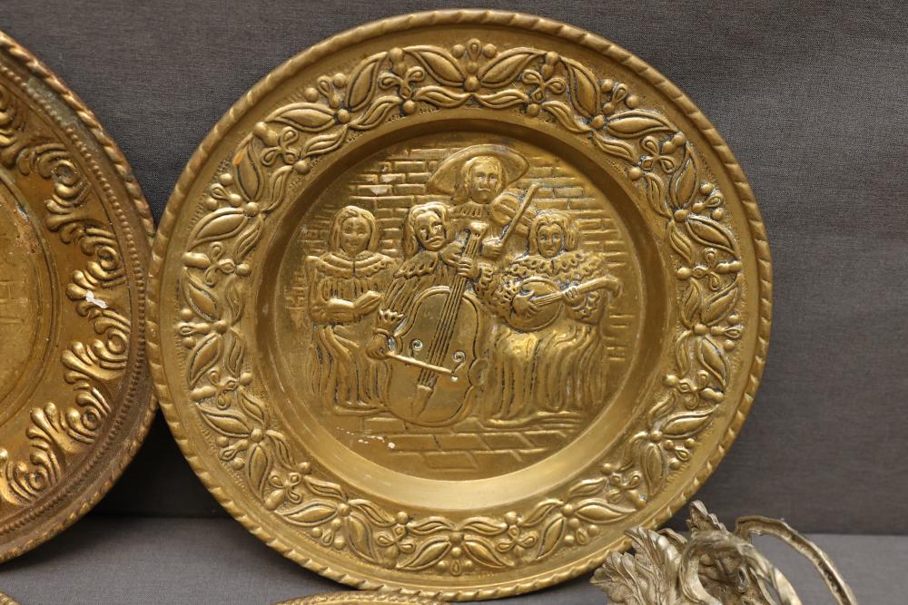 Decorative Brass Plates, Ceramic Lidded Dish with Putti, and Metal Grape-Themed Letter Holder. Set includes embossed brass hanging plates depicting various scenes and motifs, a ceramic lidded dish marked 'Bassano,' featuring painted floral and figure designs accentuated with a putti, and a cast metal letter holder with grape cluster and leaf designs, marked 'Godinger Silver.' Pickup only.