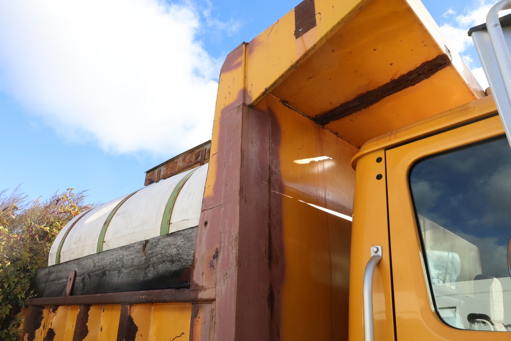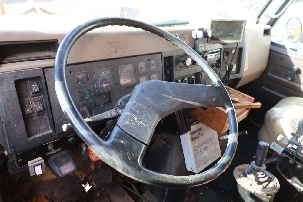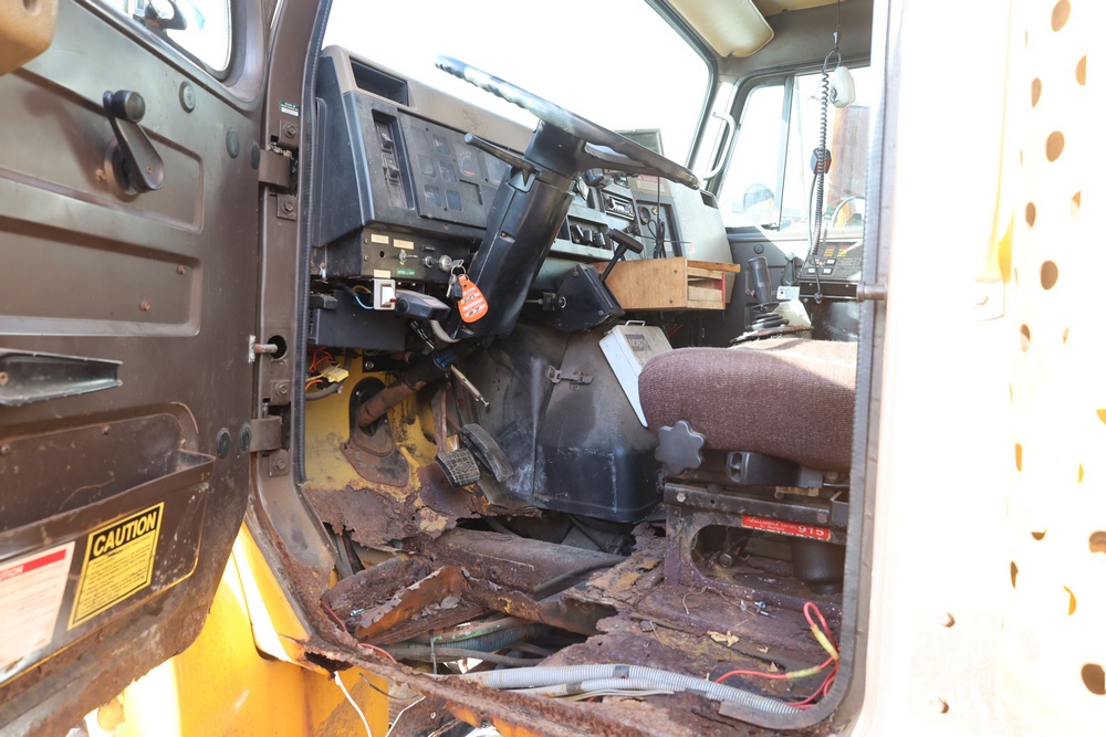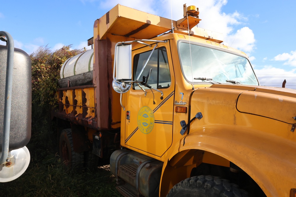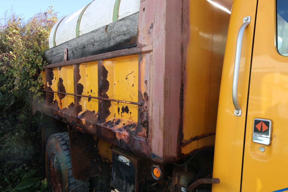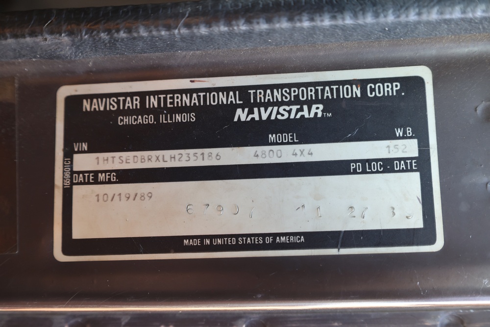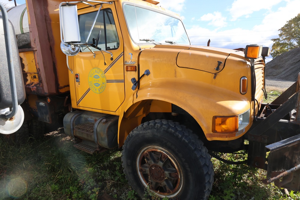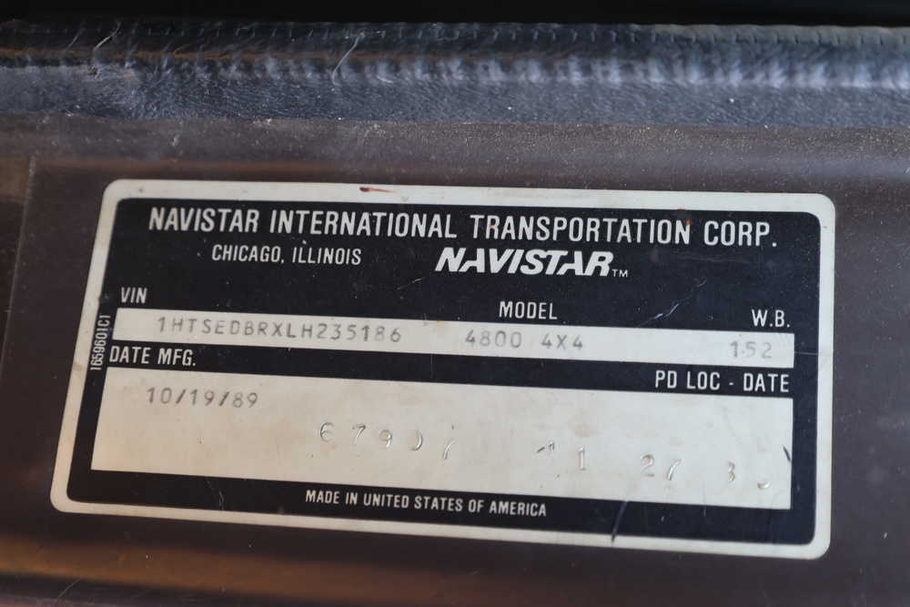 1990 International 4800 4x4 dump truck with automatic transmission. VIN: 1HTSEDBRXLH235186. Odometer reading: 36,295. Exterior: Yellow cab and dump body with dual rear wheels, front plow mount, rear liquid tank, and amber roof light bar. Interior: Brown driver's seat, Panasonic radio, auxiliary switchgear. Tire configuration: Dual rear wheels. Additional equipment includes dump bed, front plow mount. Cab rotted through, suitable for parts. Runs, must be towed. Bill of Sale Only and key available.