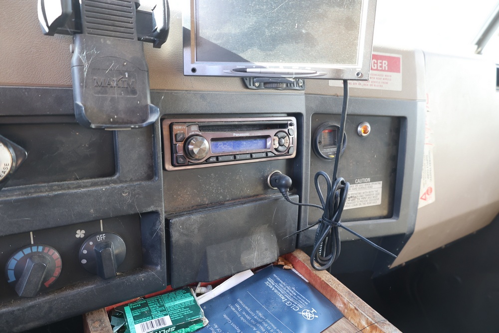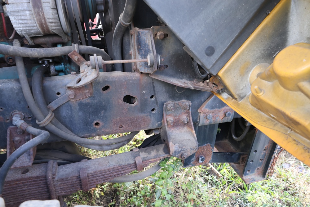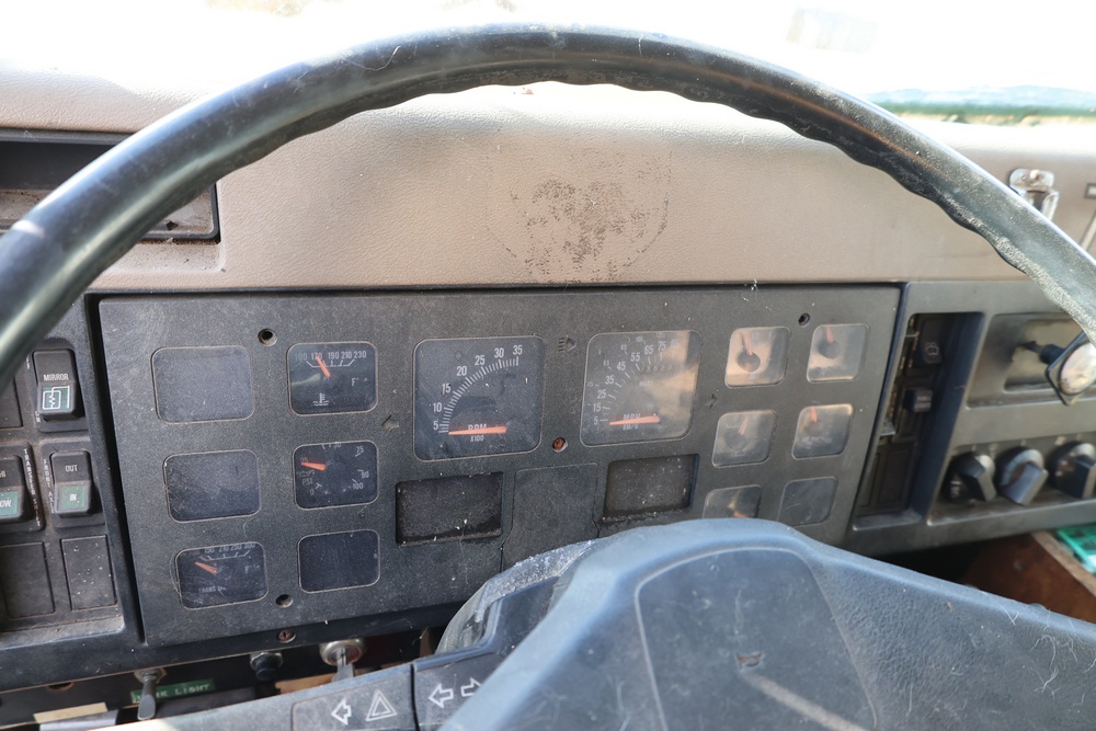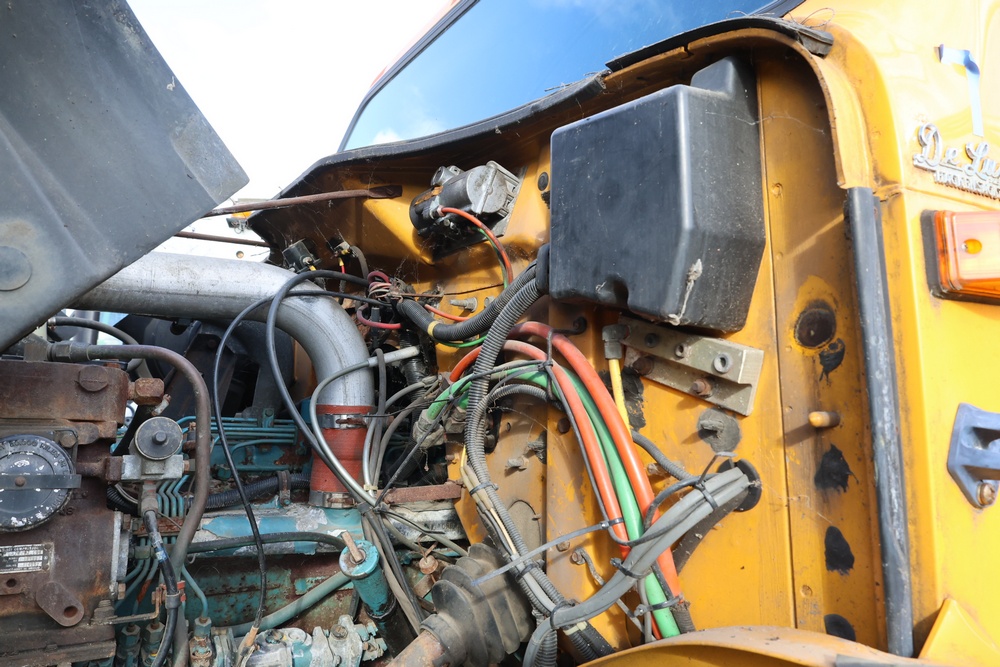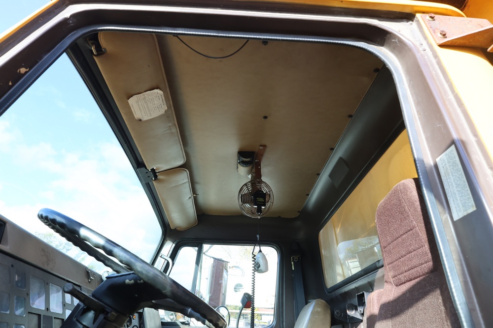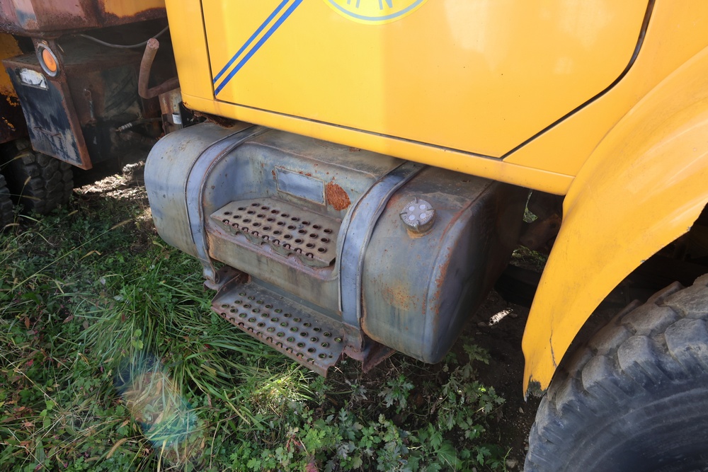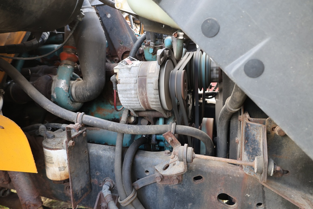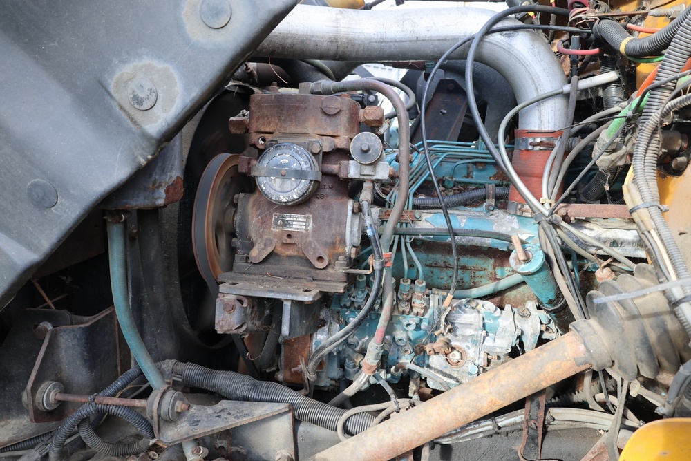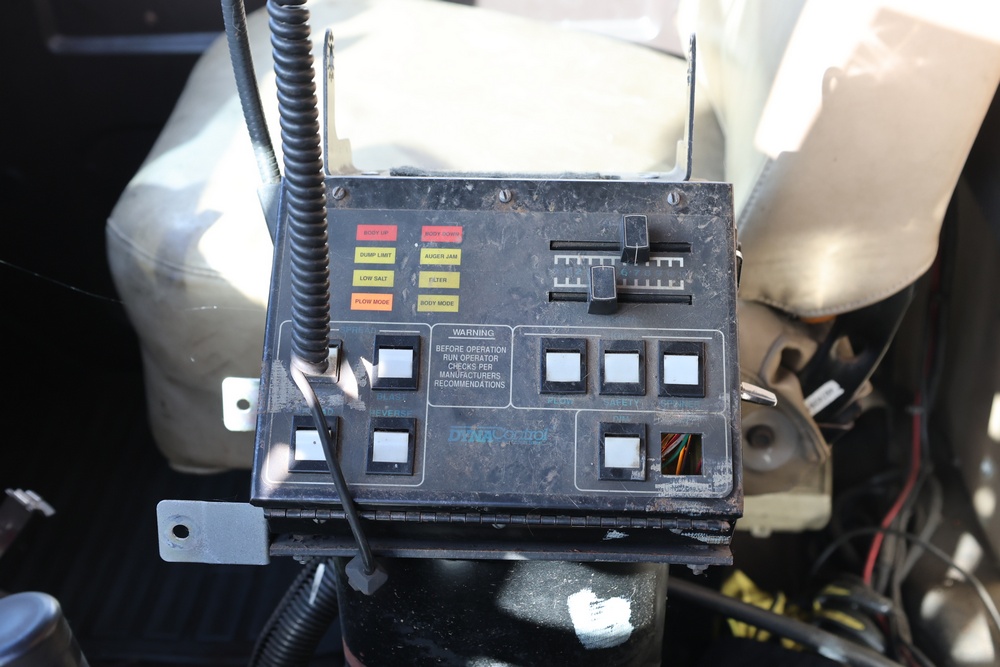 1990 International 4800 4x4 dump truck with automatic transmission. VIN: 1HTSEDBRXLH235186. Odometer reading: 36,295. Exterior: Yellow cab and dump body with dual rear wheels, front plow mount, rear liquid tank, and amber roof light bar. Interior: Brown driver's seat, Panasonic radio, auxiliary switchgear. Tire configuration: Dual rear wheels. Additional equipment includes dump bed, front plow mount. Cab rotted through, suitable for parts. Runs, must be towed. Bill of Sale Only and key available.