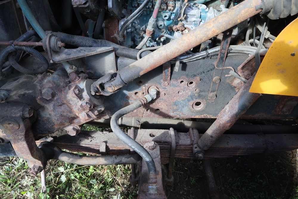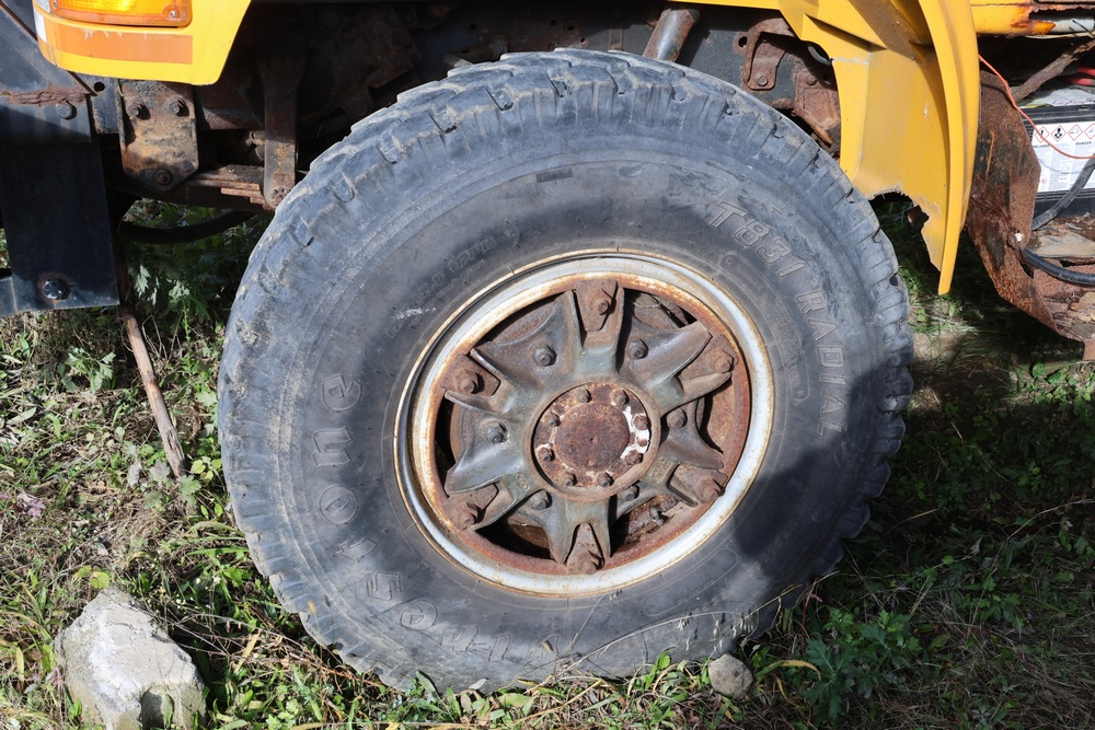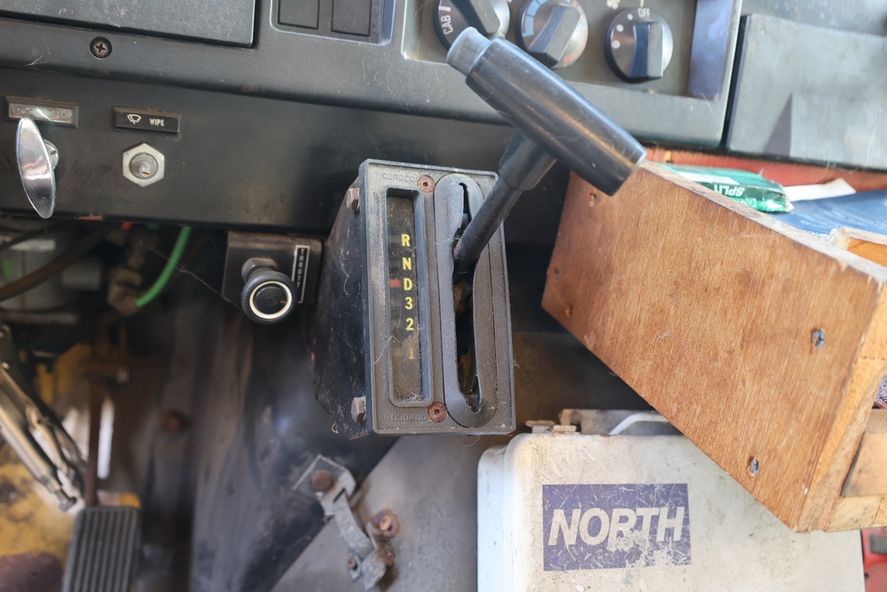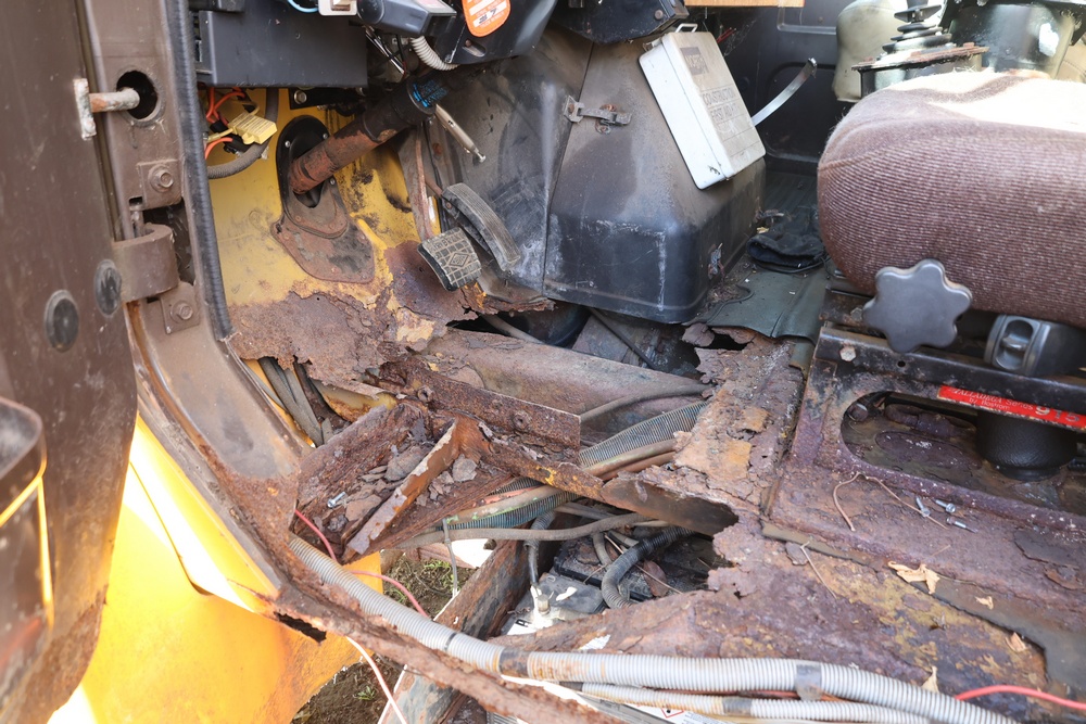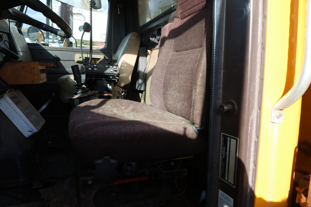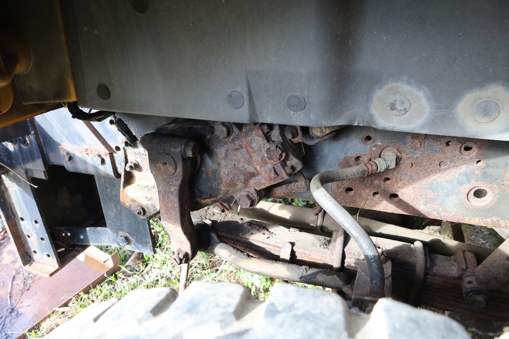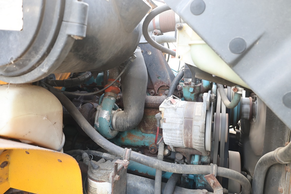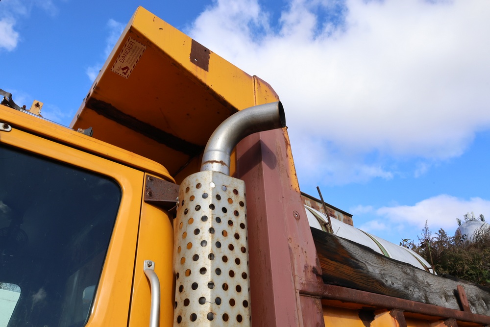 1990 International 4800 4x4 dump truck with automatic transmission. VIN: 1HTSEDBRXLH235186. Odometer reading: 36,295. Exterior: Yellow cab and dump body with dual rear wheels, front plow mount, rear liquid tank, and amber roof light bar. Interior: Brown driver's seat, Panasonic radio, auxiliary switchgear. Tire configuration: Dual rear wheels. Additional equipment includes dump bed, front plow mount. Cab rotted through, suitable for parts. Runs, must be towed. Bill of Sale Only and key available.