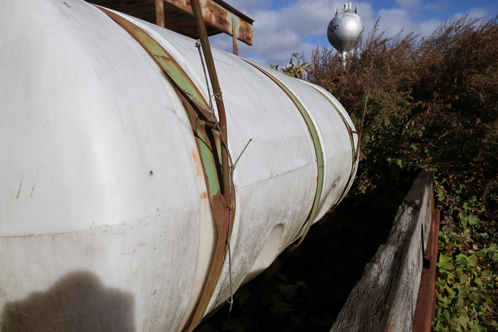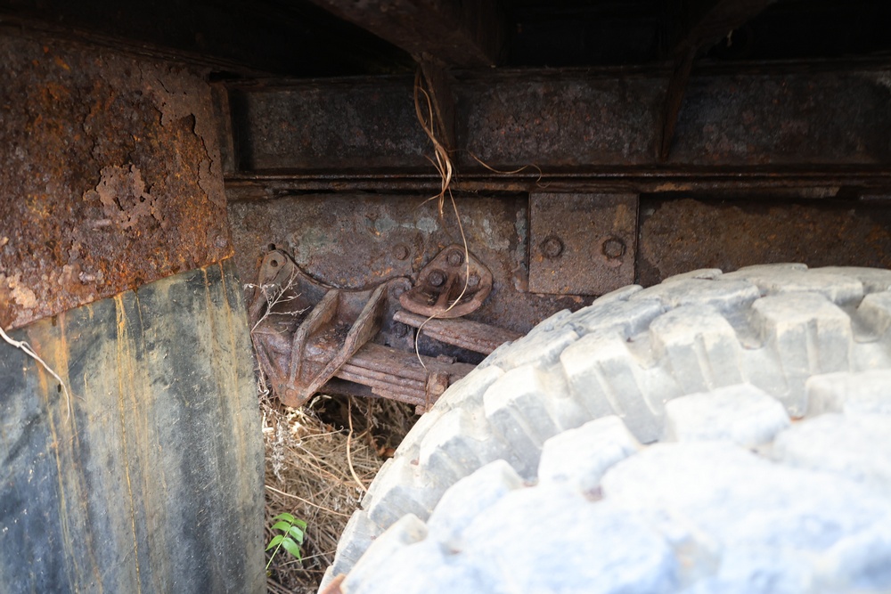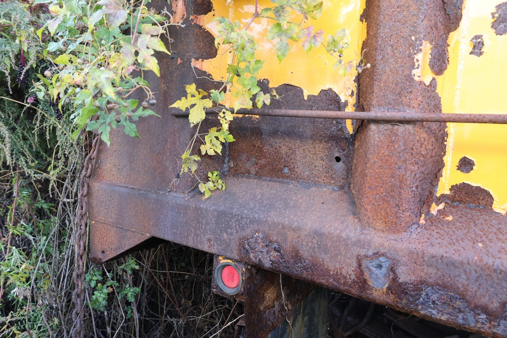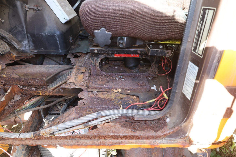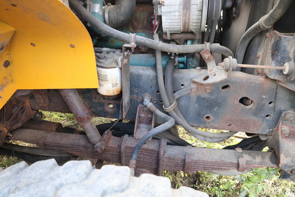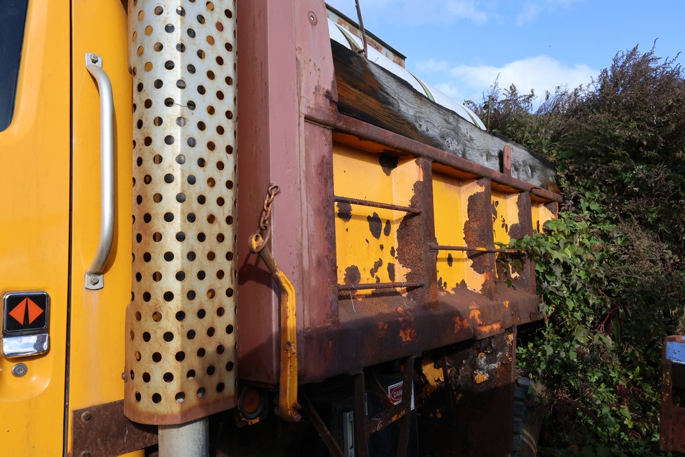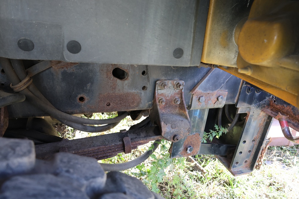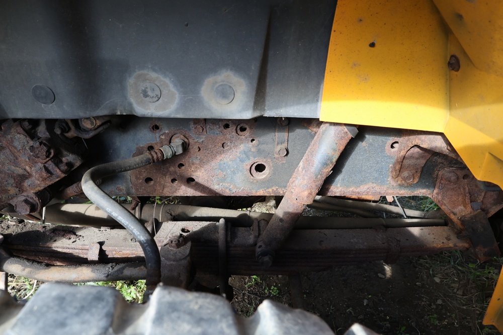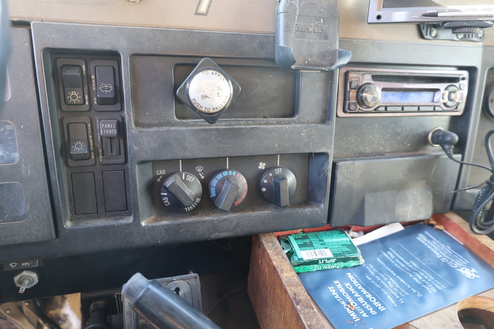 1990 International 4800 4x4 dump truck with automatic transmission. VIN: 1HTSEDBRXLH235186. Odometer reading: 36,295. Exterior: Yellow cab and dump body with dual rear wheels, front plow mount, rear liquid tank, and amber roof light bar. Interior: Brown driver's seat, Panasonic radio, auxiliary switchgear. Tire configuration: Dual rear wheels. Additional equipment includes dump bed, front plow mount. Cab rotted through, suitable for parts. Runs, must be towed. Bill of Sale Only and key available.