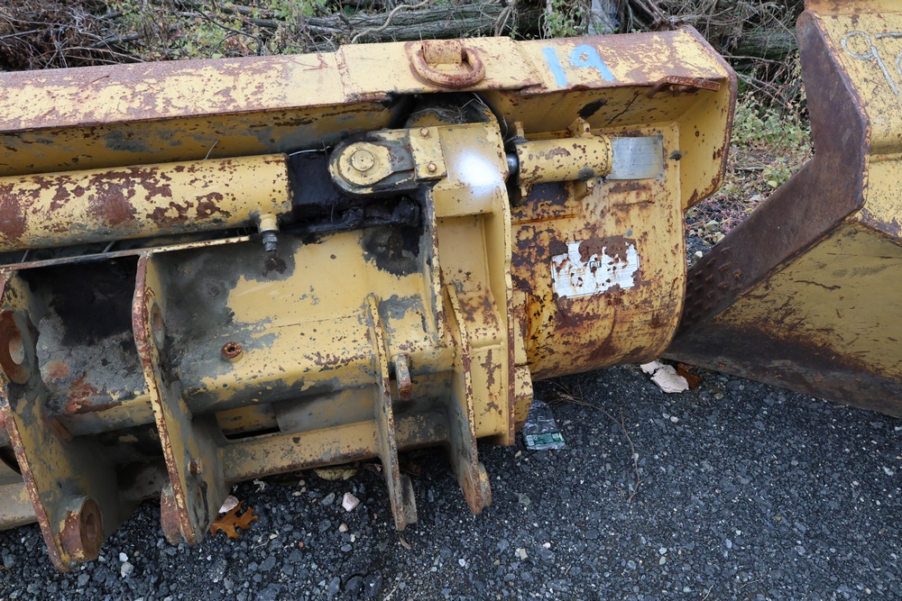 Caterpillar side dump bucket, model 6D-6939. Identification tag lists part number 8A3550 with reference numbers 4F3633 and 4K3767. The bucket features integrated hydraulic cylinders and quick-attach style linkage, designed for loader applications requiring side discharge capability.