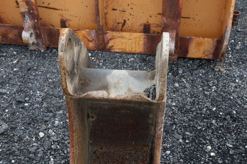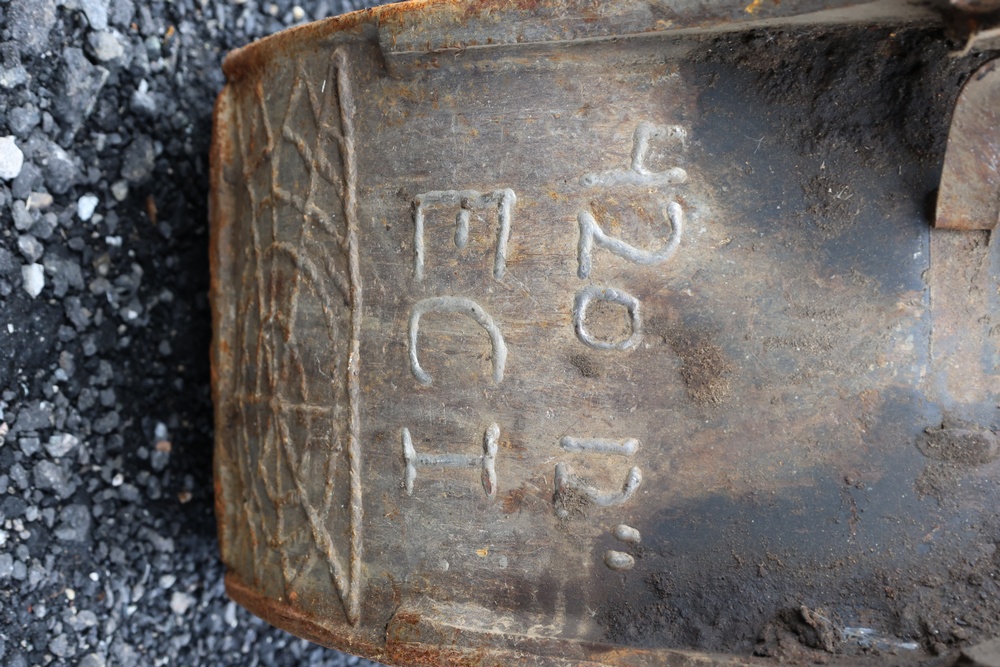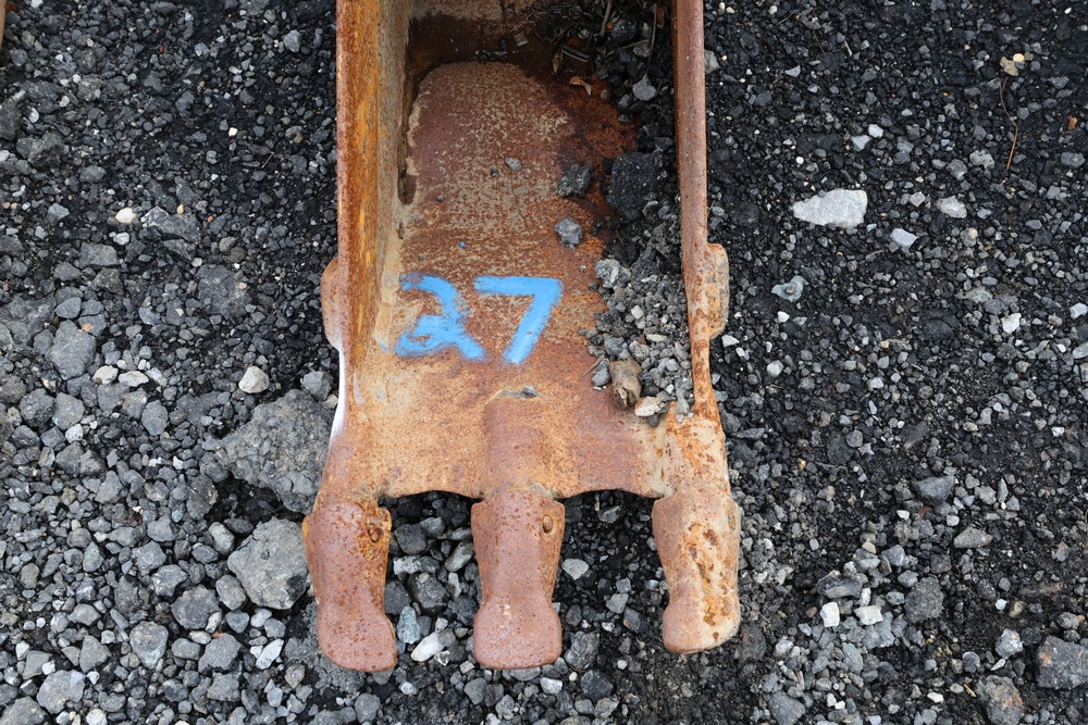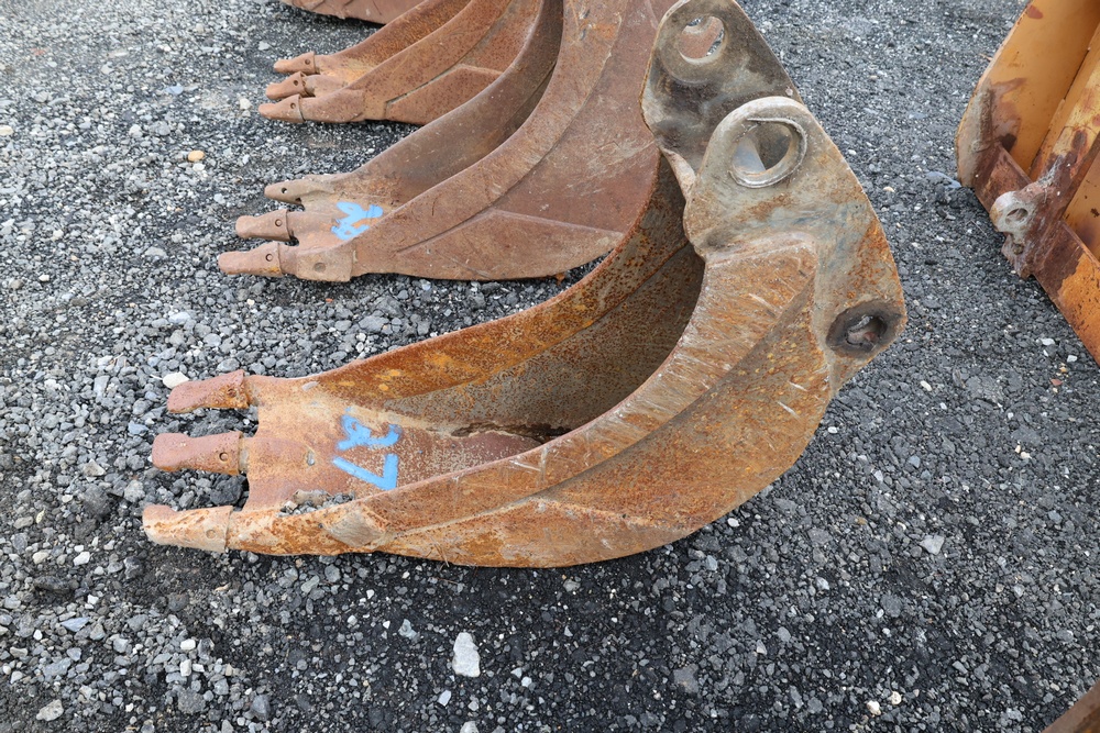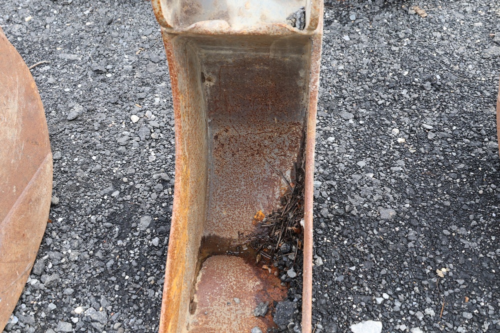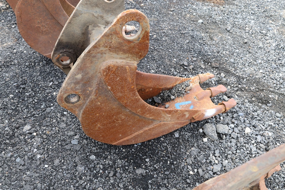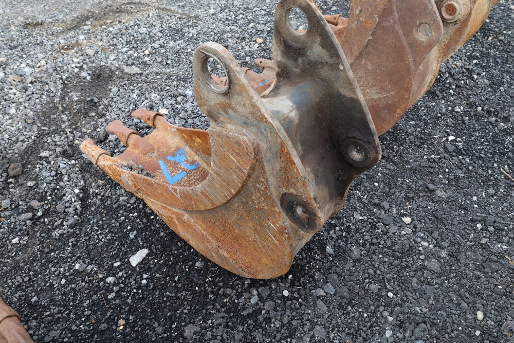 Narrow HDP trenching bucket measuring approximately 12 inches wide, designed for detailed excavation and utility trench work. It features two replaceable teeth and a curved shell for efficient digging and clean trench formation. For use with CAT 416 or older 420 backhoe.