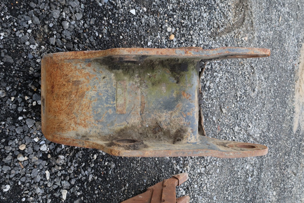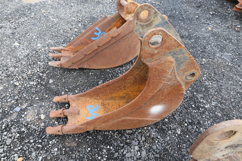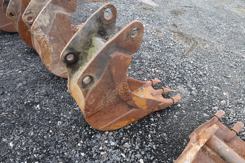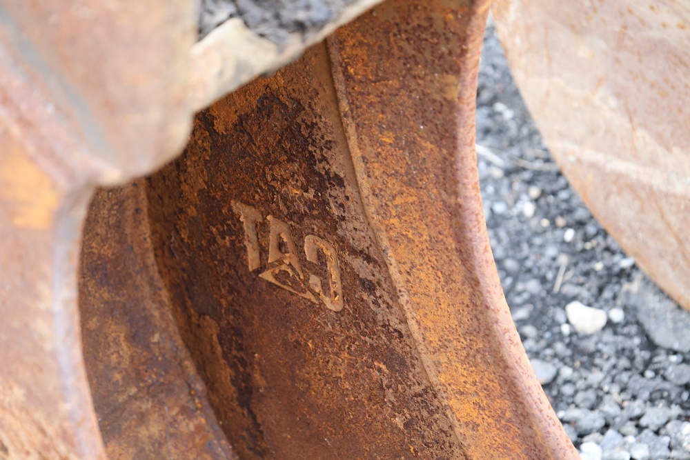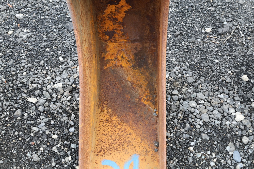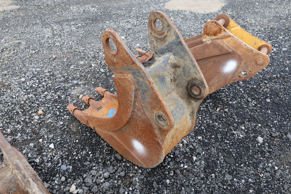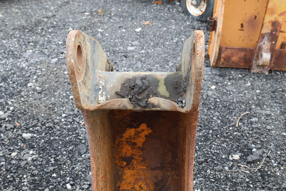 Cat steel backhoe bucket with three replaceable teeth. For use with CAT 416 or older 420 backhoe.