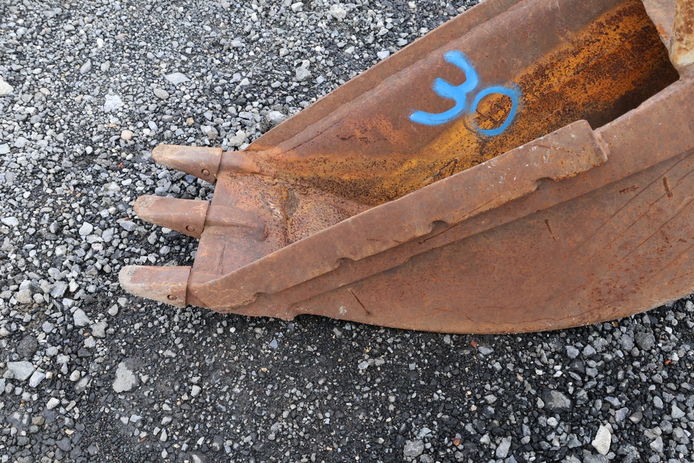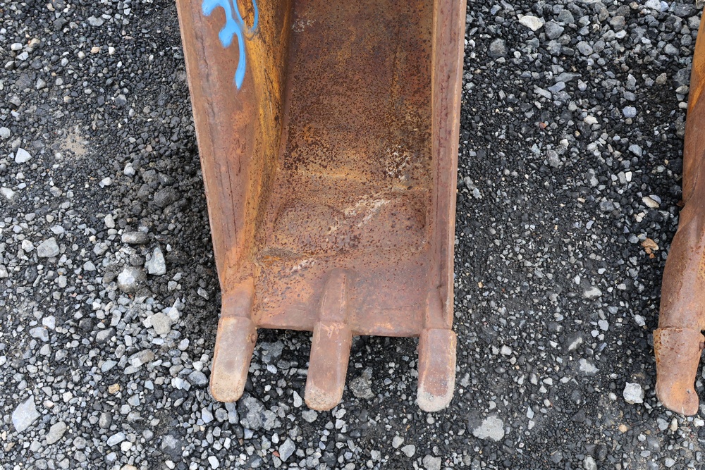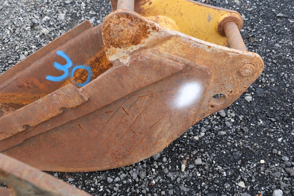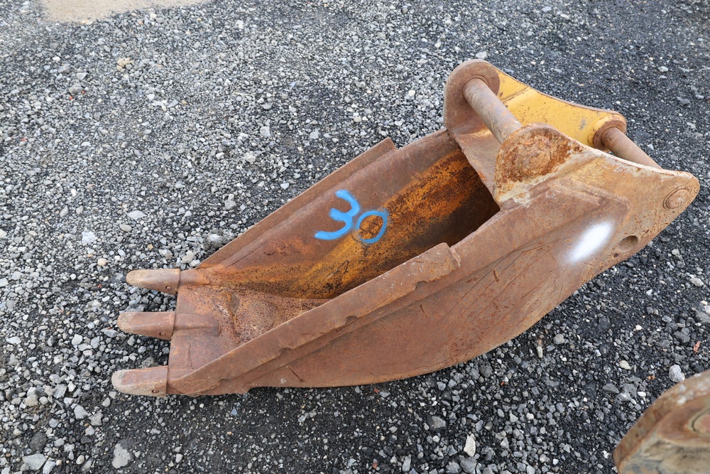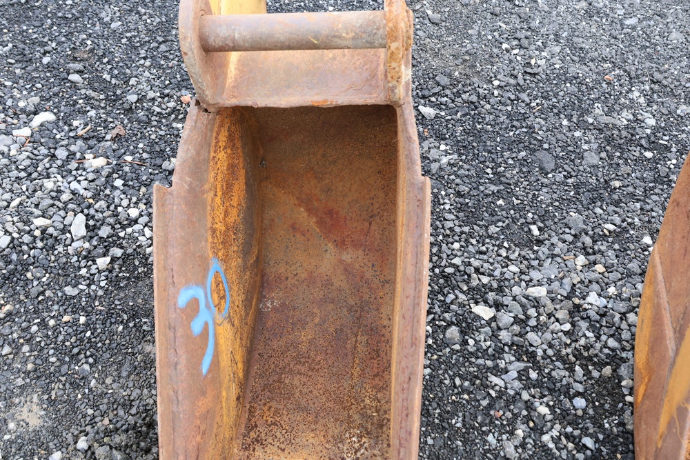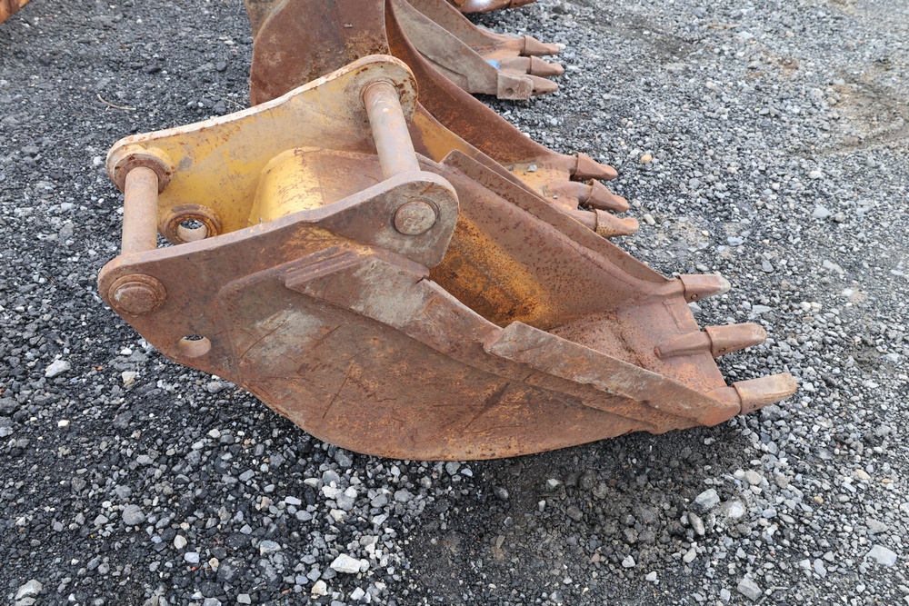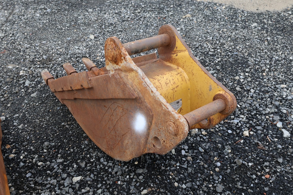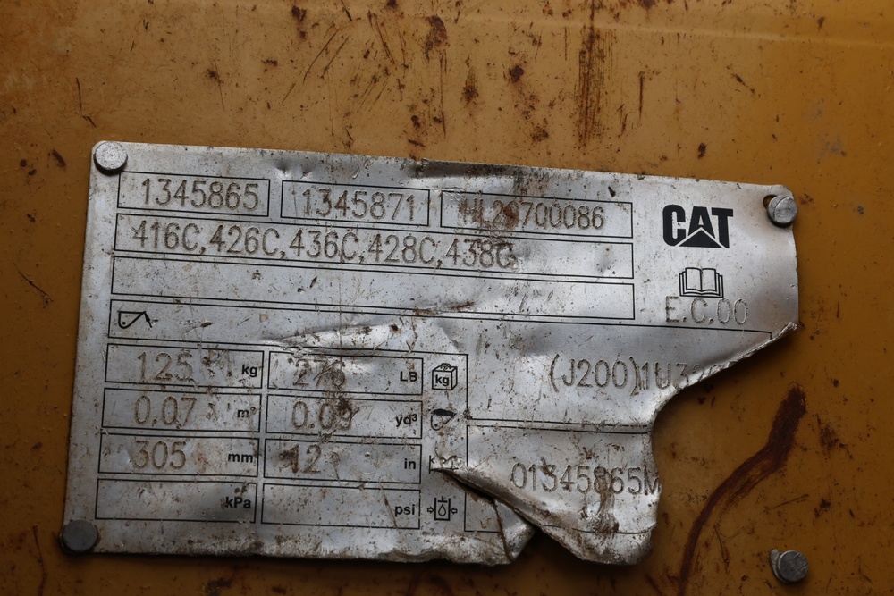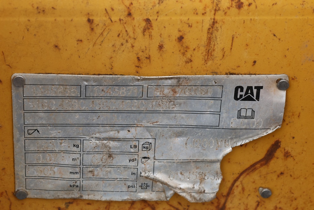 Trenching bucket constructed of steel, featuring a narrow width and an angled profile suited for utility and cable installation work. The front cutting edge is fitted with three teeth, and the top mounting structure utilizes a pin-on style bracket complete with connecting pins. The attached identification plate specifies compatibility with CAT 416C, 426C, 436C, 428C, and 438C model machines, indicating a width of 305 mm or 12 inches and a capacity of 0.07 or 0.09 yd