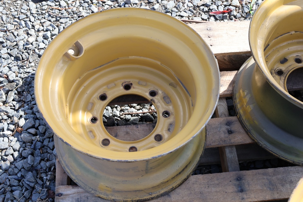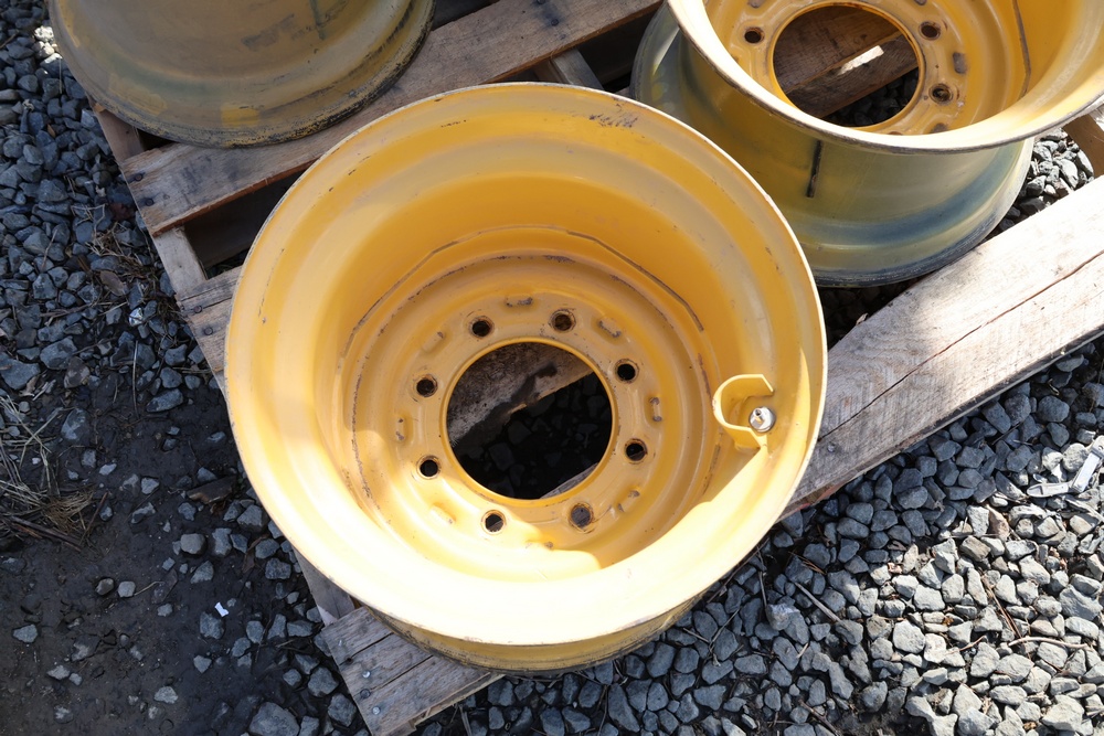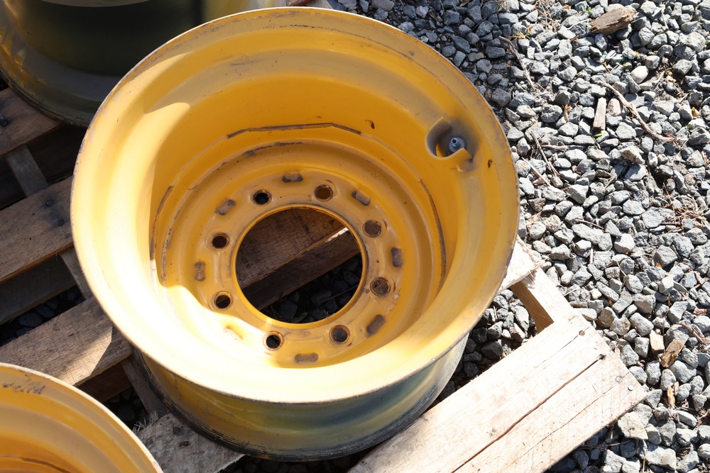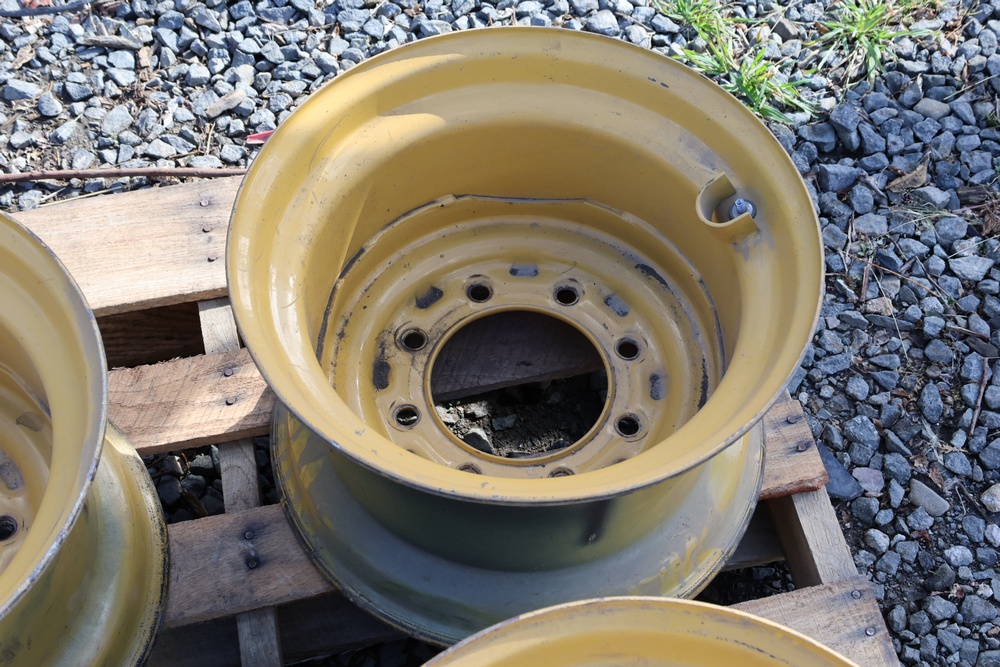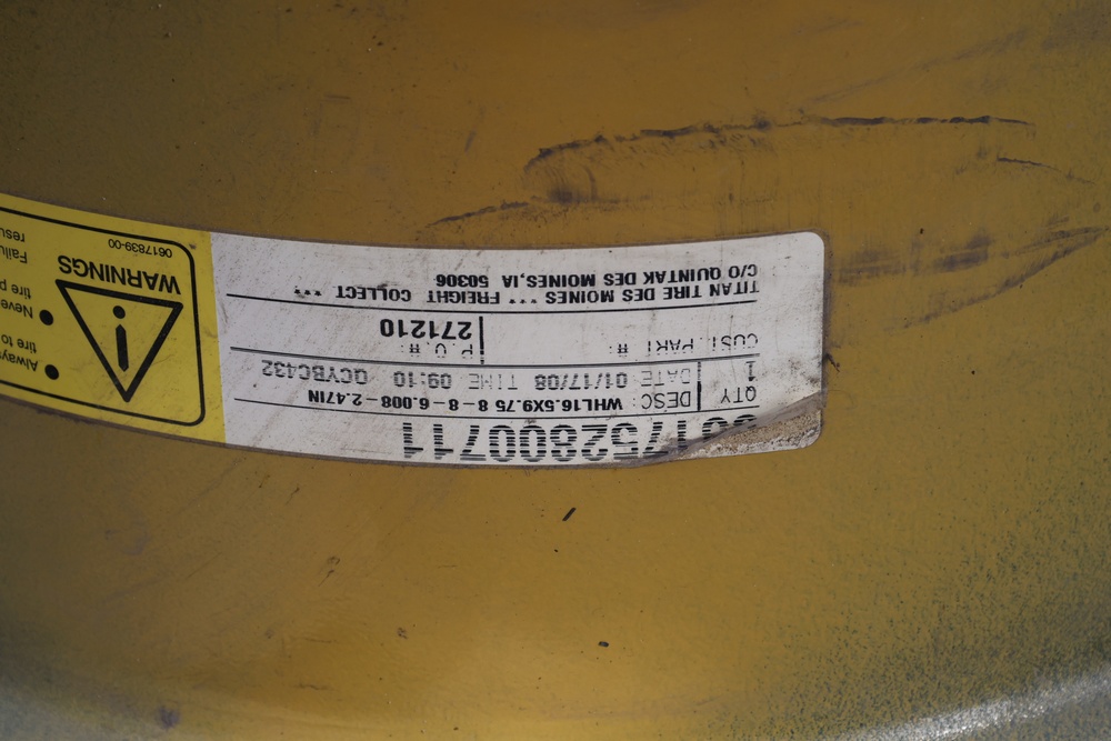 Four Cat skidsteer eight lug rims. An attached identification decal specifies a wheel size of 16.5 x 9.75 with a 6.00B backspacing and includes the part number 271210.