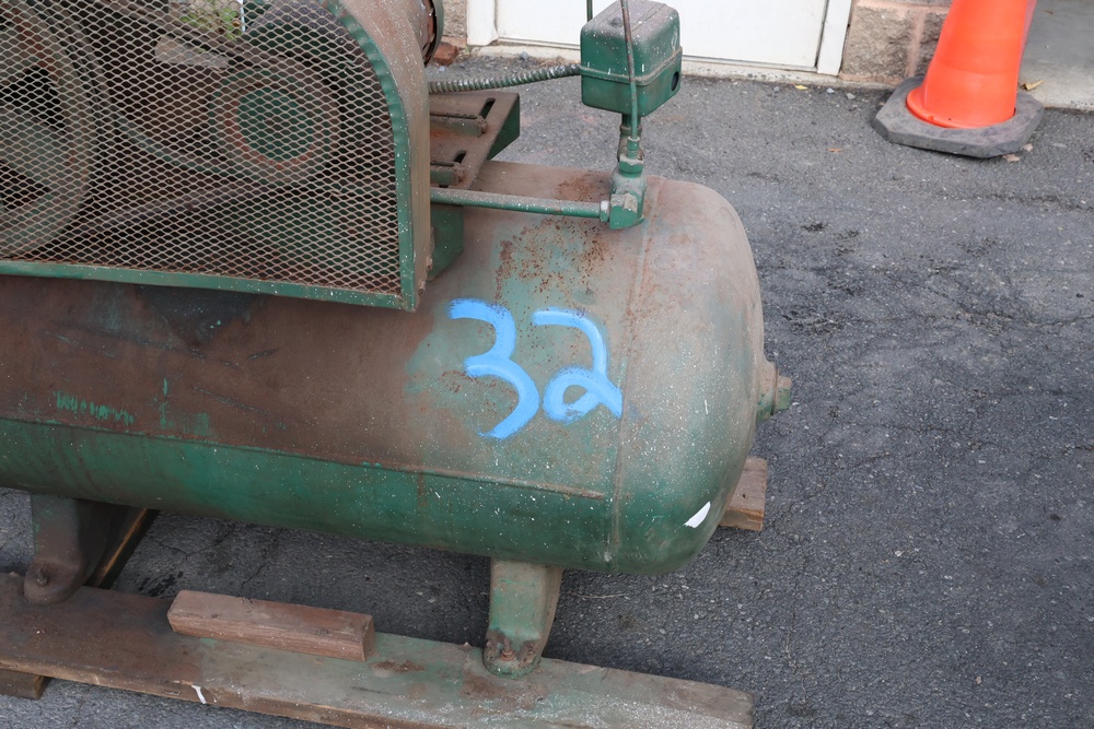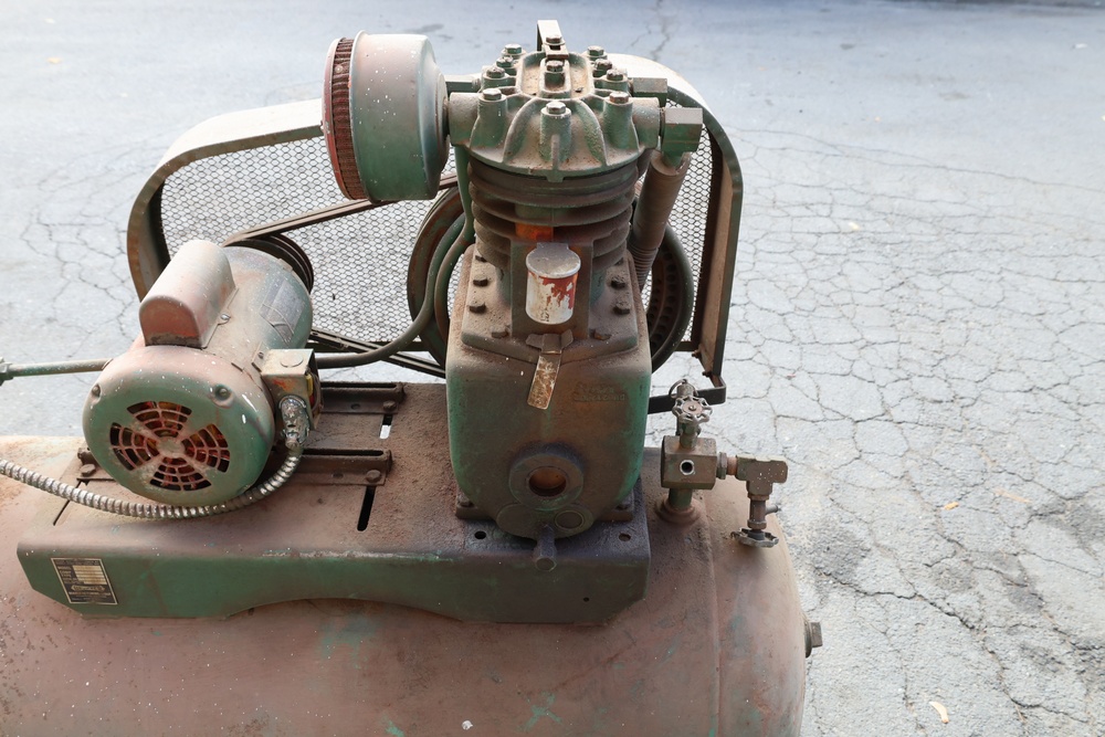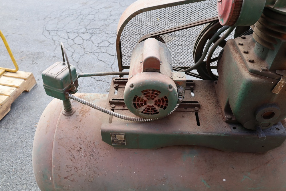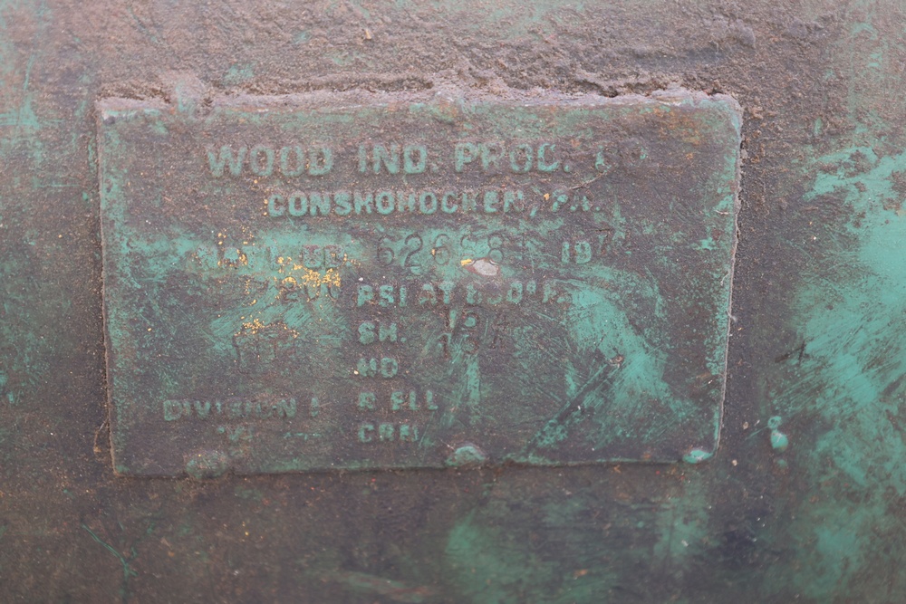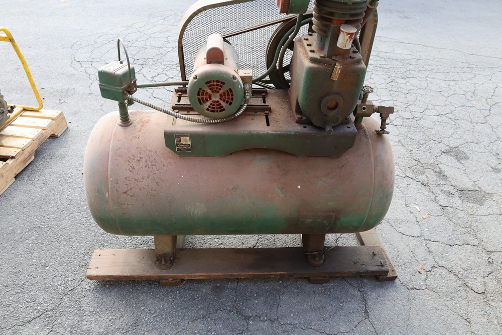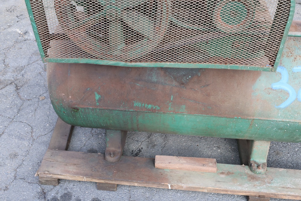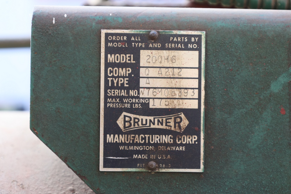 Air compressor mounted on a wooden base, finished primarily in a faded green and reddish-brown paint. It features an electric motor connected to a single-stage compressor pump via a belt drive enclosed by a removable wire mesh guard. The unit includes a control box and a tank-mounted valve assembly. An attached identification plate indicates the item is a Brunner Manufacturing Corp. model 200H6 with a maximum working pressure of 175 LBS, and a second tank plate identifies the manufacturer as Wood Ind. Proc. Conshohocken, PA.