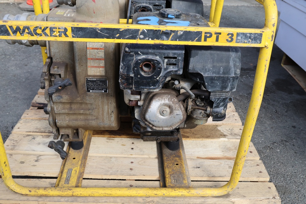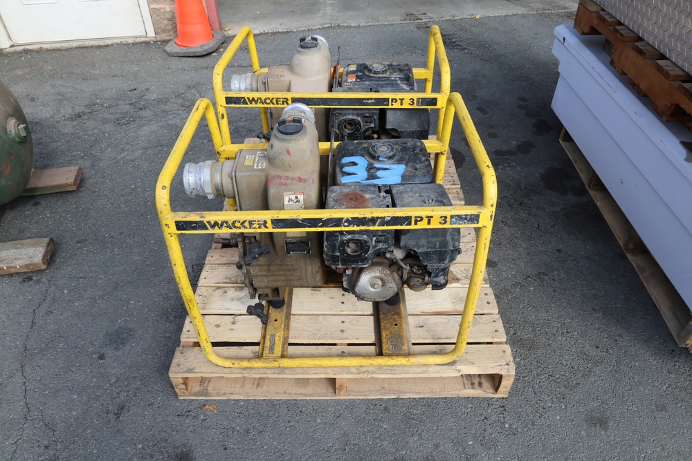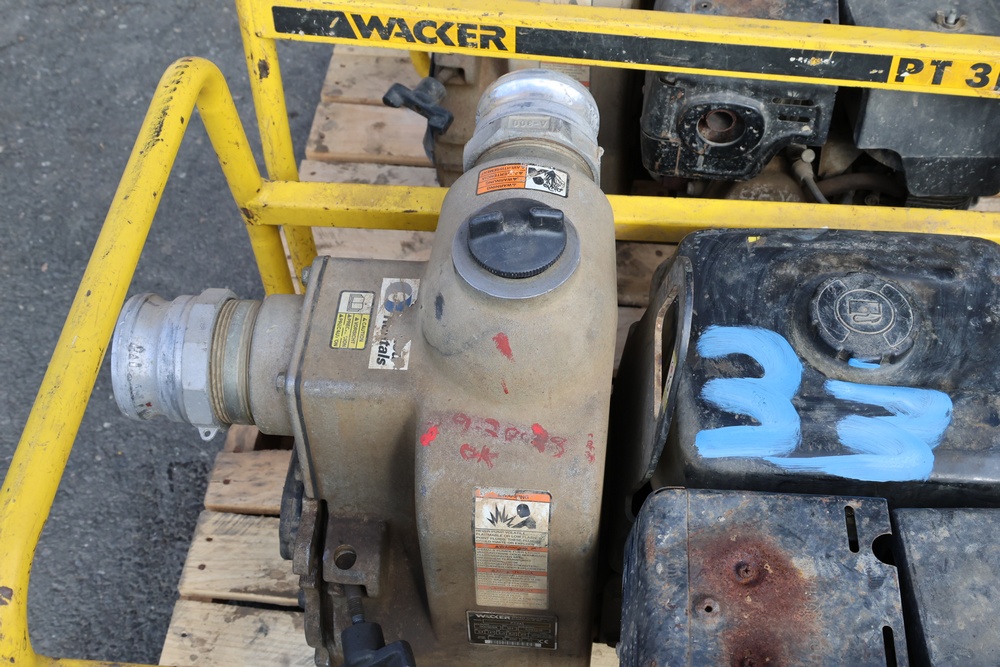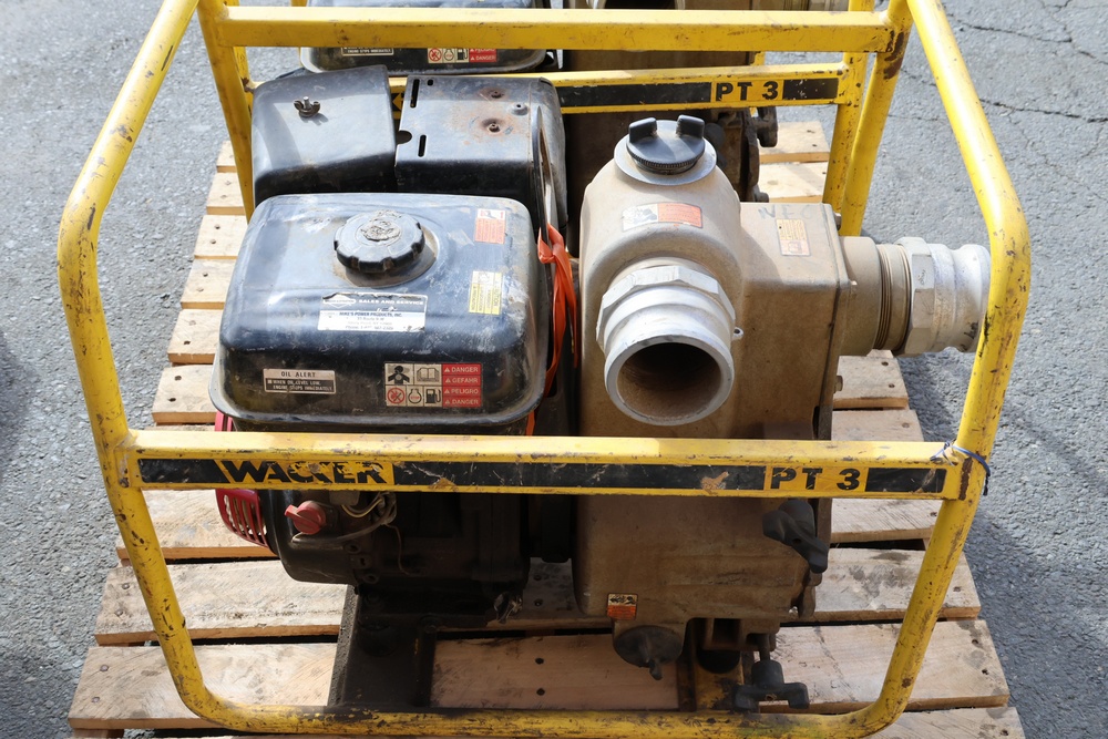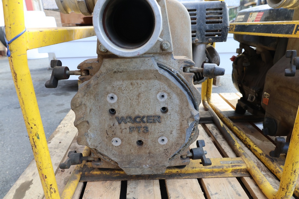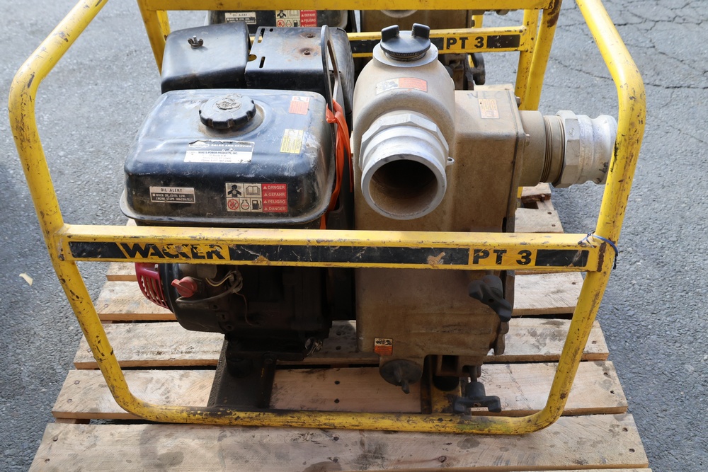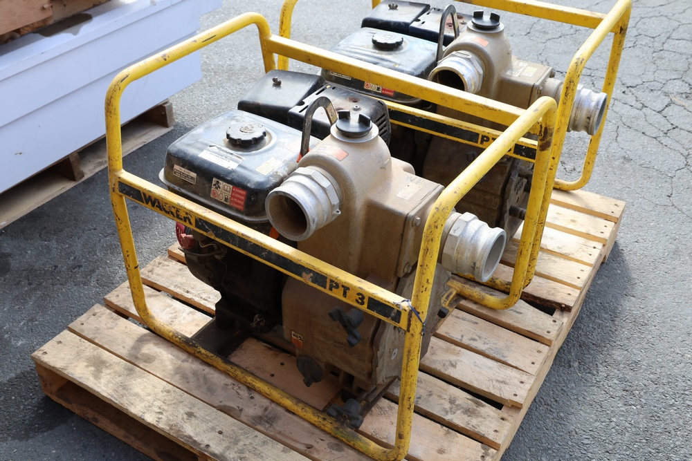 WACKER Model PT3A trash pumps with a HONDA GX240 8.0 hp electronic ignition engine. The specification plate indicates each pump has a capacity of 400 gpm (gallons per minute) and a maximum head lift of 29 meters or 96 feet, with a total weight of 64 kg or 141 lbs. For parts or repair.