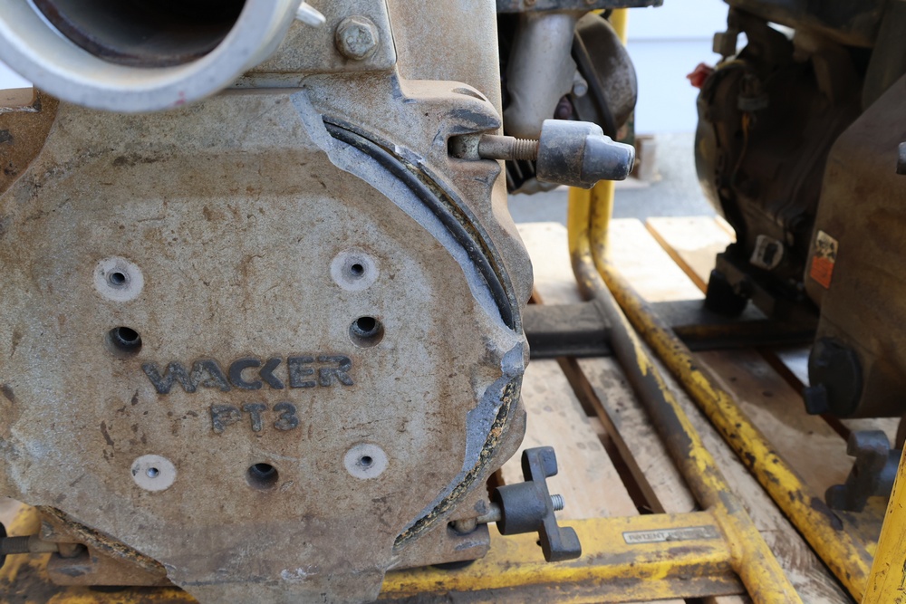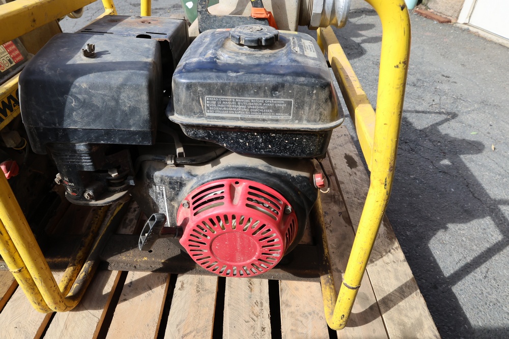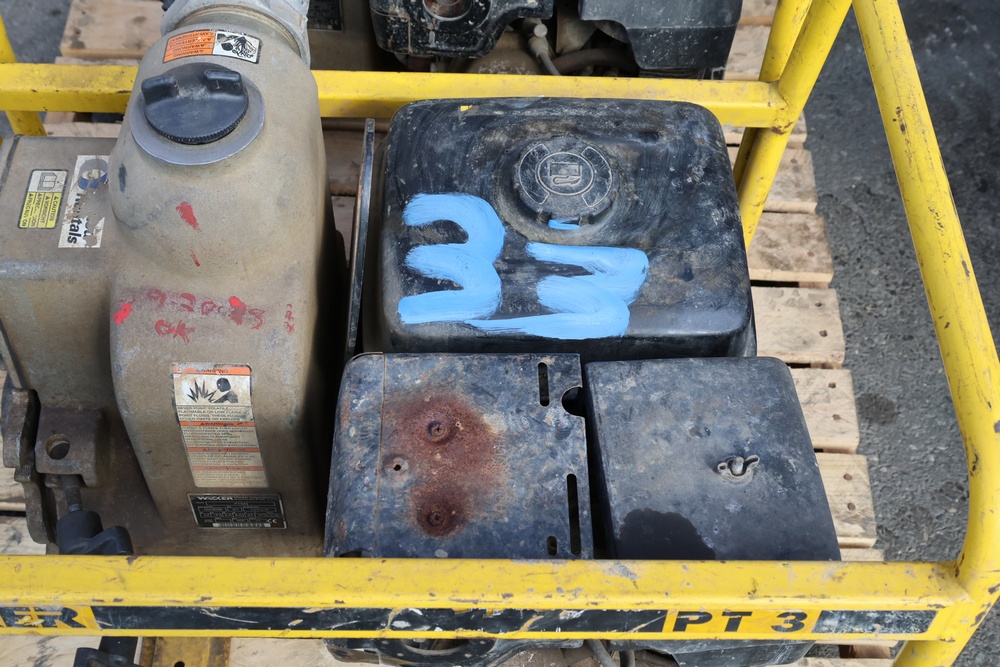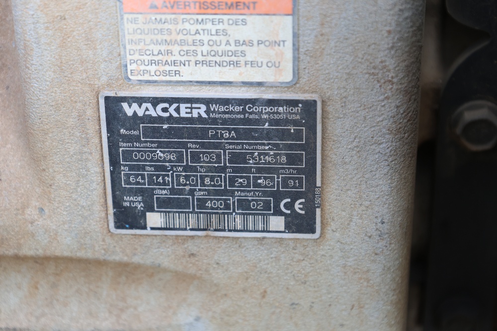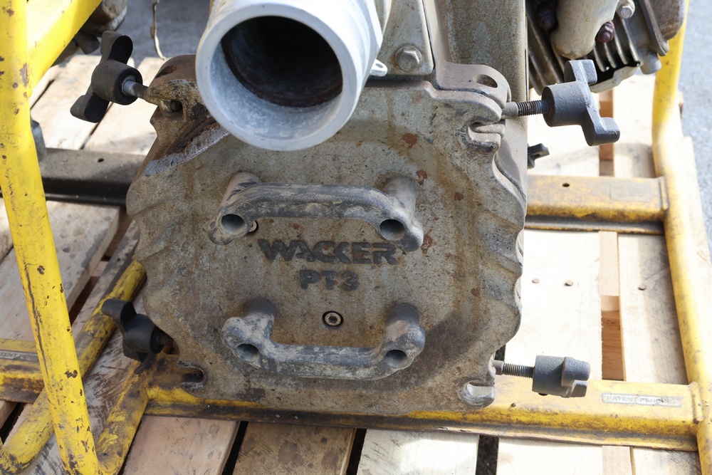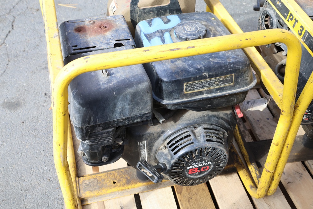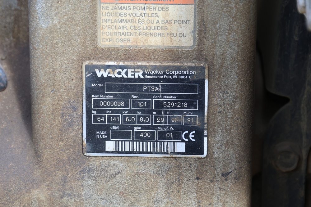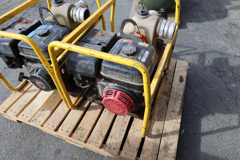 WACKER Model PT3A trash pumps with a HONDA GX240 8.0 hp electronic ignition engine. The specification plate indicates each pump has a capacity of 400 gpm (gallons per minute) and a maximum head lift of 29 meters or 96 feet, with a total weight of 64 kg or 141 lbs. For parts or repair.