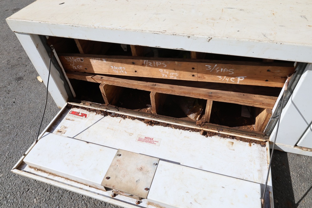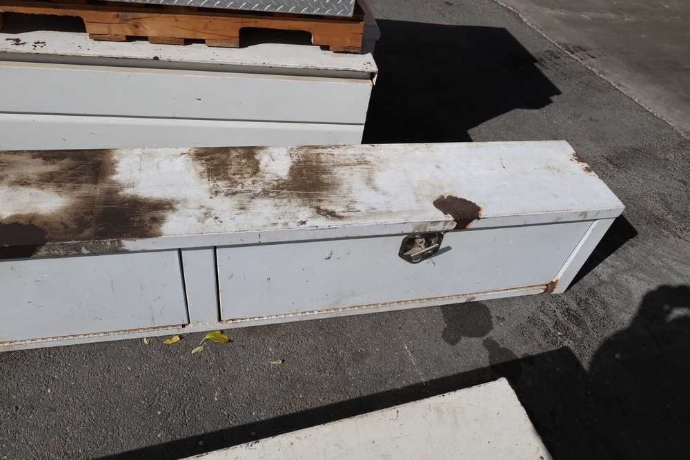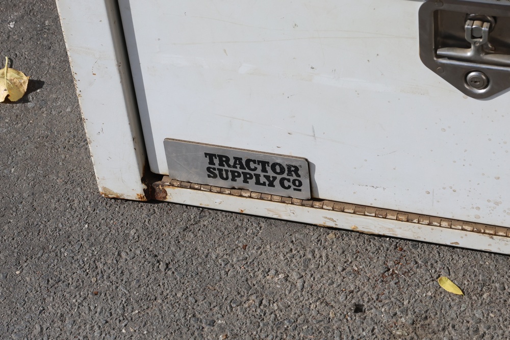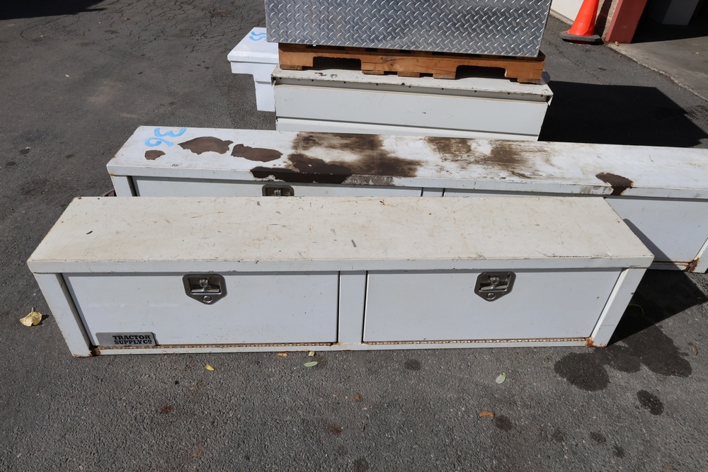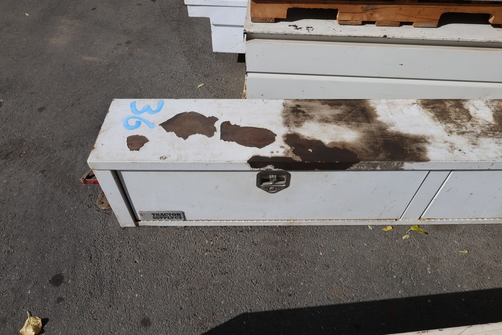 Two white metal storage boxes designed to mount to the side of a utility or flatbed truck. Both boxes are branded TRACTOR SUPPLY CO with visible DELTA decals, one of which identifies the model as 876000R2 with a production date of 08/11/04. Each box features two separate latching compartments with drop-down doors, and the interior of one compartment contains wooden dividers.
