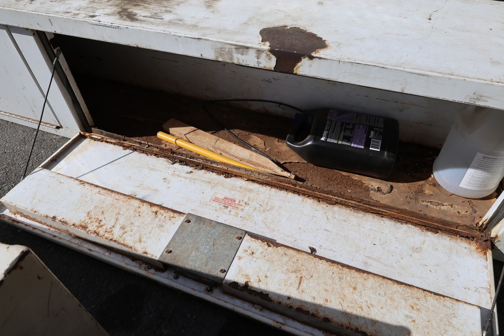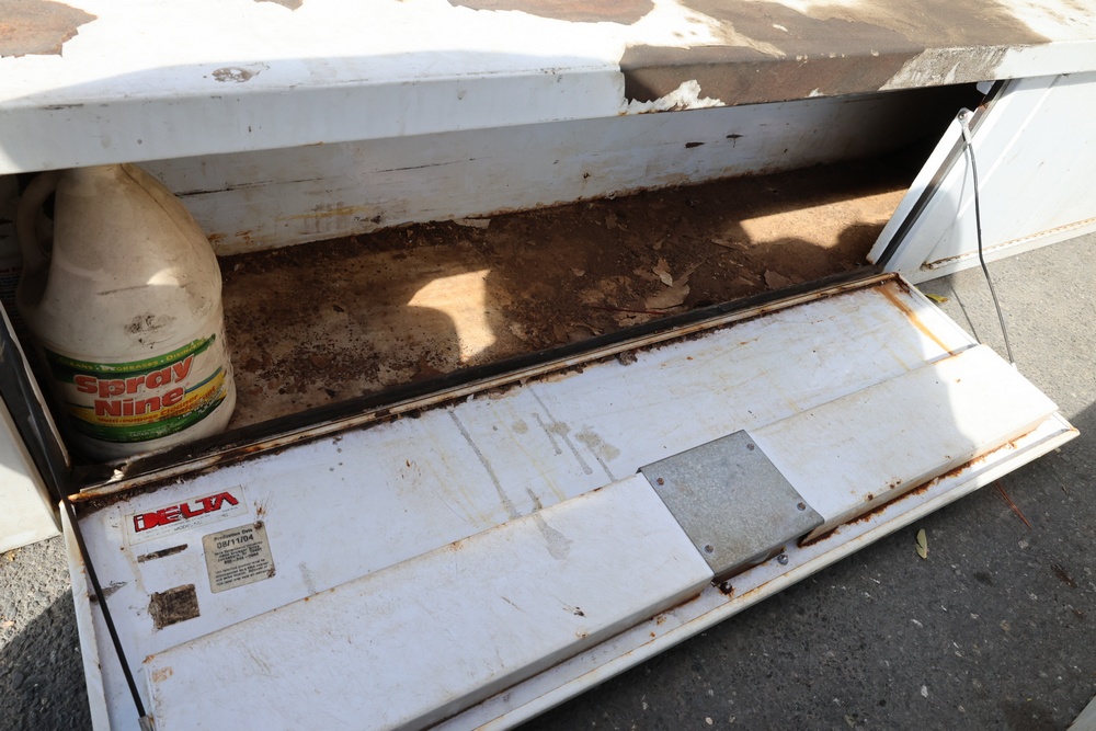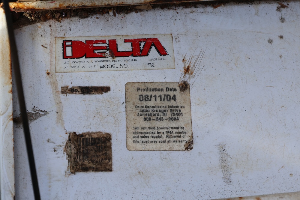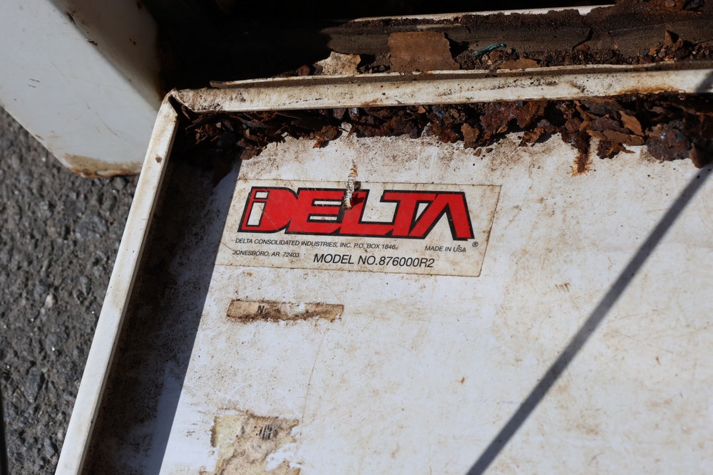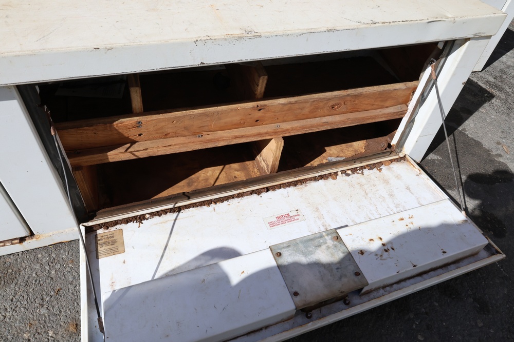 Two white metal storage boxes designed to mount to the side of a utility or flatbed truck. Both boxes are branded TRACTOR SUPPLY CO with visible DELTA decals, one of which identifies the model as 876000R2 with a production date of 08/11/04. Each box features two separate latching compartments with drop-down doors, and the interior of one compartment contains wooden dividers.