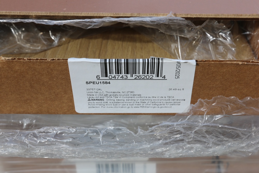 Lot is for 52 cartons of new laminate flooring. 26.48 square feet per carton. 1376.96 total square feet. Manufacturer is Mohawk. Product is Belhan Court Vintage Tea Oak. This product is Waterproof. Uni-Clic floating locking system. 2nd quality indicating up to 10% of product may have minor imperfections such as markings, off-shade, blister/missing spot of wood grain, sample board.
