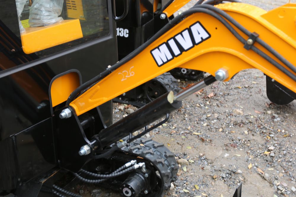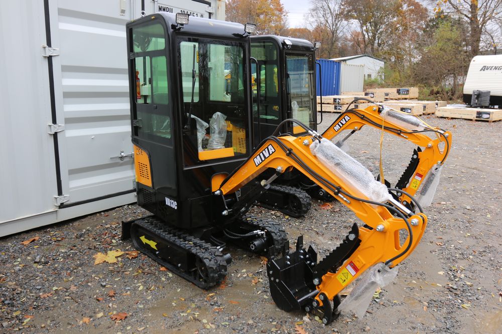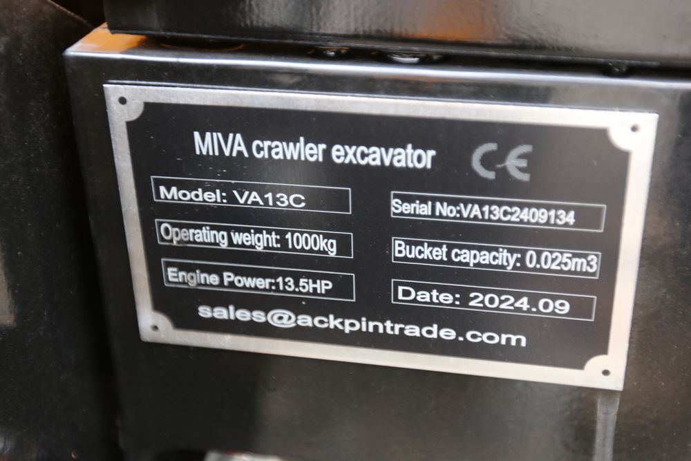 New MIVA mini excavator model: VA13C, 13.5hp Briggs and Stratton gas engine, w/ thumb, Hydraulic Boom & Bucket Controls, bucket, with enclosed canopy and support bars. Hours reading less than one hour.