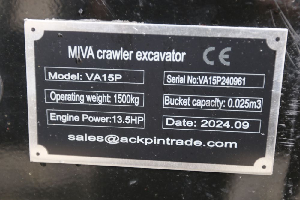 New 2025 MIVA Crawler excavator model VA15P w/ thumb, tracks, Hydraulic Boom & Bucket Controls, bucket, and 13.5 HP engine. Hours reading less than 1 hour.