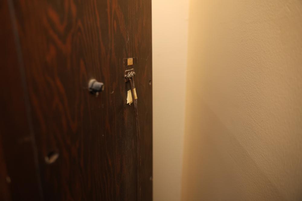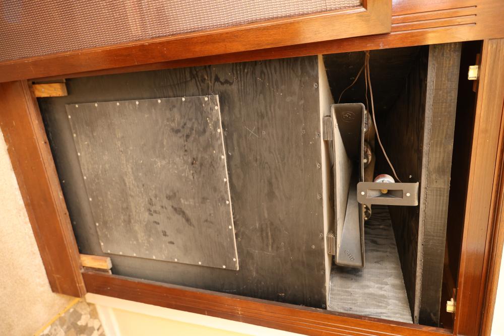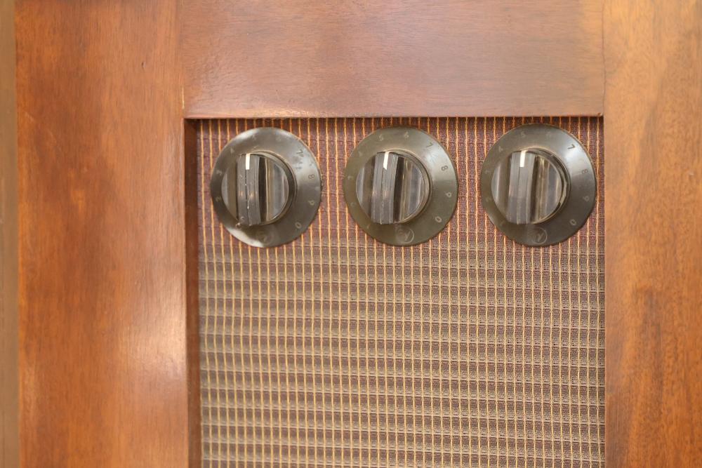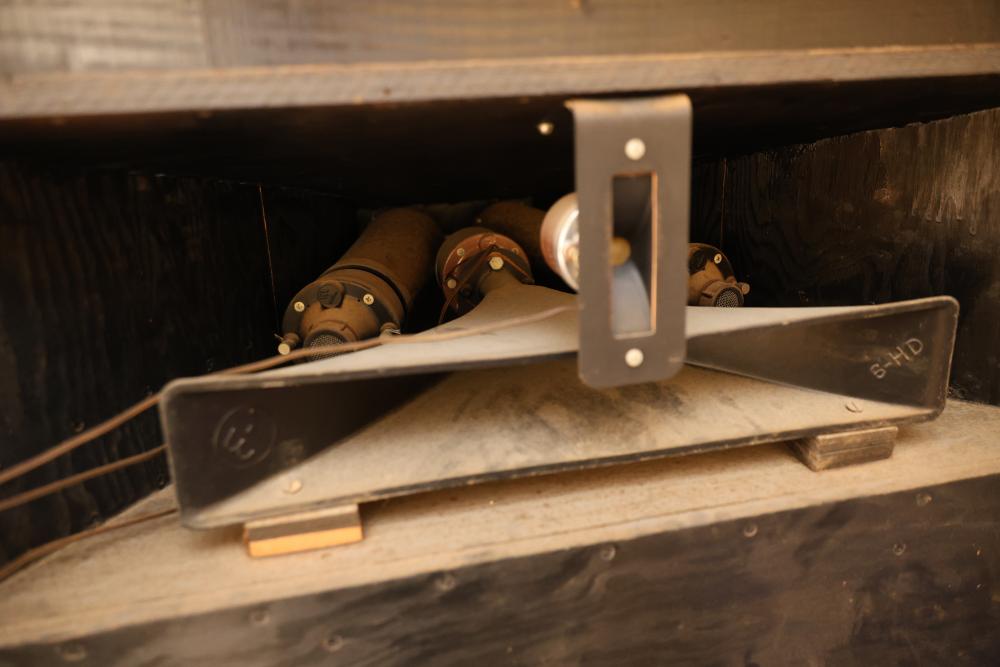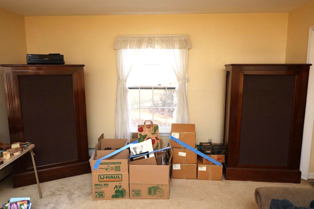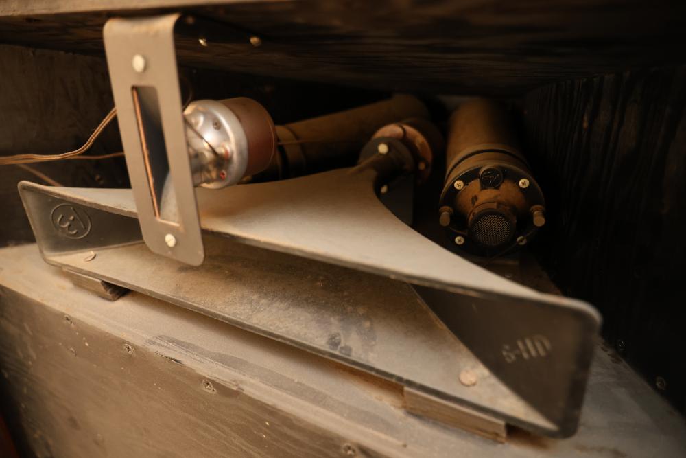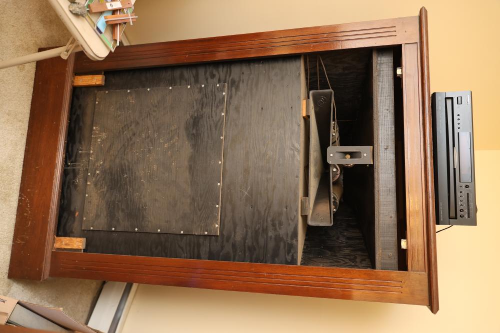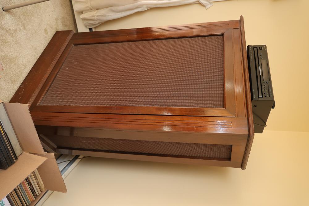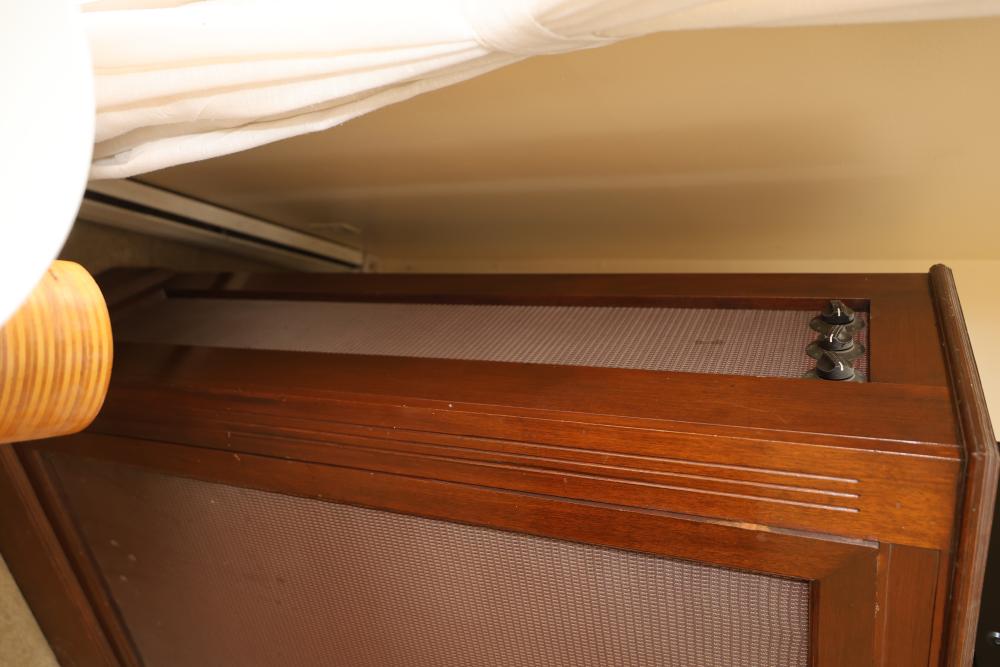 Electro-Voice Patrician IV speakers featuring large mahogany cabinetry with vented panels and grooved trim details. The front panels feature mesh grilles, while the side panel includes three rotary controls. The interior reveals a folded horn configuration with visible components including drivers, horns, and internal wiring. 39inW x 29inD x 63inH. Does not include boxes. Buyer is responsible for all help and materials necessary for safe and proper removal. These items are located on the first floor, no stairs, and will pass through the front door. Buyer must take both. Pickup only.