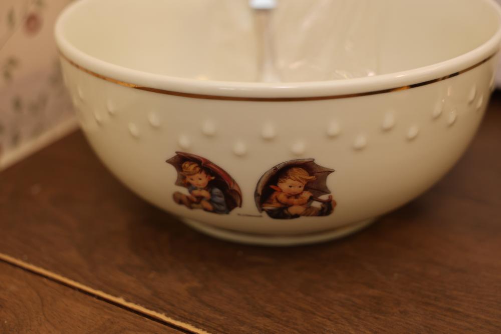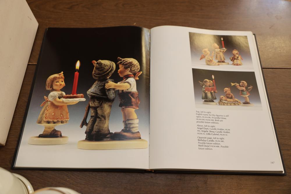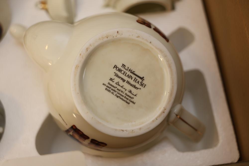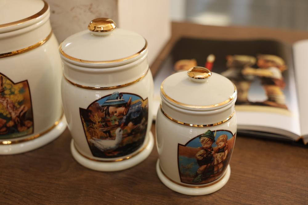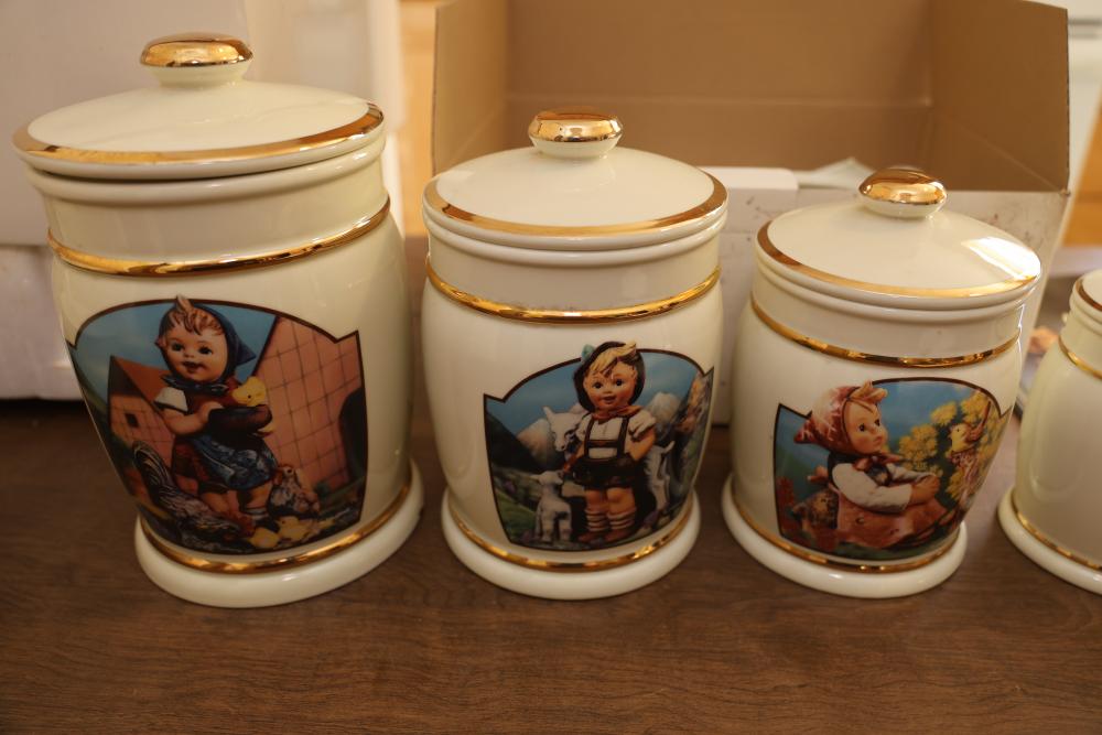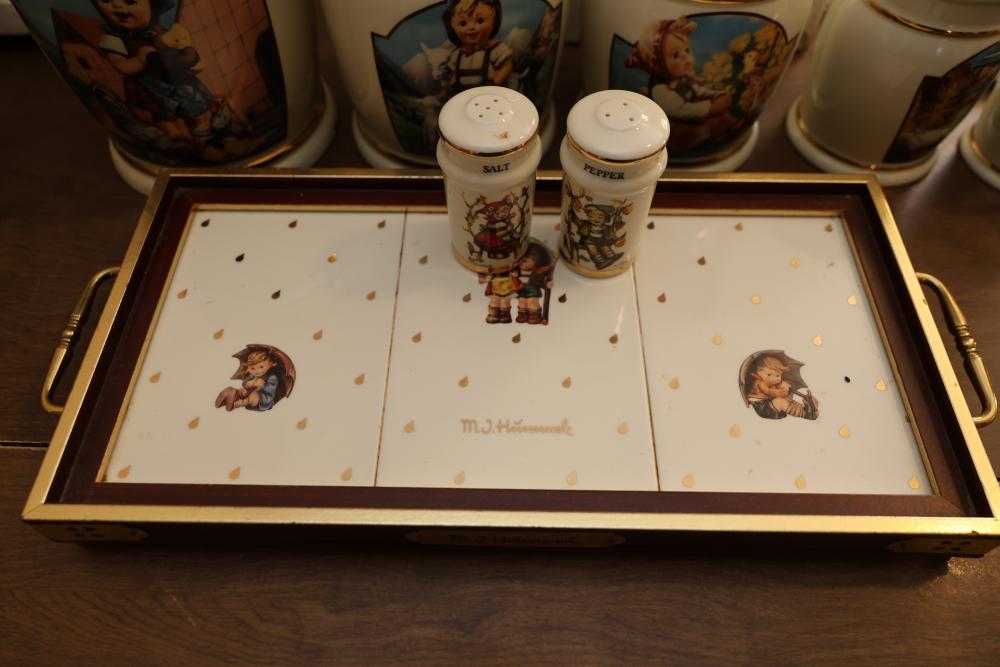 M.I. Hummel Porcelain Tea Set and Kitchen Items with Published Book. This grouping includes a teapot, creamer, sugar bowl, canisters, mixing bowl, serving tray, salt and pepper shakers, and an accompanying book showcasing M.I. Hummel designs. The tea set and kitchenware feature signature Hummel illustrations and gold-trim details. Does not include items from other lots. Buyer is responsible for all help and materials necessary for safe and proper removal. Buyer must take all. Pickup only.