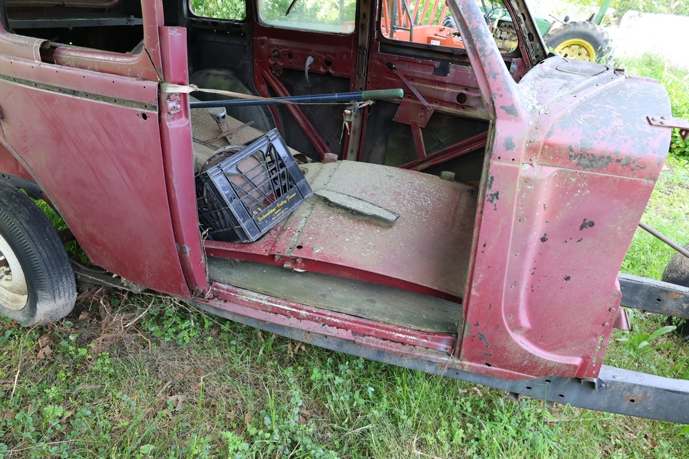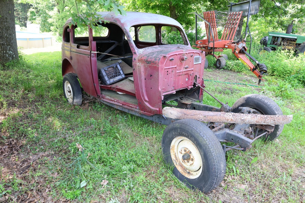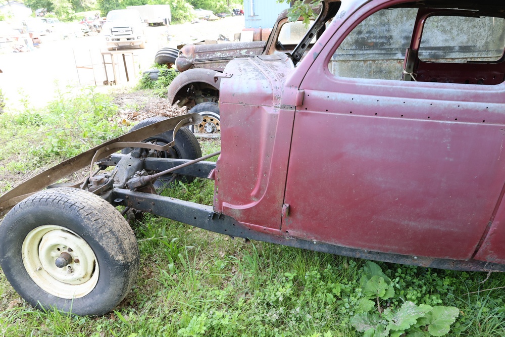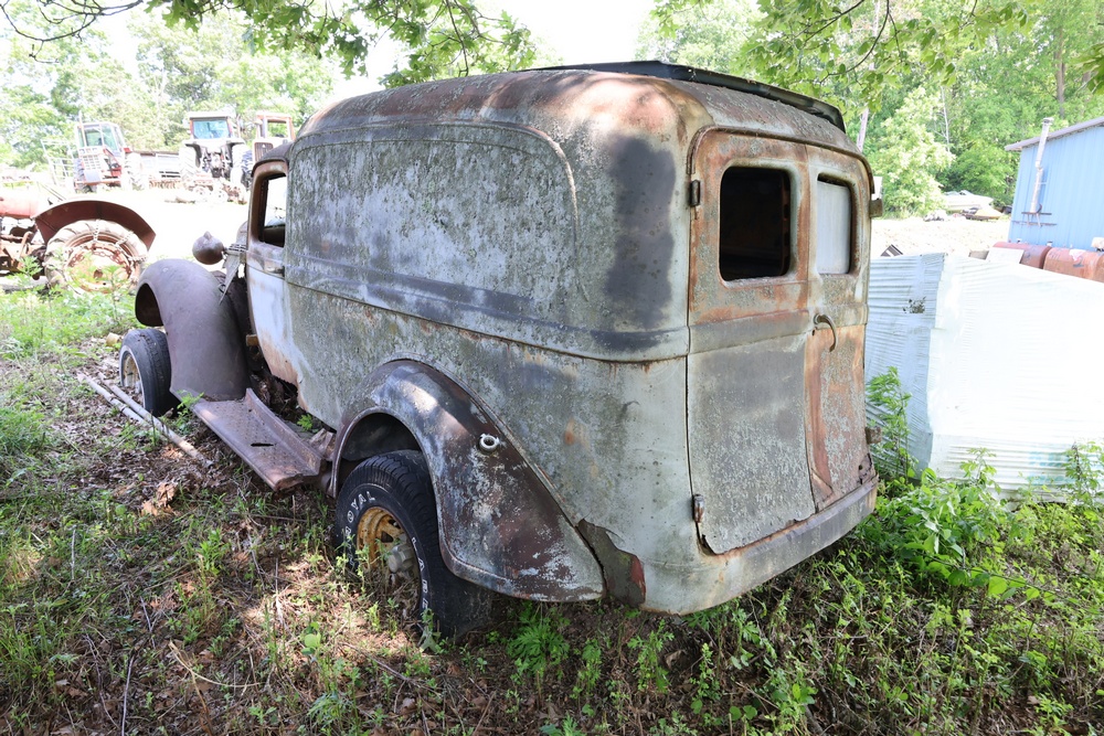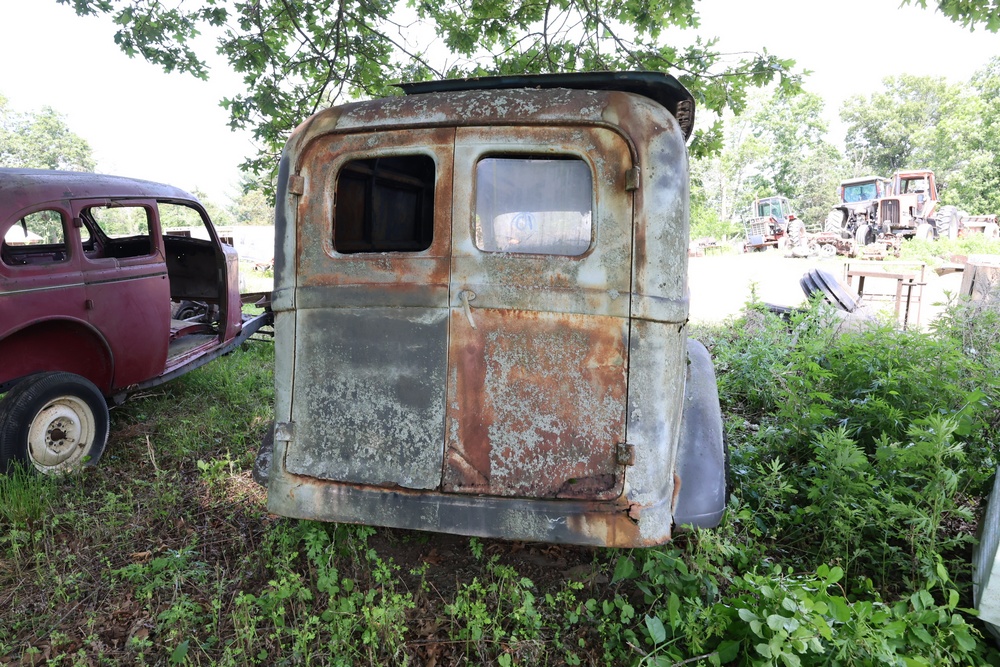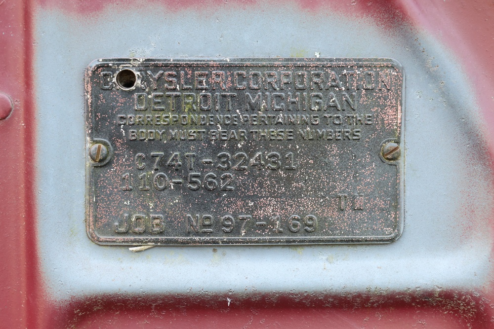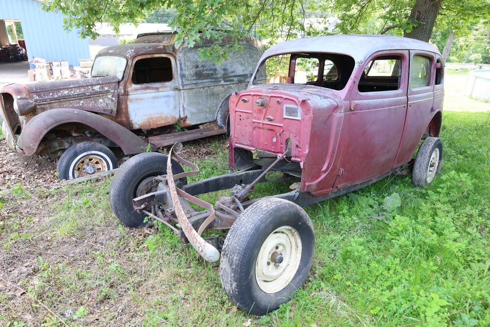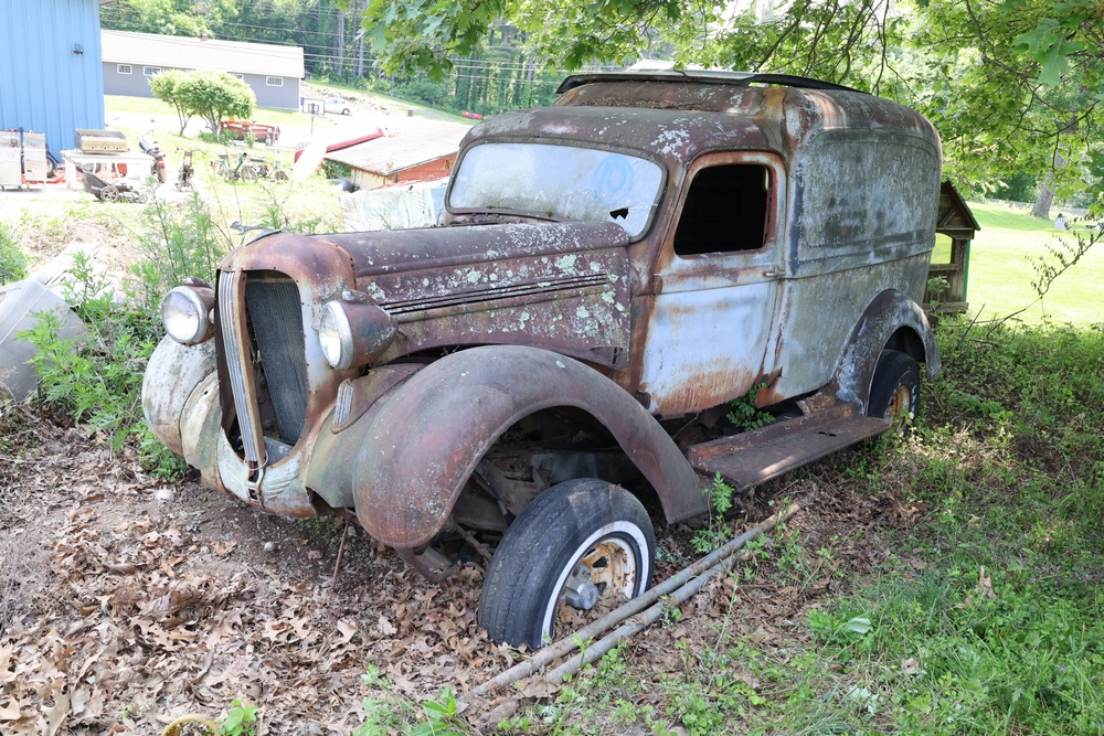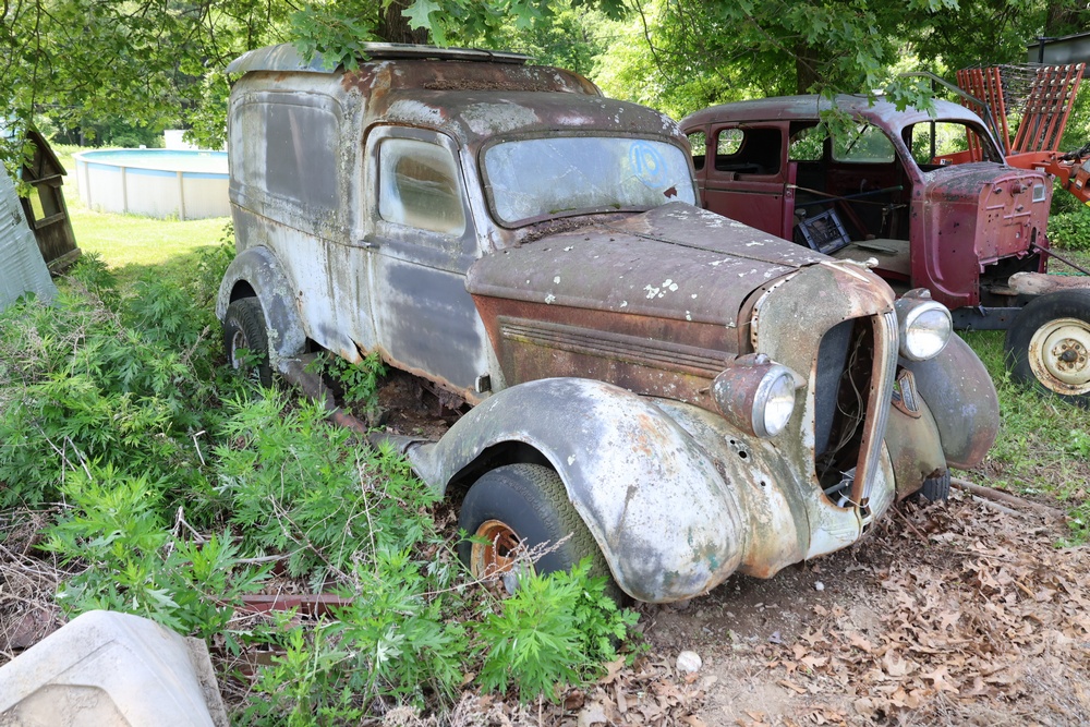 Two Dodge - Chrysler vehicles from the 1930s, including a 1938 panel delivery and a sedan body. Both are in unrestored, missing components, and no interiors. Ideal for restoration or salvageable for parts. Includes an identification plate showing vehicle details. Bill of sale only.