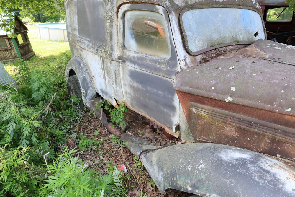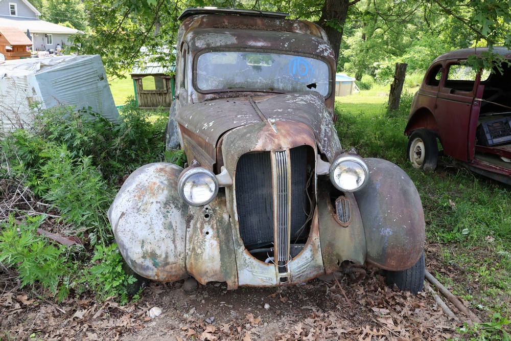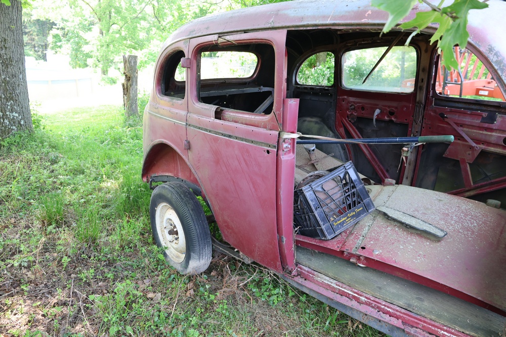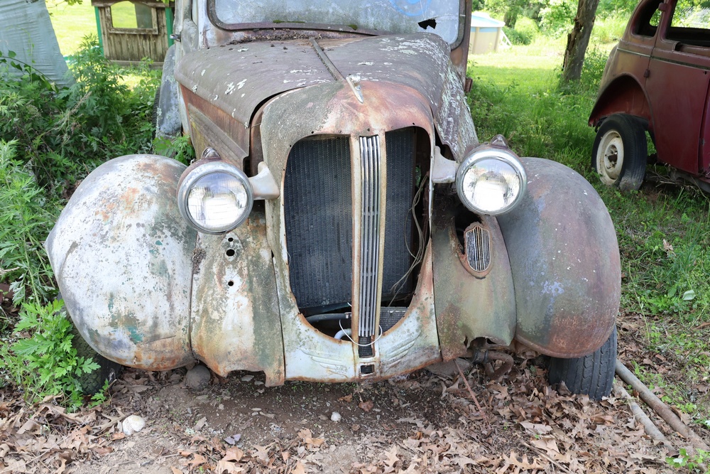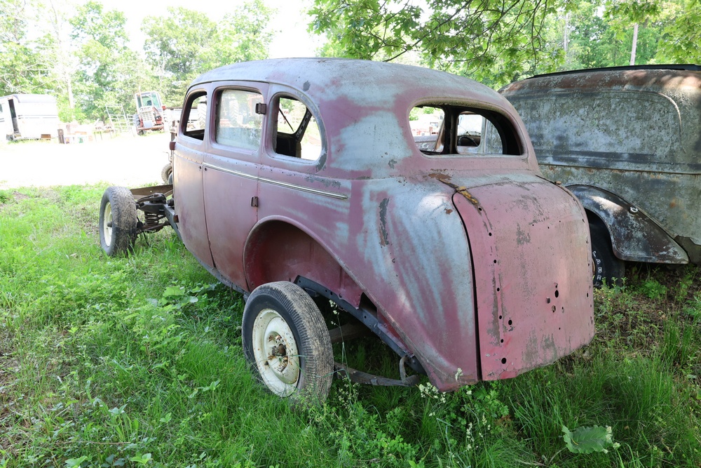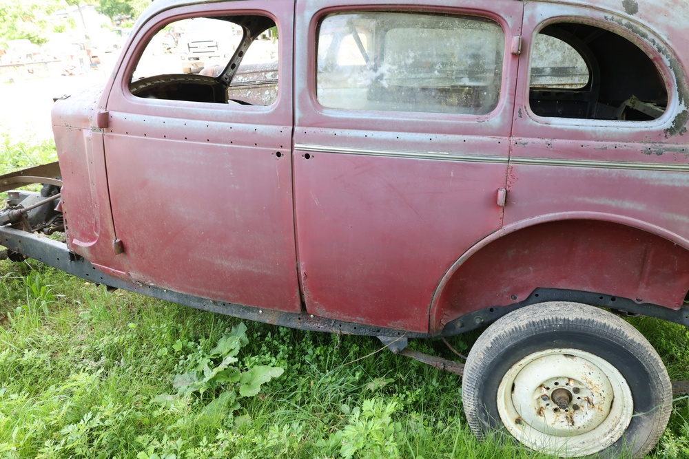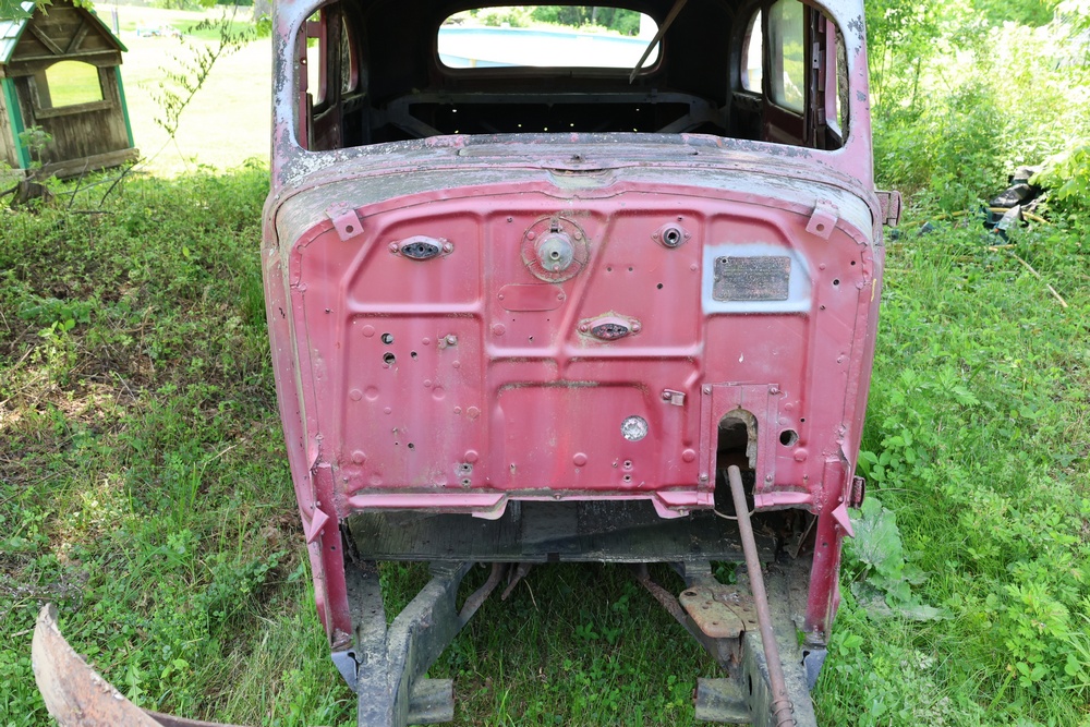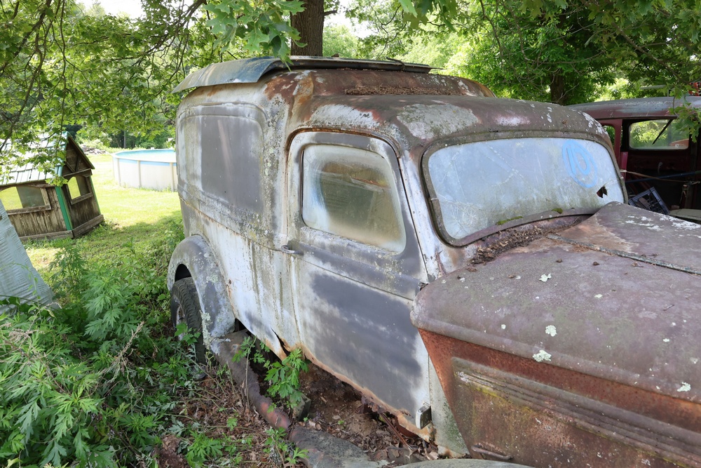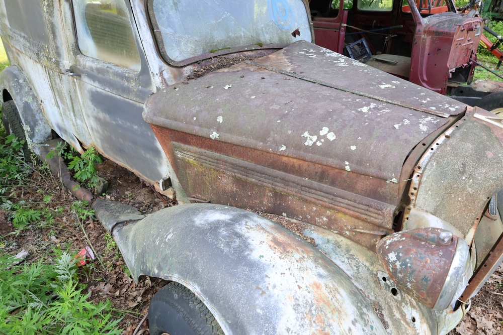 Two Dodge - Chrysler vehicles from the 1930s, including a 1938 panel delivery and a sedan body. Both are in unrestored, missing components, and no interiors. Ideal for restoration or salvageable for parts. Includes an identification plate showing vehicle details. Bill of sale only.