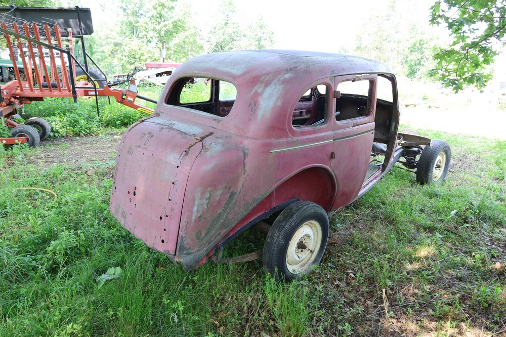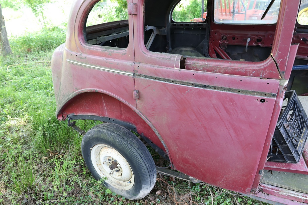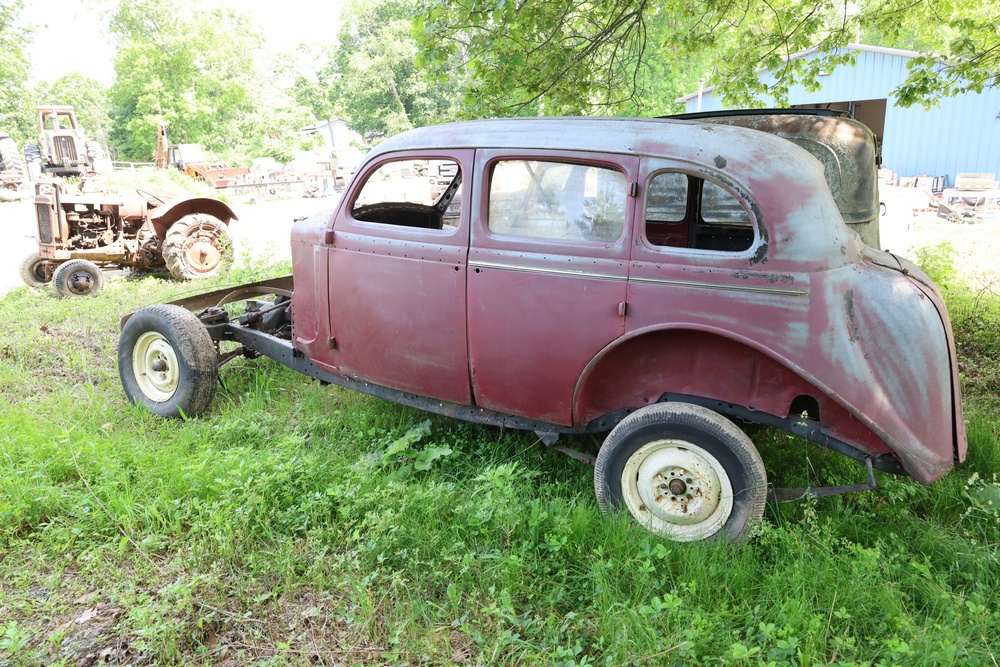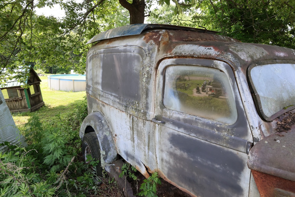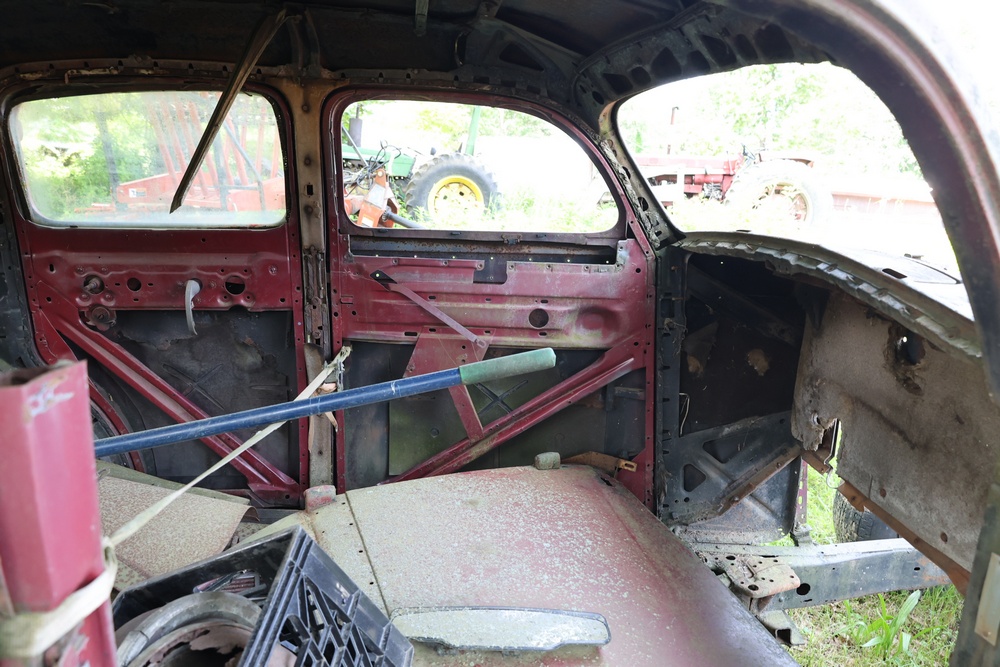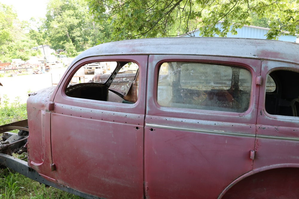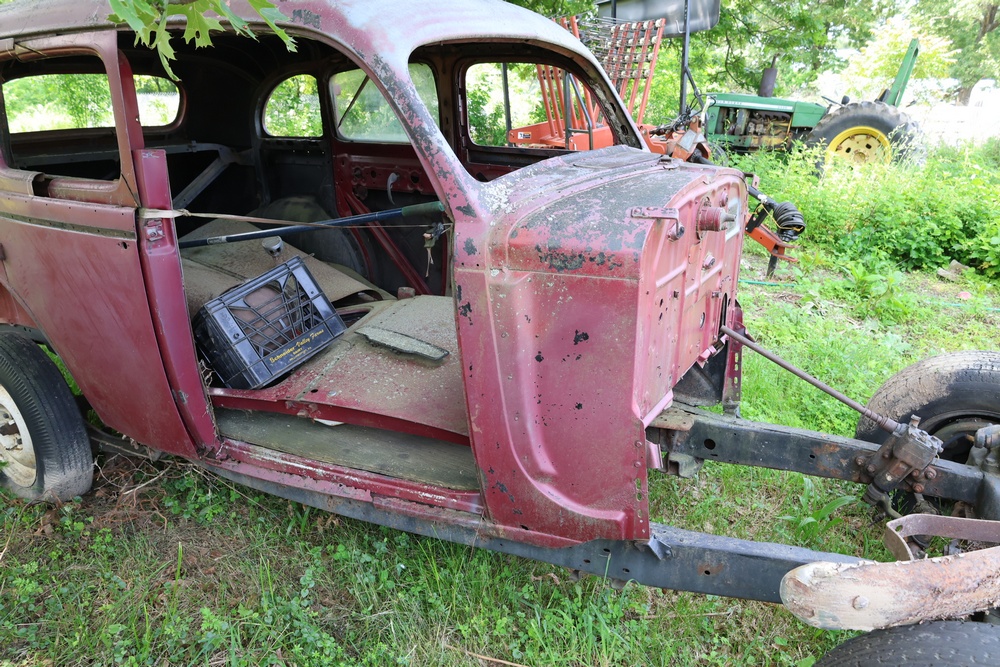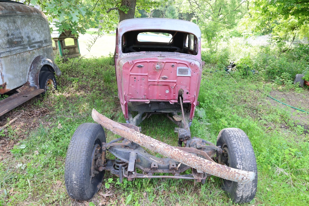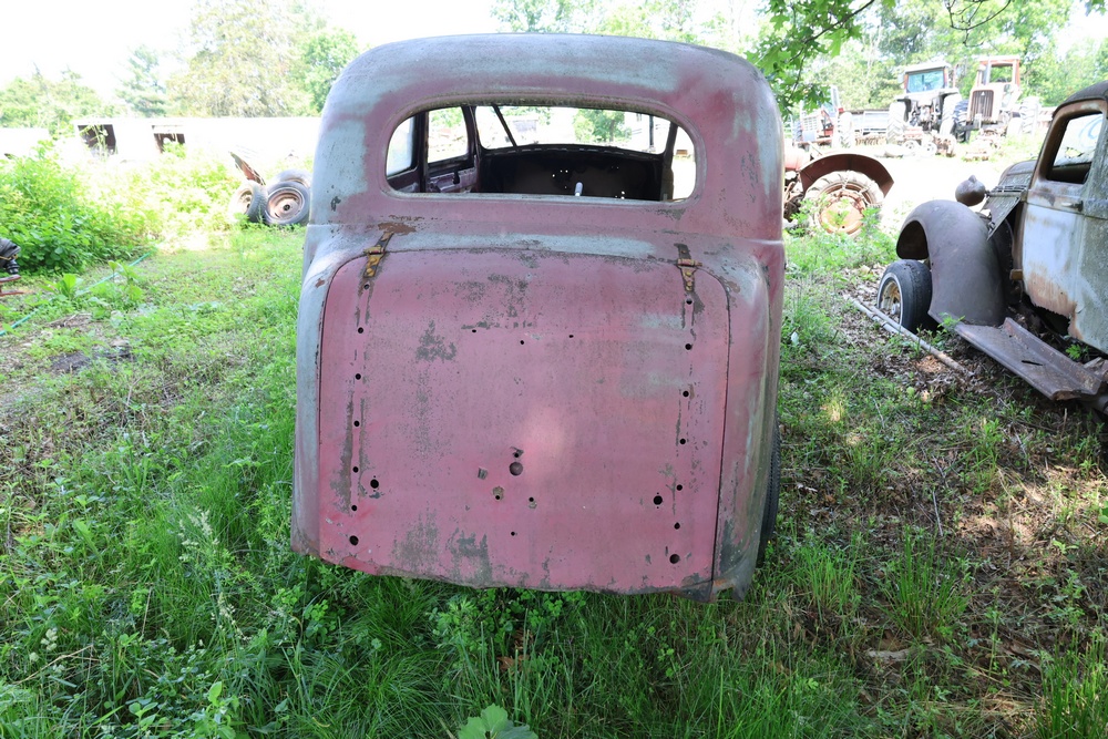 Two Dodge - Chrysler vehicles from the 1930s, including a 1938 panel delivery and a sedan body. Both are in unrestored, missing components, and no interiors. Ideal for restoration or salvageable for parts. Includes an identification plate showing vehicle details. Bill of sale only.