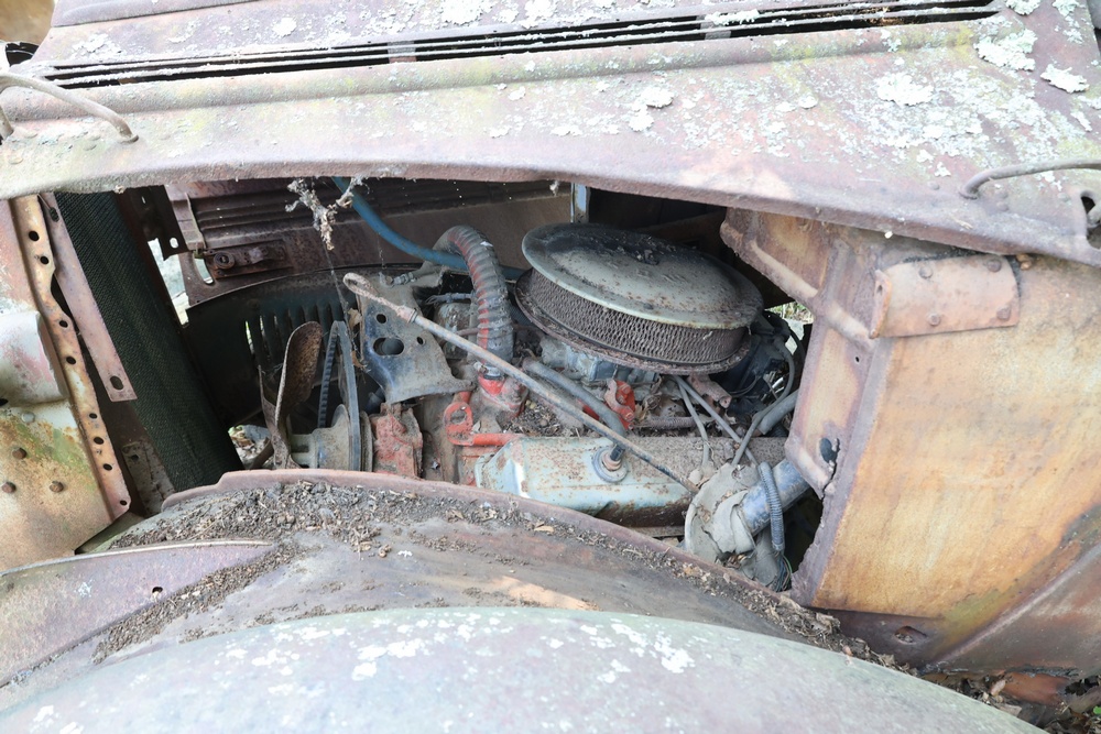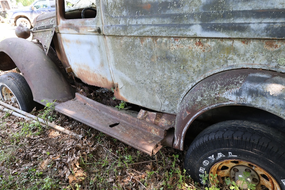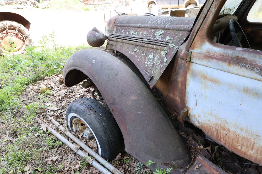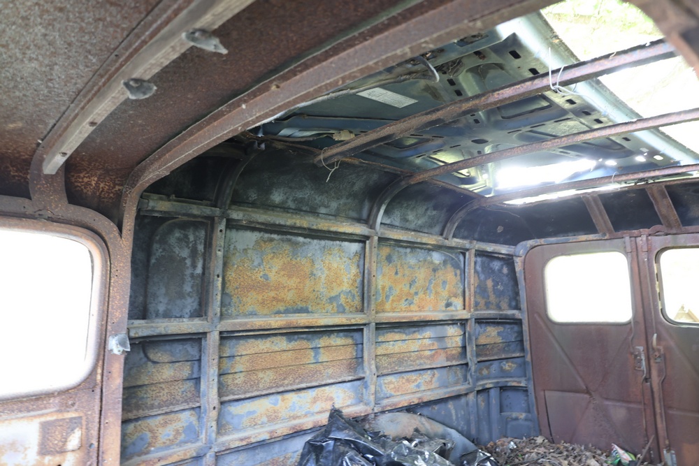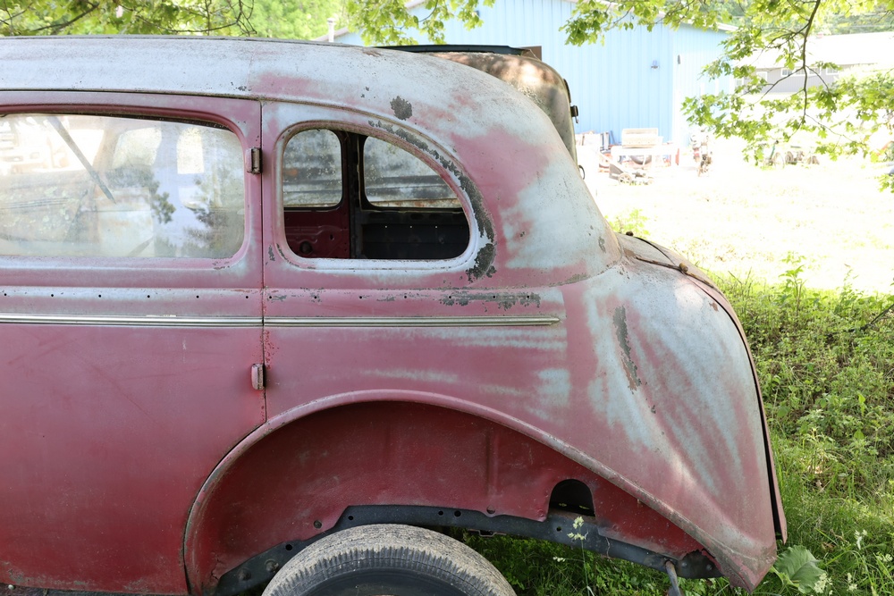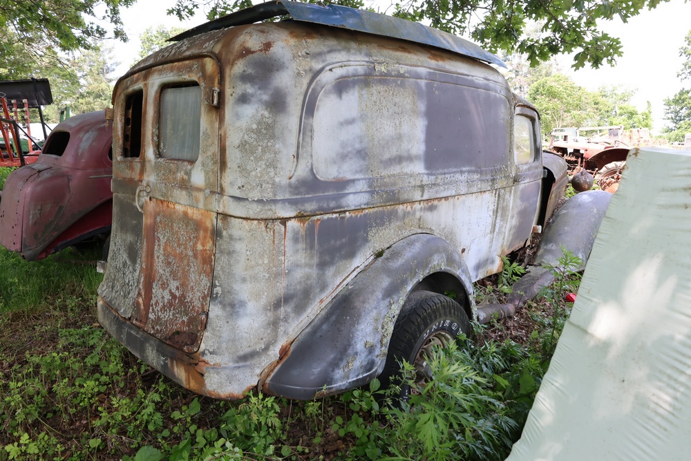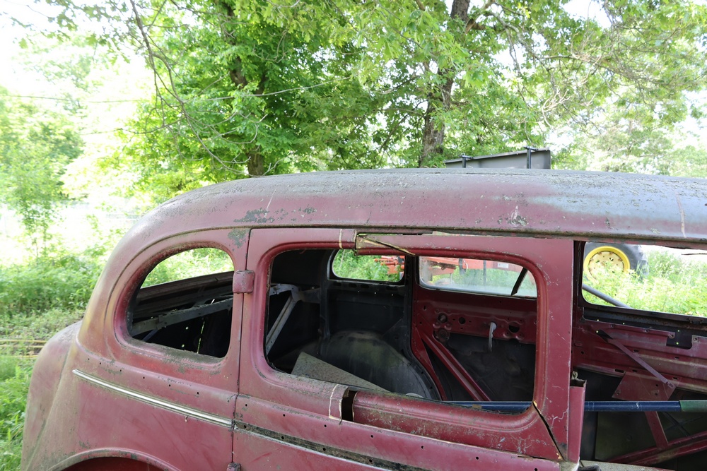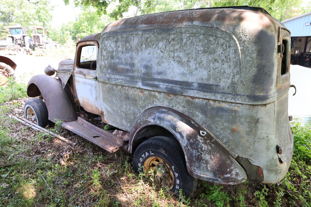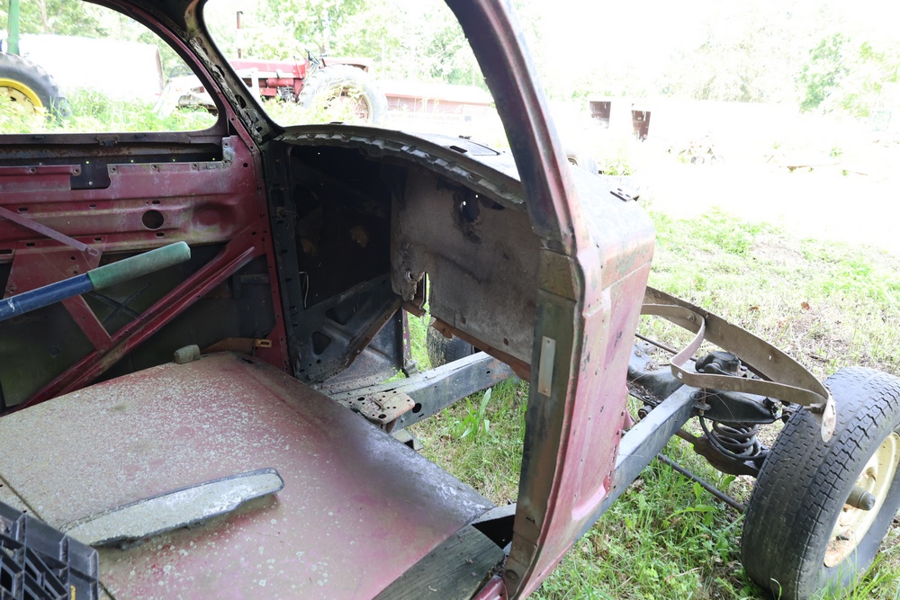 Two Dodge - Chrysler vehicles from the 1930s, including a 1938 panel delivery and a sedan body. Both are in unrestored, missing components, and no interiors. Ideal for restoration or salvageable for parts. Includes an identification plate showing vehicle details. Bill of sale only.