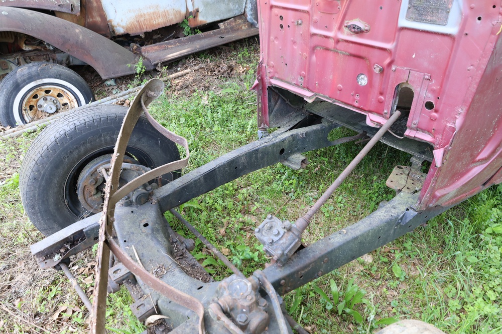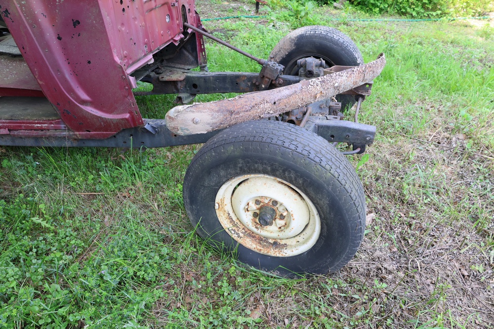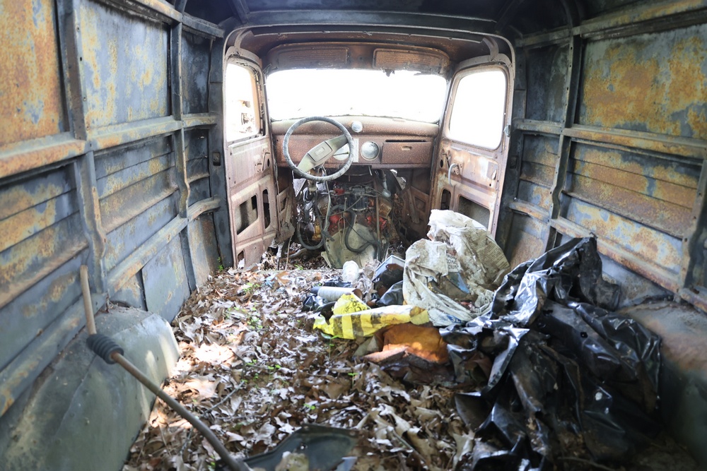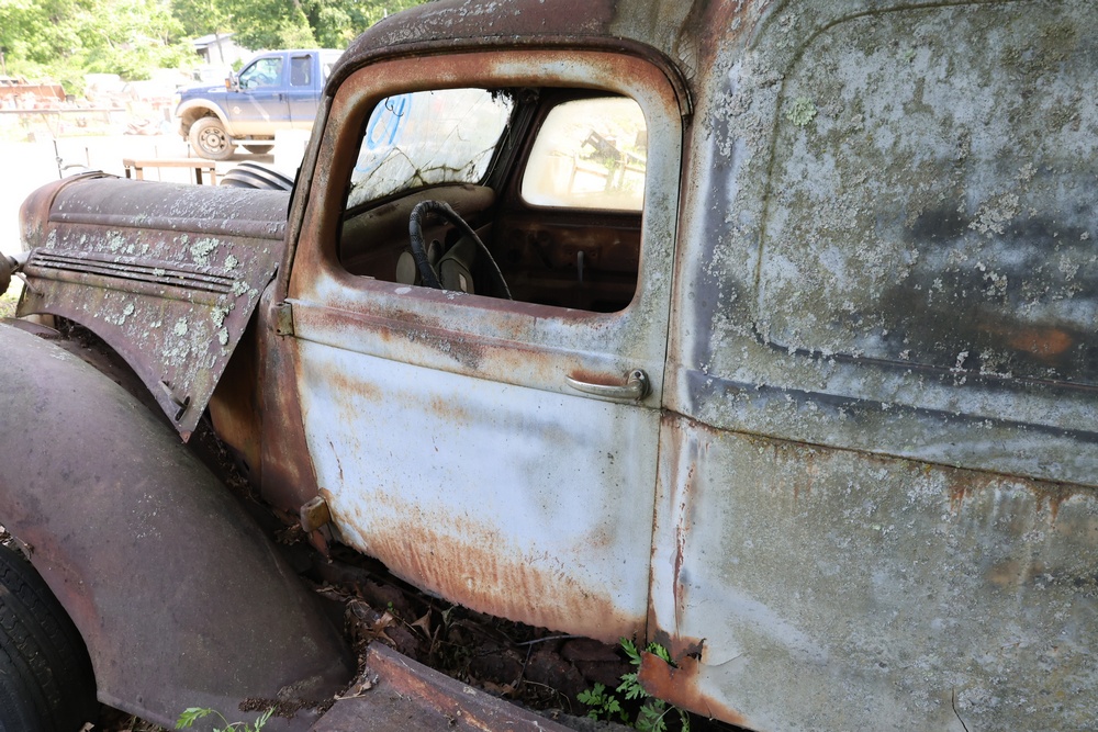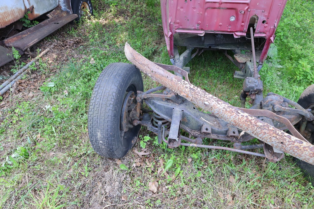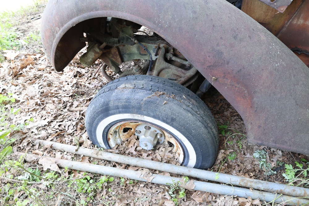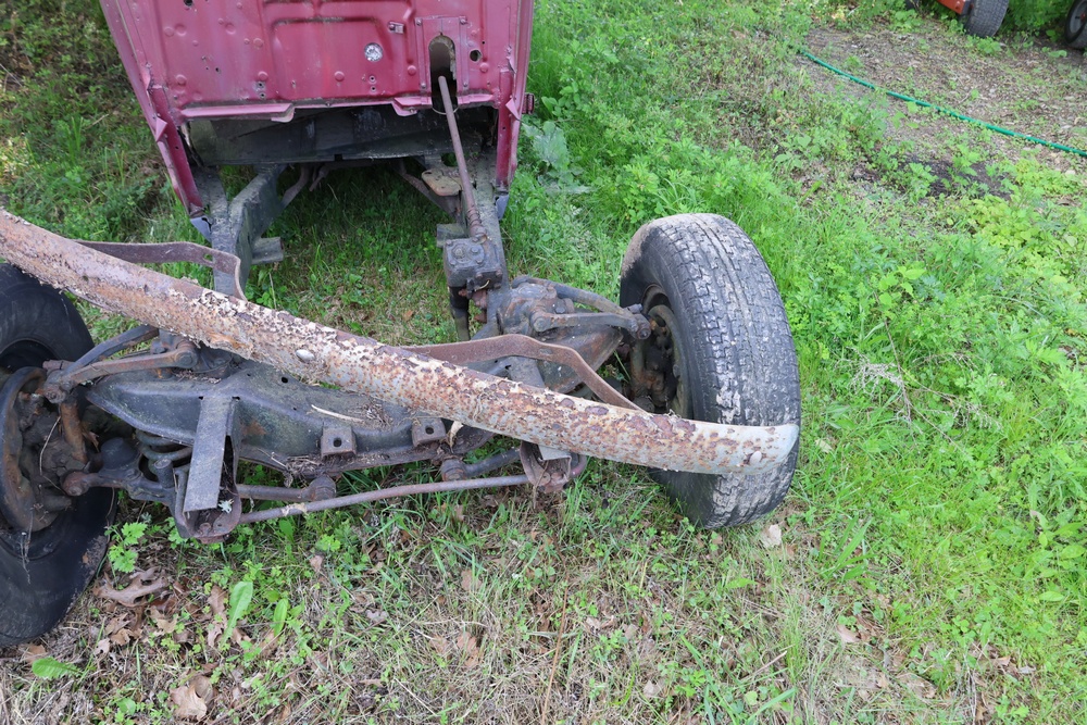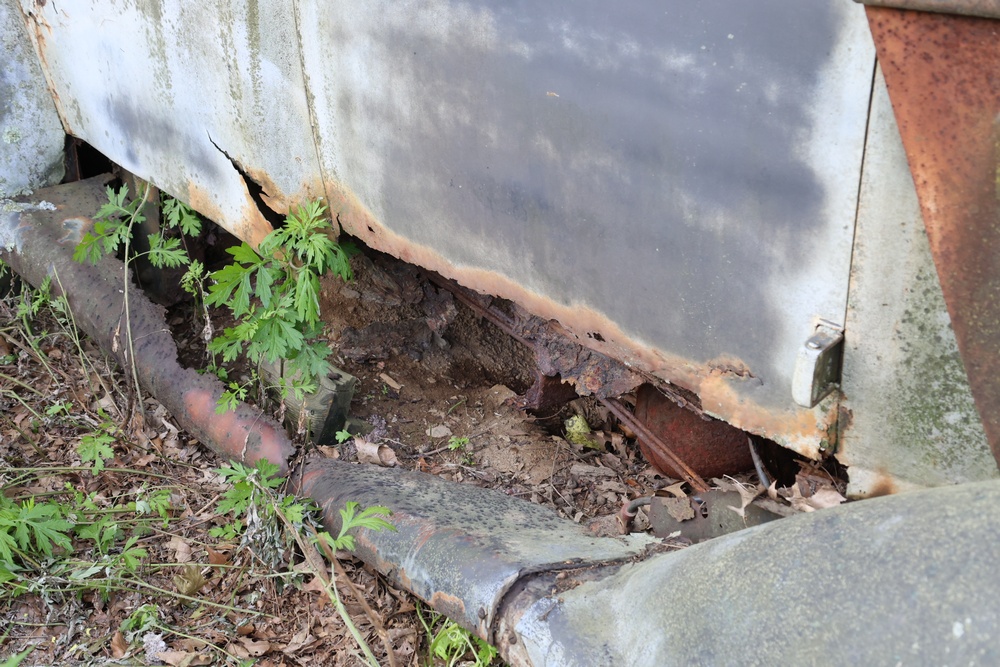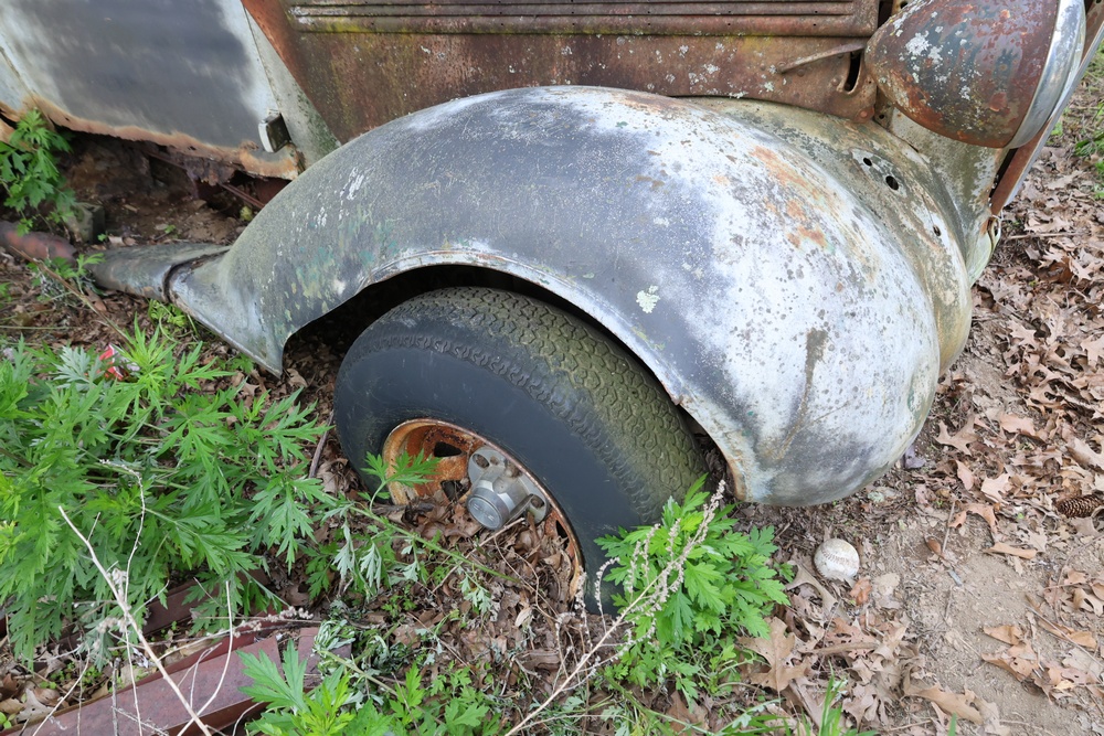 Two Dodge - Chrysler vehicles from the 1930s, including a 1938 panel delivery and a sedan body. Both are in unrestored, missing components, and no interiors. Ideal for restoration or salvageable for parts. Includes an identification plate showing vehicle details. Bill of sale only.