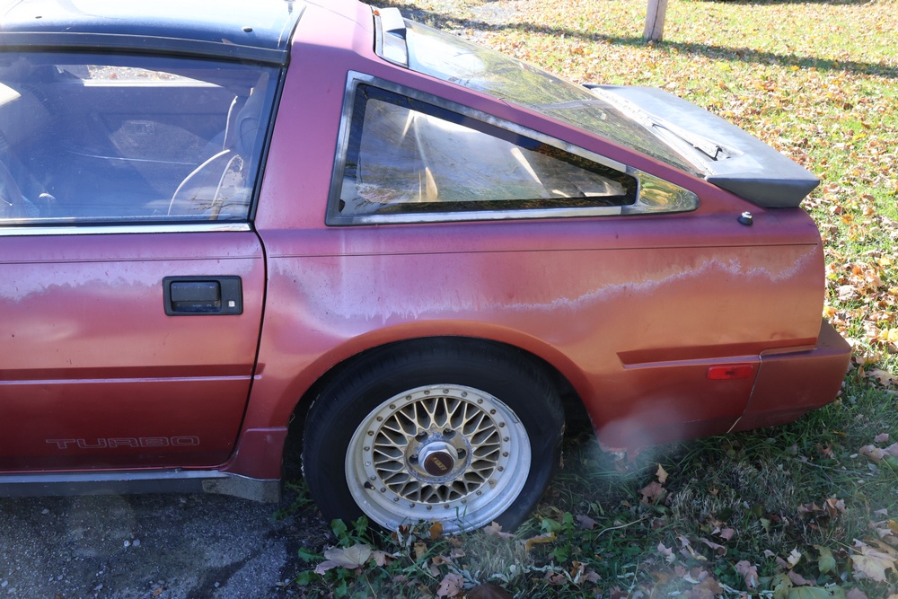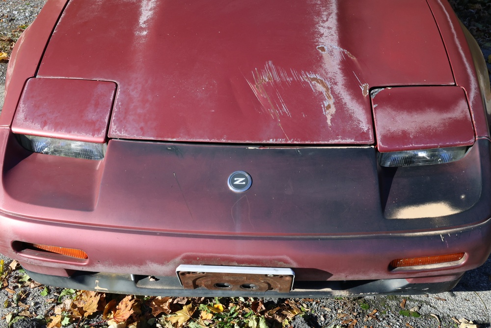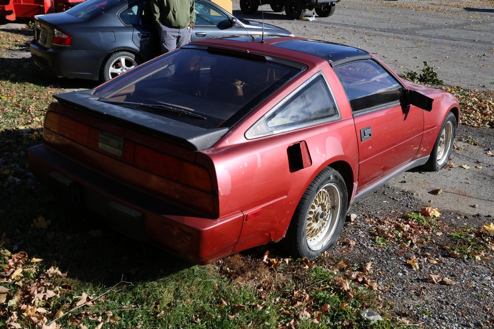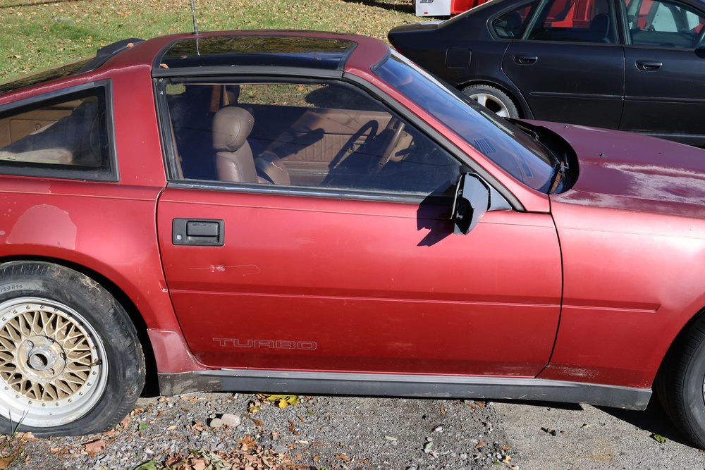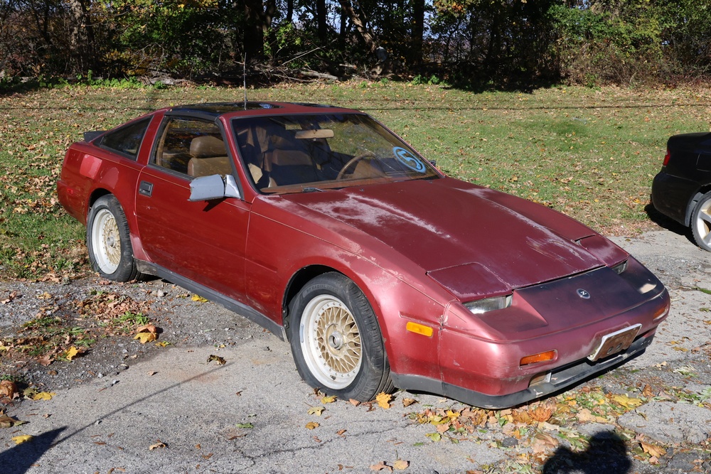 1987 Nissan 300ZX 2-door coupe with 5-speed manual transmission. VIN: JN1CZ14S3HX151067. Odometer reading: 69,521 miles. Exterior: Burgundy paint with pop-up headlights, alloy wheels, side mirrors, and Z emblem on the hood. Interior: Brown leather seats, digital climate control, factory AM/FM cassette stereo with equalizer, mobile phone, and 5-speed floor shifter. Tire configuration: Standard coupe with alloy wheels. Additional equipment includes T-top roof, power accessories, and analog instrument cluster. Title and key available. Seller reports: Ran, drove, and dealer maintained when last used in the early 2000s.