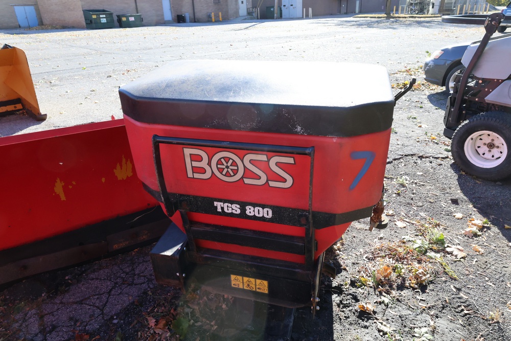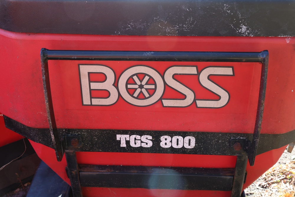 Boss TGS 800 tailgate spreader designed for mounting on trucks or utility vehicles. The unit features a red poly hopper and steel frame. Seller reports: in working condition.