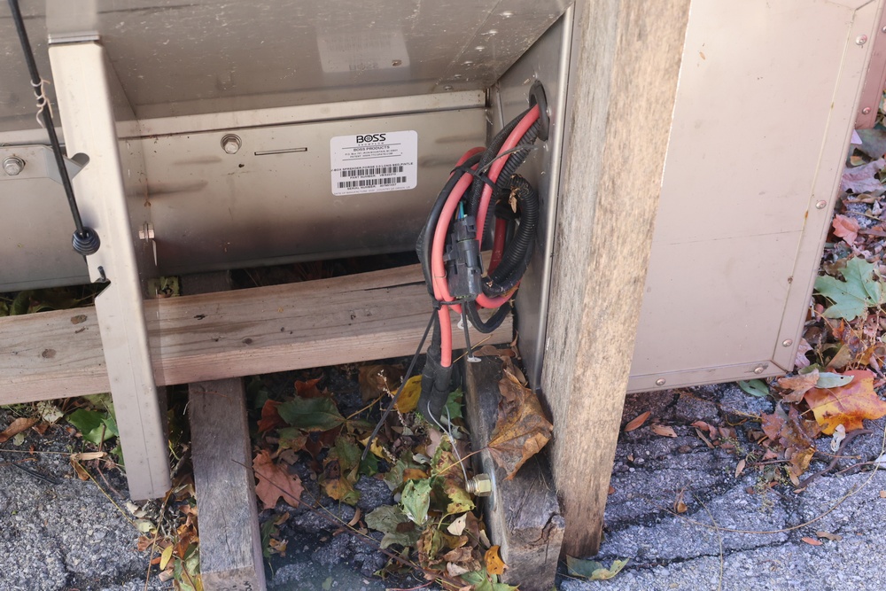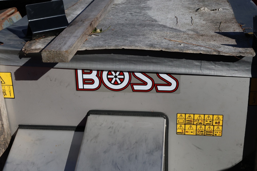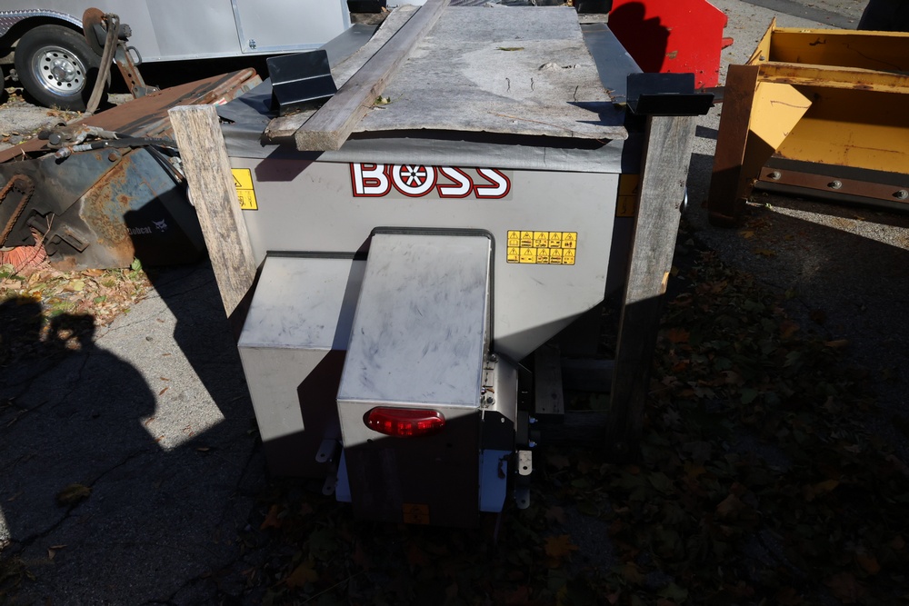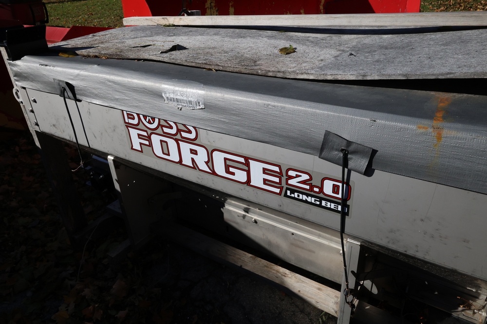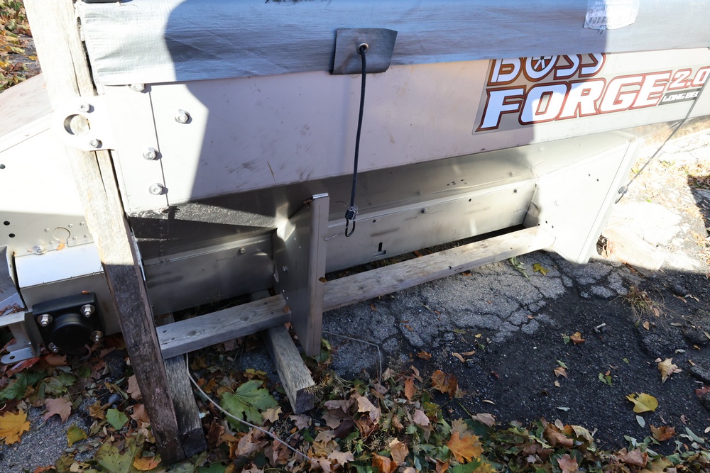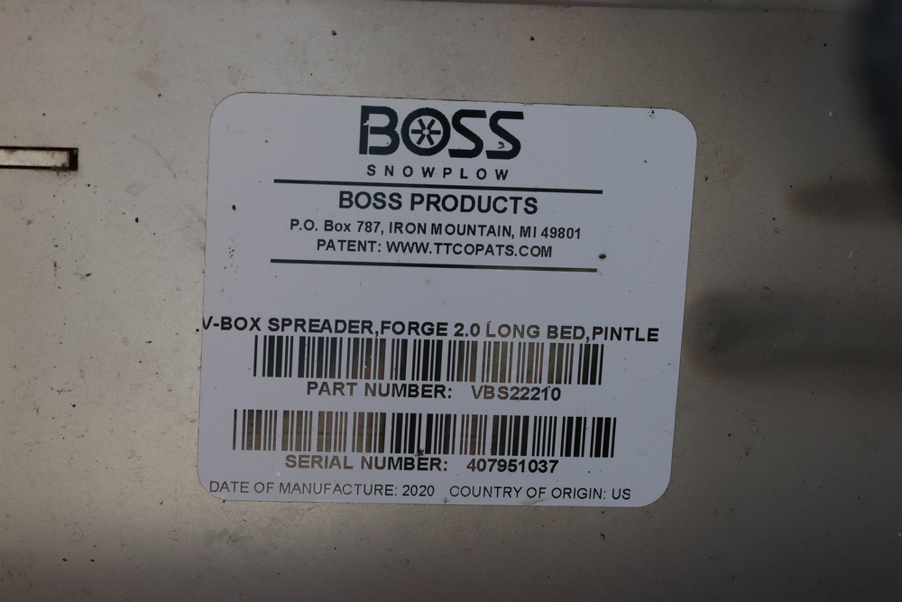 Boss Forge 2.0 Long Bed V-Box Spreader manufactured by Boss Products in Iron Mountain, Michigan, USA. The part number is VBS22210 and the serial number is 407951037. The spreader was manufactured in 2020 and is configured with a pintle chain feed system. Seller reports: Brand new, never opened.