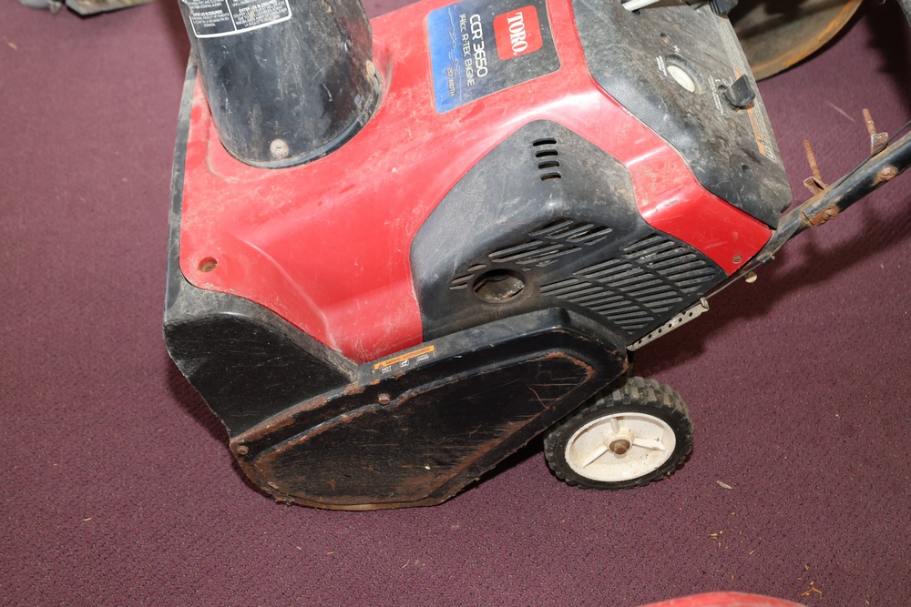 Toro CCR 3650 snow blower equipped with a 141cc engine and a 20-inch clearing width. Seller reports: for parts or repair.