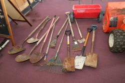 Landscaping tools including shovels, rakes, Earthway spreader, finishing rakes, etc.