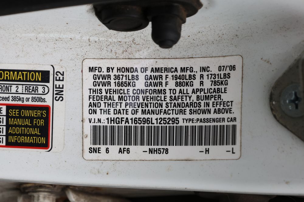 2006 Honda Civic VIN: 1HGFA16596L125295. Odometer reading: 243975. Seller Reports: BODY DAMAGE & RUST. Title and key available. Must Be Towed.