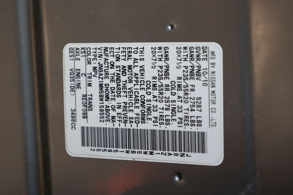 2011 Nissan Murano LE AWD. VIN: JN8AZ1MW5BW159552. Odometer reading: 307,213. Engine: 3.5L V6 DOHC 24V gasoline. Transmission: Automatic. Exterior: Brown. Interior: Beige leather, touchscreen display, navigation, dual-zone climate control, push-button start, multifunction steering wheel. Tire Size: P235/55R20. Seating: 5 passengers. Seller reports: Has bad transmission. Has brand new tires, brakes. Title and key available. Does not drive, transmission issues. Ran when parked, unable to start on the day of photography. May have dead battery at time of pickup. Must Be Towed.