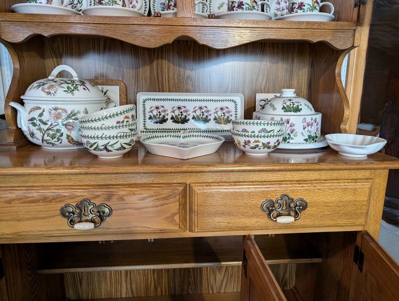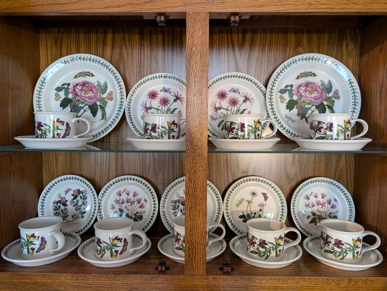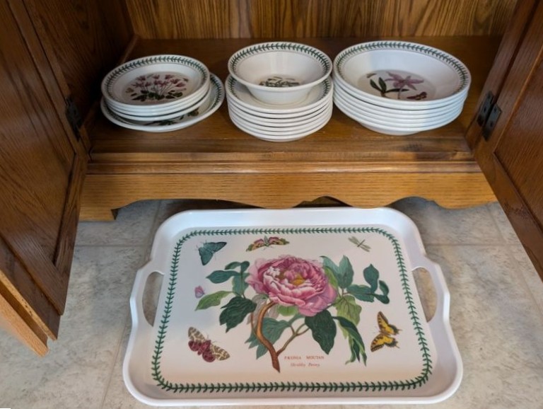 Botanic Garden Dish Set. Large collection of dishes with serving pieces "Botanic Garden", over 60 pcs, incl resin serving tray. See photos for details. Furniture seen in photos not incl.