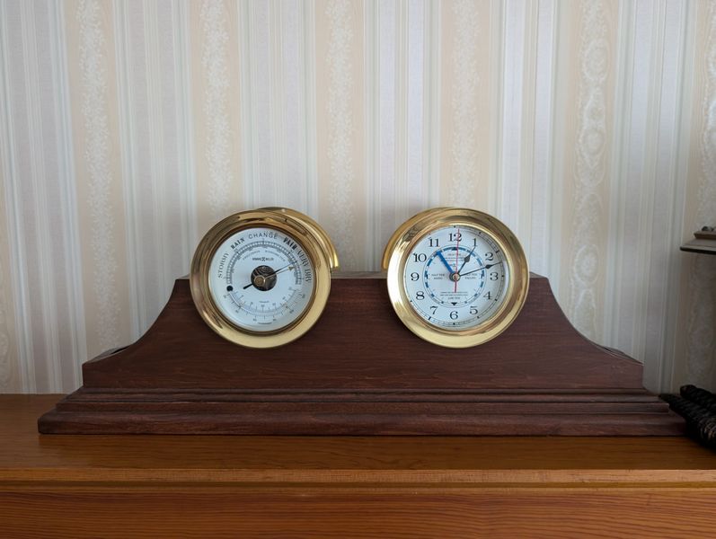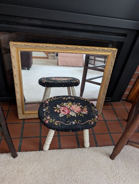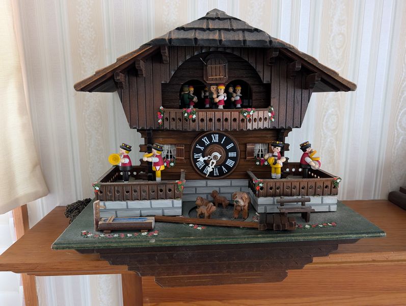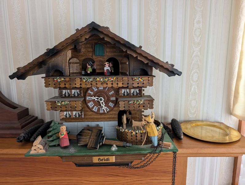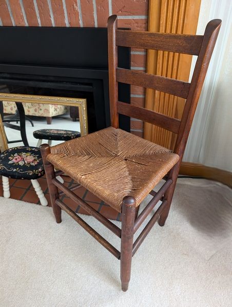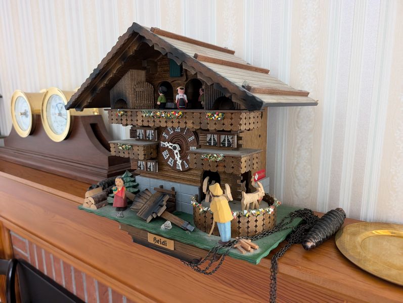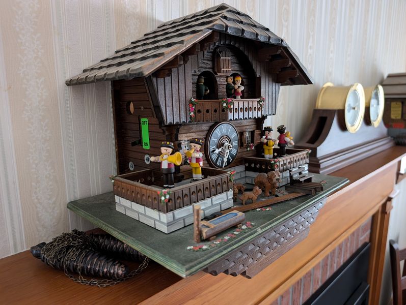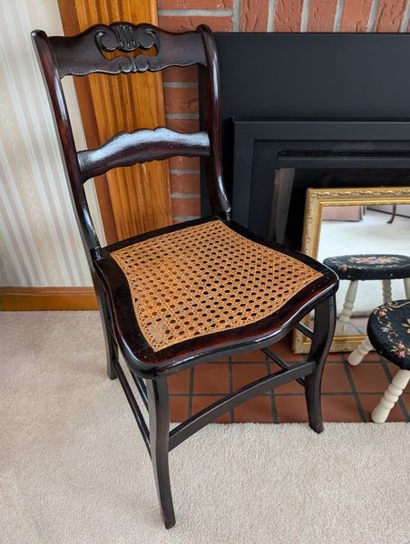 German Clocks; Small Furniture. Two ornate German clocks, ea. approx. 14"Wx9"Dx1'H; wood mantle barometer; two vintage side chairs (one cane seat, one rush seat); wall mirror, 23"Wx19"H in gilt frame.