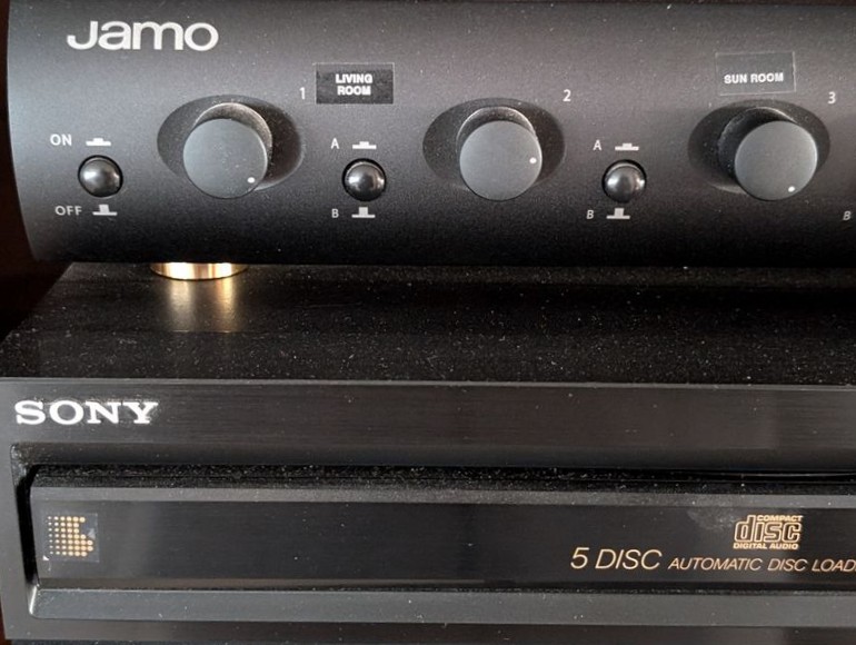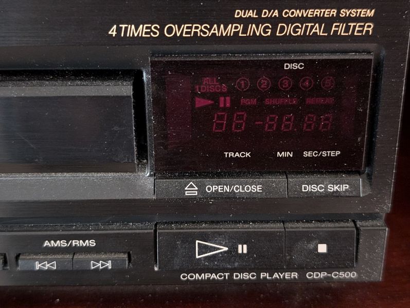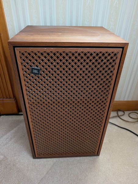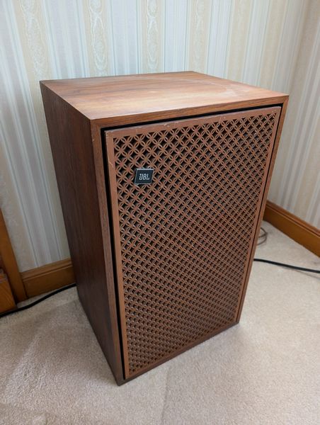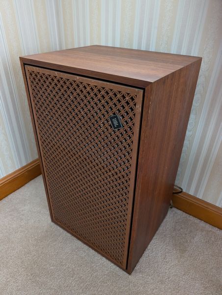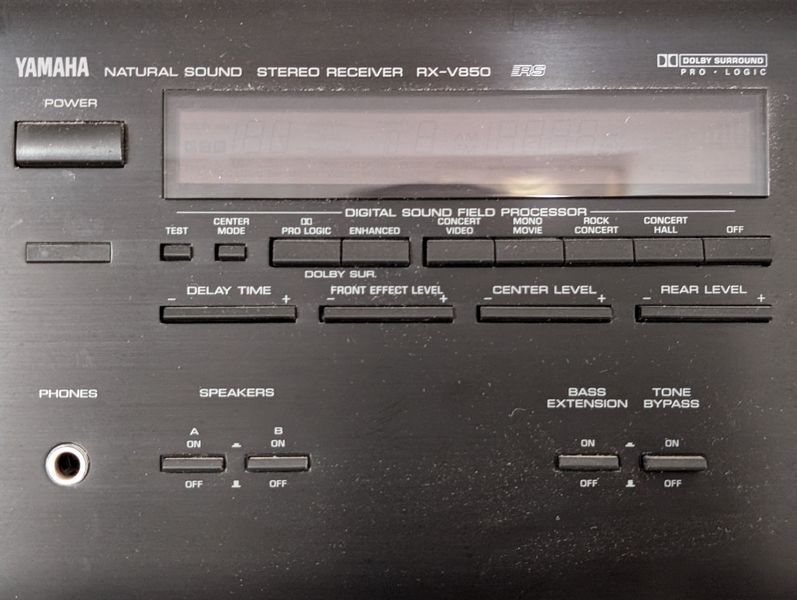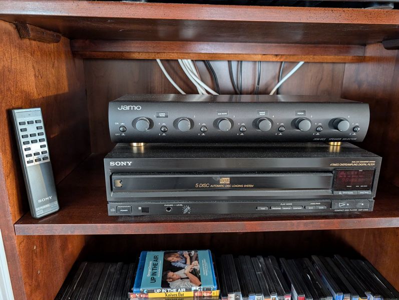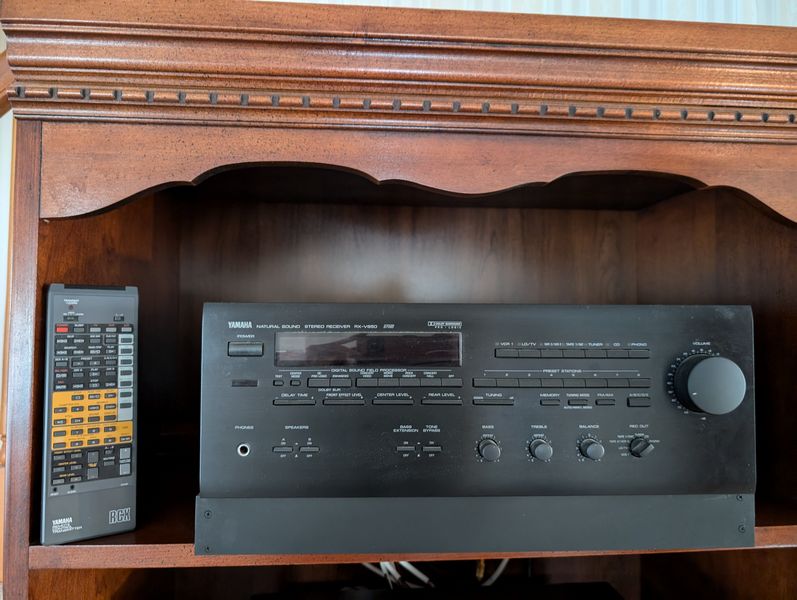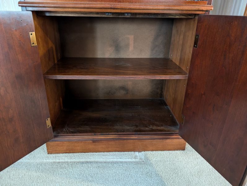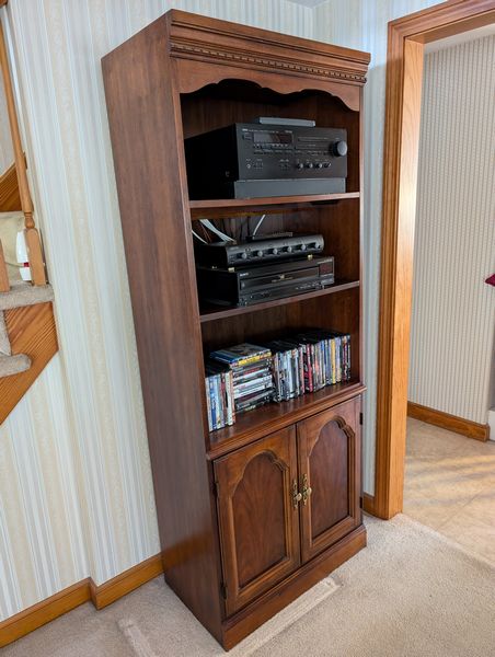 Entertainment Cabinet, Speaker, Electronics. Narrow ent cab with crown molding,30"Wx16"Dx76.5"H with three shelves & storage below; pr Lancer speakers, ea. 14"Wx1'Dx23.5"H; electronics incl: Jamo; Sony disc player; Yamaha receiver; 4-doz movies. See photos for more details.