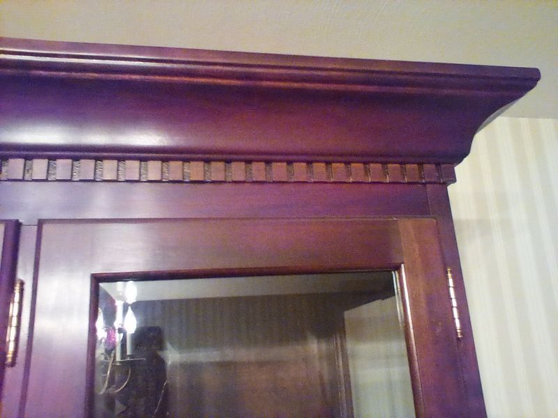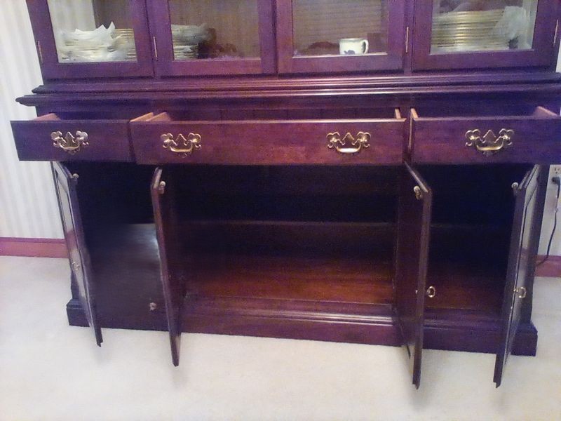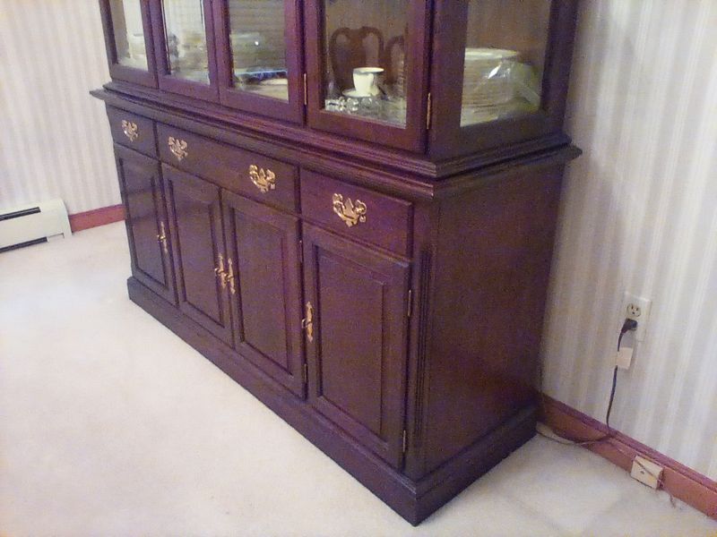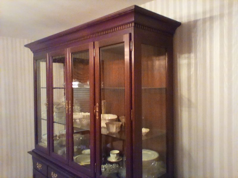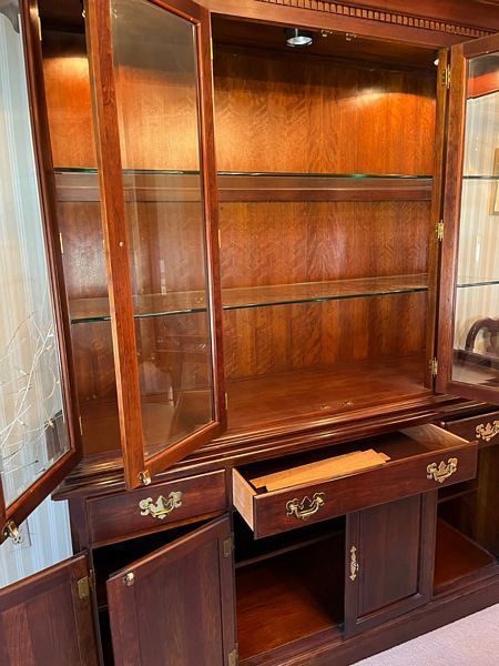 Cherry Two-Piece China Hutch. Formal glass front & sides lights China cab with crown molding, 64"Wx20"Dx33"H (bottom) plus 62"Wx18"Dx47"H (top). Has 1/2" think glass shelves with plate grooves. See photos for more details. Matches buffet in lot #14 and table in lot #15.