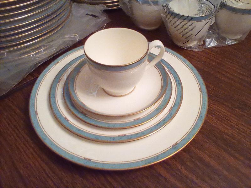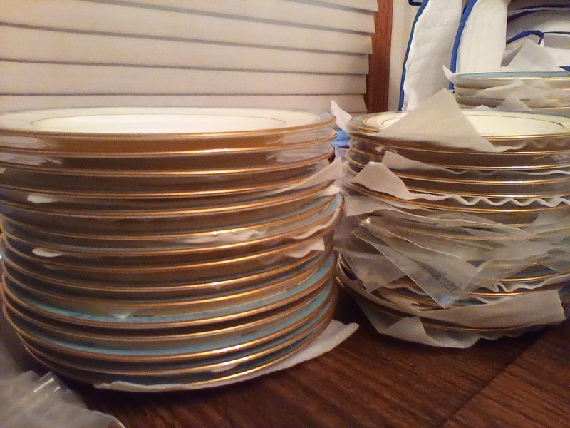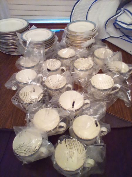 Pfaltzgraff "Patina" Dish Set. Pfaltzgraff 5-pc, serv/16 dish set, incl: 11" dinner dish; luncheon plate; bread dish; cup; saucer with China storage containers. See photos for pattern design. Most appear unused.