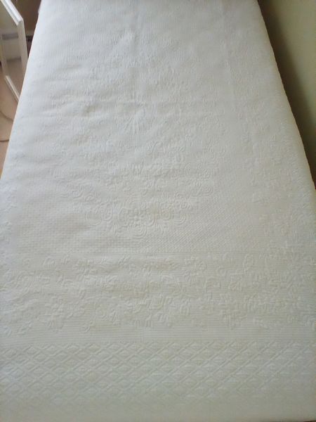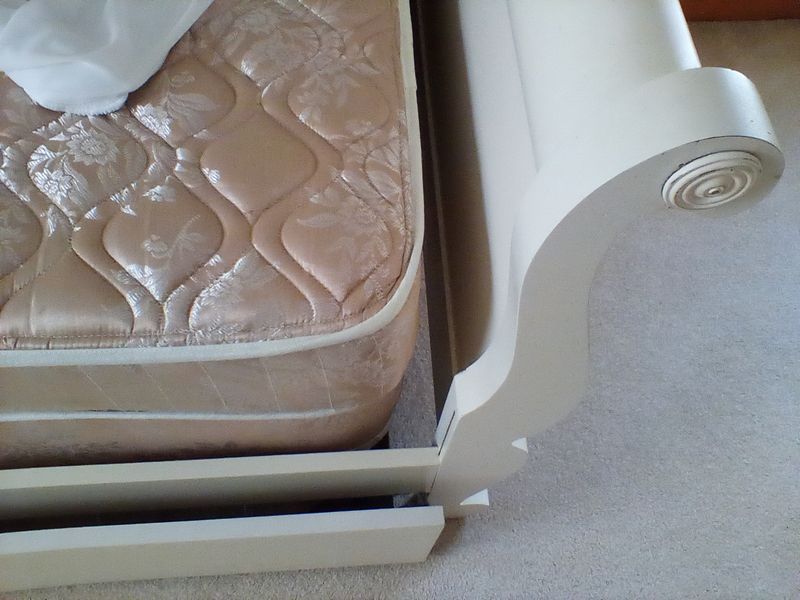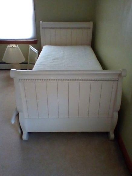 White Trundle Day Bed, Mirror, Lamp. White sleigh-style trundle bed with two opt mattresses & quilt, 83"Lx40"Wx35"H; white wall mirror, 19"Wx23"H; table lamp with shade. Loc on 2nd fl.