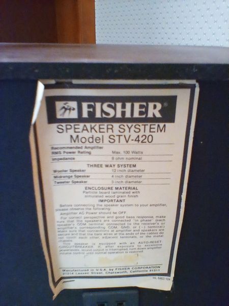 Two Sets of Speakers, featuring Fisher. Pr Fisher speakers #STV-420, each 14"Wx13"Dx30"H; pr AVID #60, each 8"Wx8"Dx28"H.