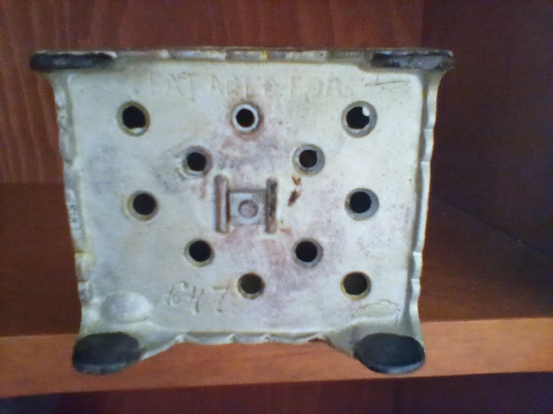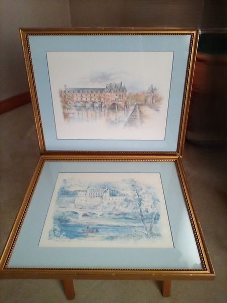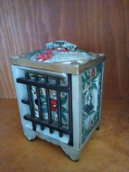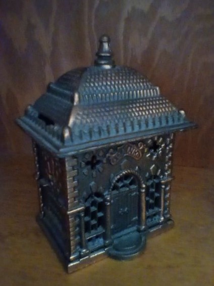 Antique Banks, Wall Art. Three antique iron banks, approx. 5"H; set of 2 sign framed wall art, matted & behind glass, each 19"Wx17"H; stuffed bear with glasses in chair. See photos for details.