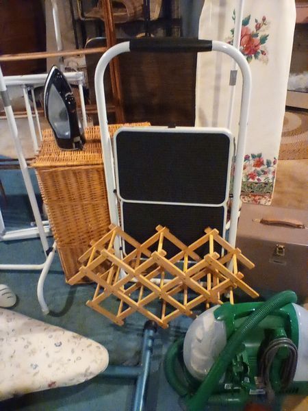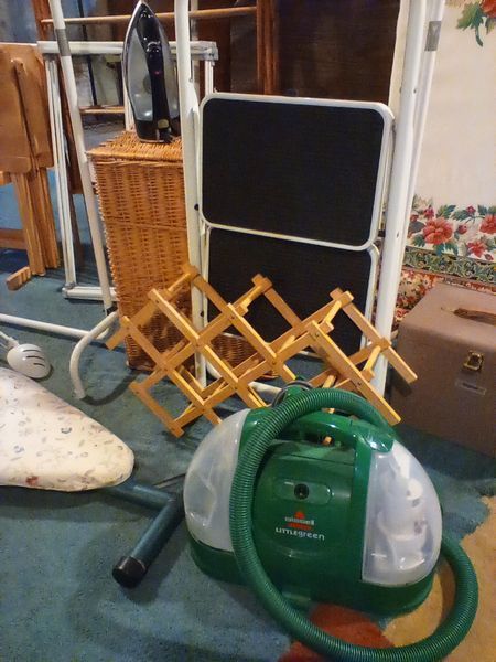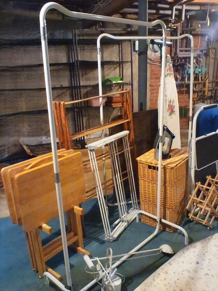 Household Functional, featuring Bissell Steamer. Two clothing racks; (3) snack tables in rack; (2) folding laundry racks; folding card table; wine rack; wicker laundry basket; (2) ironing boards; Hamilton iron; Bissell carpet steamer; port metal file box. Loc in basement. Items seen in background not incl.