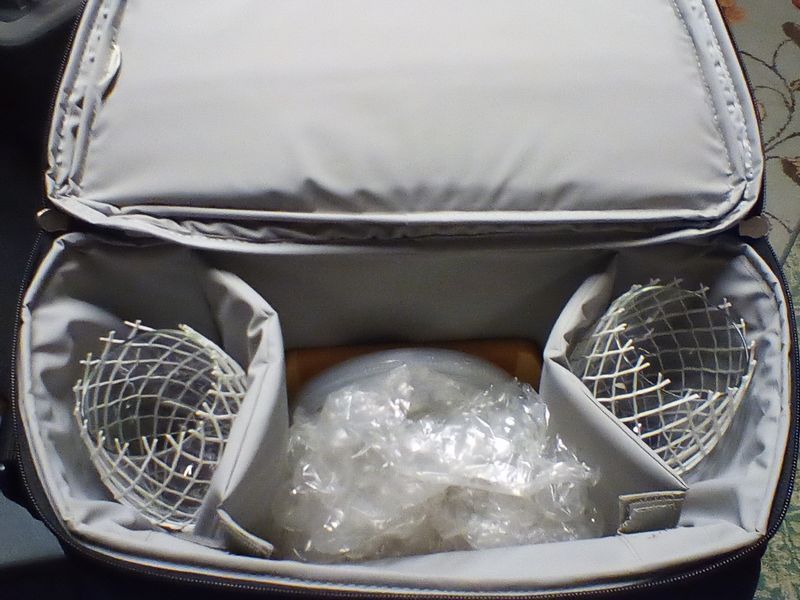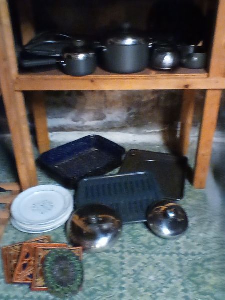 Cookware and Kitchen Items. Assort pots & pans with lids, incl very lg steamer pot with lid; Calaway travel bag with contents. See photos for details of items incl. Loc in basement. Shelving not incl.