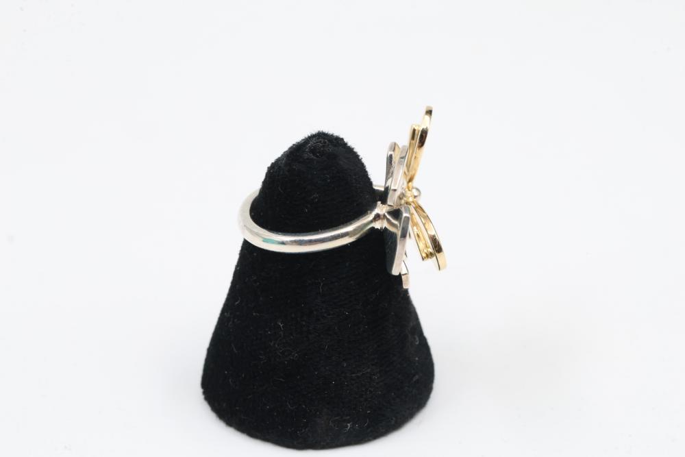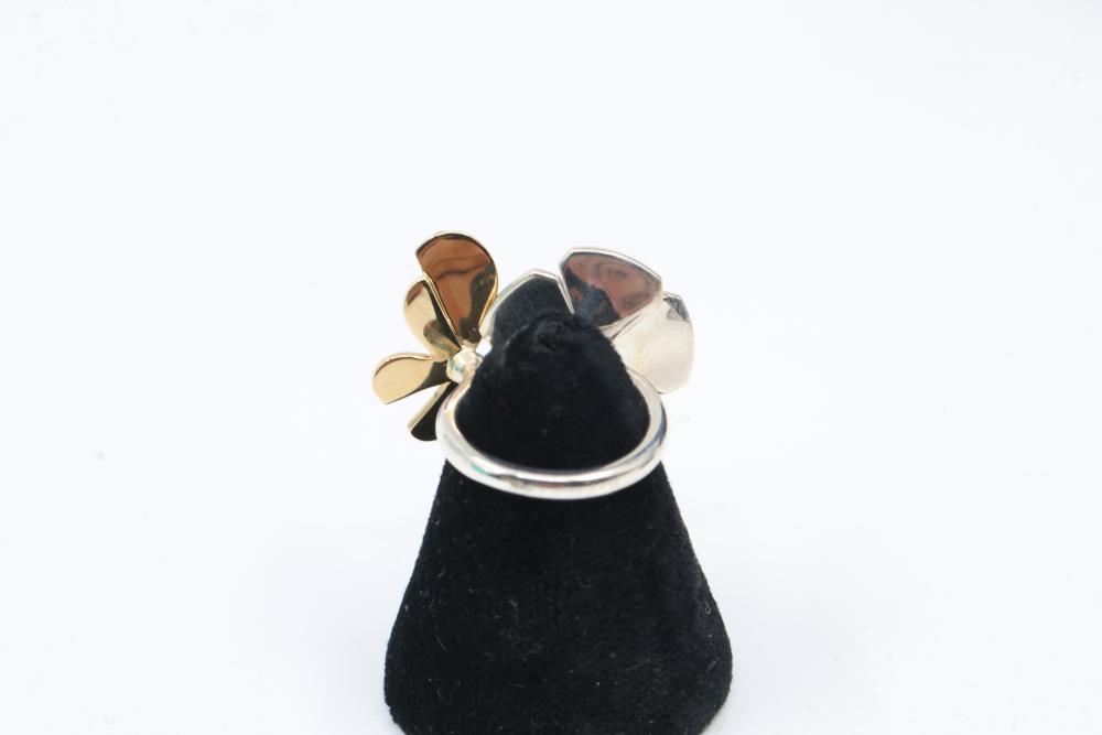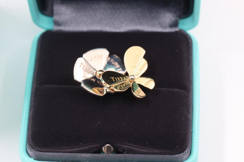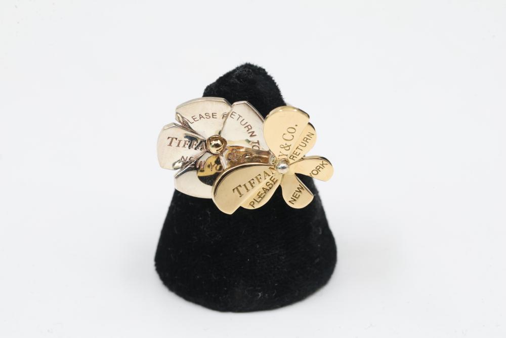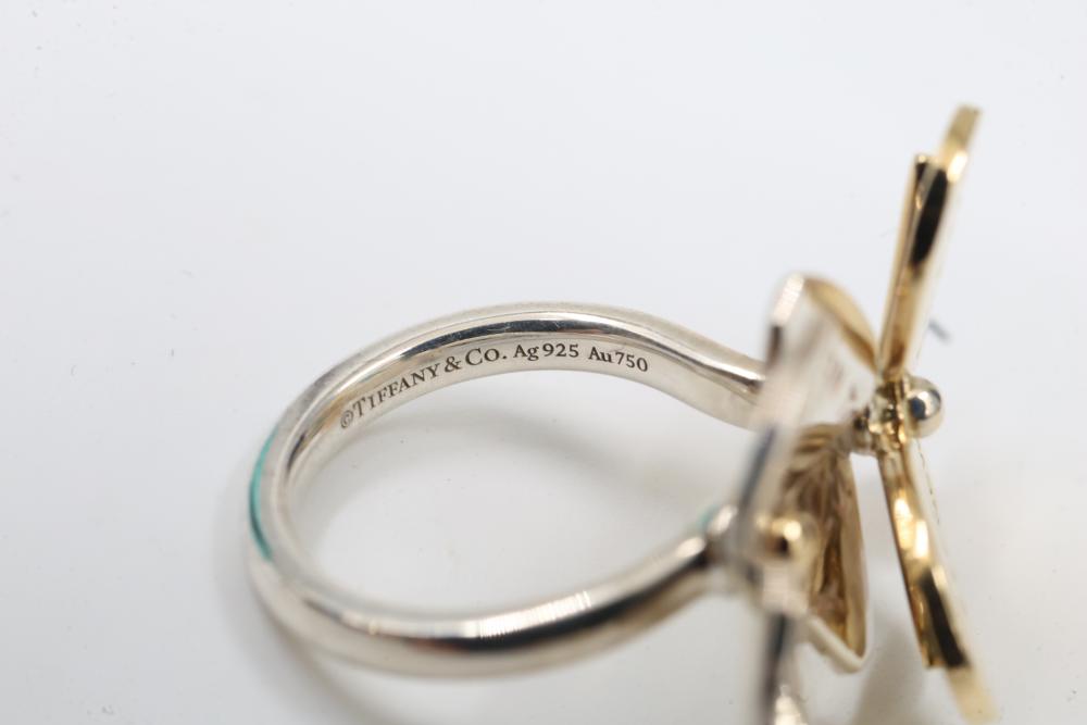 New Tiffany & Co. Sterling Silver and 18k Gold Love Bug Butterfly Flower Cluster Ring. Features a floral design with petals engraved with the Tiffany & Co. logo in gold and silver tones. Marked 'Tiffany & Co.' and '925' on the inner band. Includes original Tiffany & Co. jewelry box. Size 4. Total weight being 7.7 grams. Retail value of $1,750.