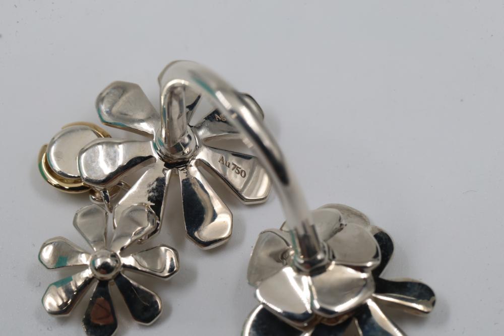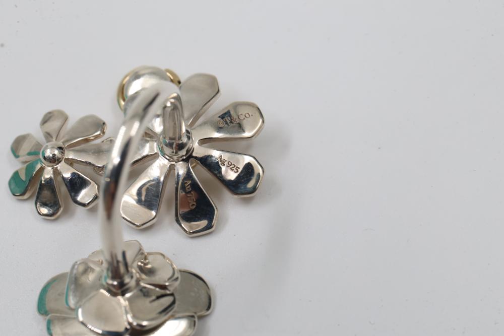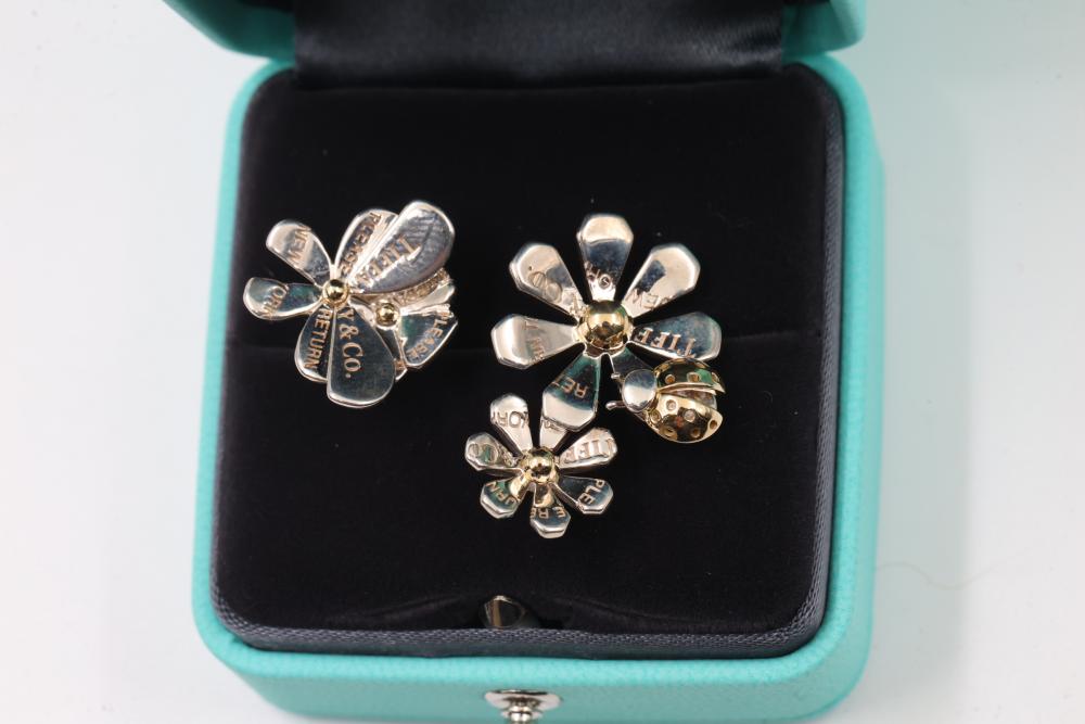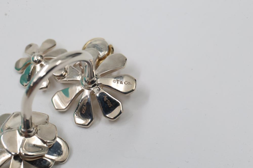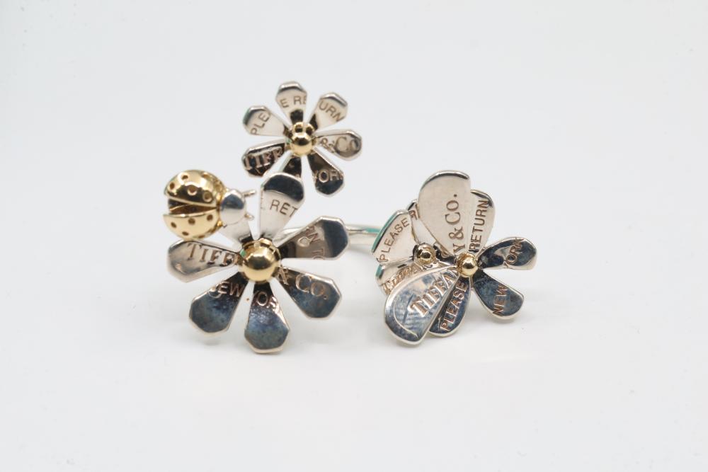 New Tiffany & Co. Sterling Silver and 18K Yellow Gold Flower Ring featuring floral motifs with 'Tiffany & Co.' hallmark and '.925' stamp. Includes original Tiffany & Co. box. Size 5. Total weight being 11 grams. Retail value of $1,750.