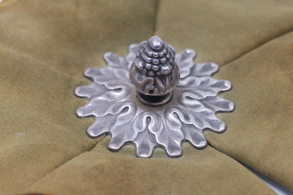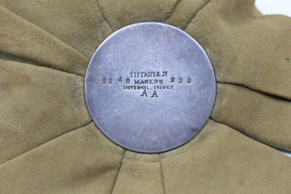 Tiffany & Co. Sterling Silver Dish and Pincushion Set. The dish features scalloped edges, marked 'Tiffany & Co. 15411 Makers 7113 Sterling Silver 925-1000,' and includes engraved details. The pincushion consists of fabric with a silver-tone finial marked 'Tiffany & Co. 8240 Makers 220 Silver-Soldered.' Total weight of sterling silver being 100 grams.